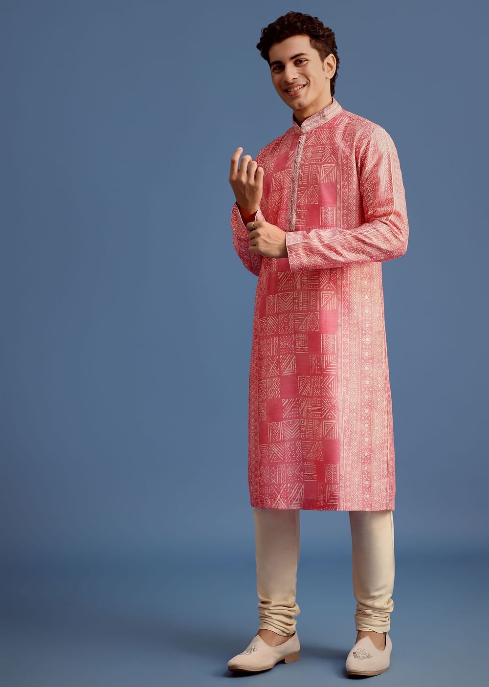Embrace elegance and style with this onion pink kurta and pant set. Tailored from rich chanderi jacquard the kurta boasts of all over printed motifs. The front placket refined mandarin collar and full sleeves add to its design. Paired with coordinating bottoms consider this ensemble an apt pick for festive family gatherings. Awarded as the Most Trusted Brand, we're delivering styles you love, just as promised.