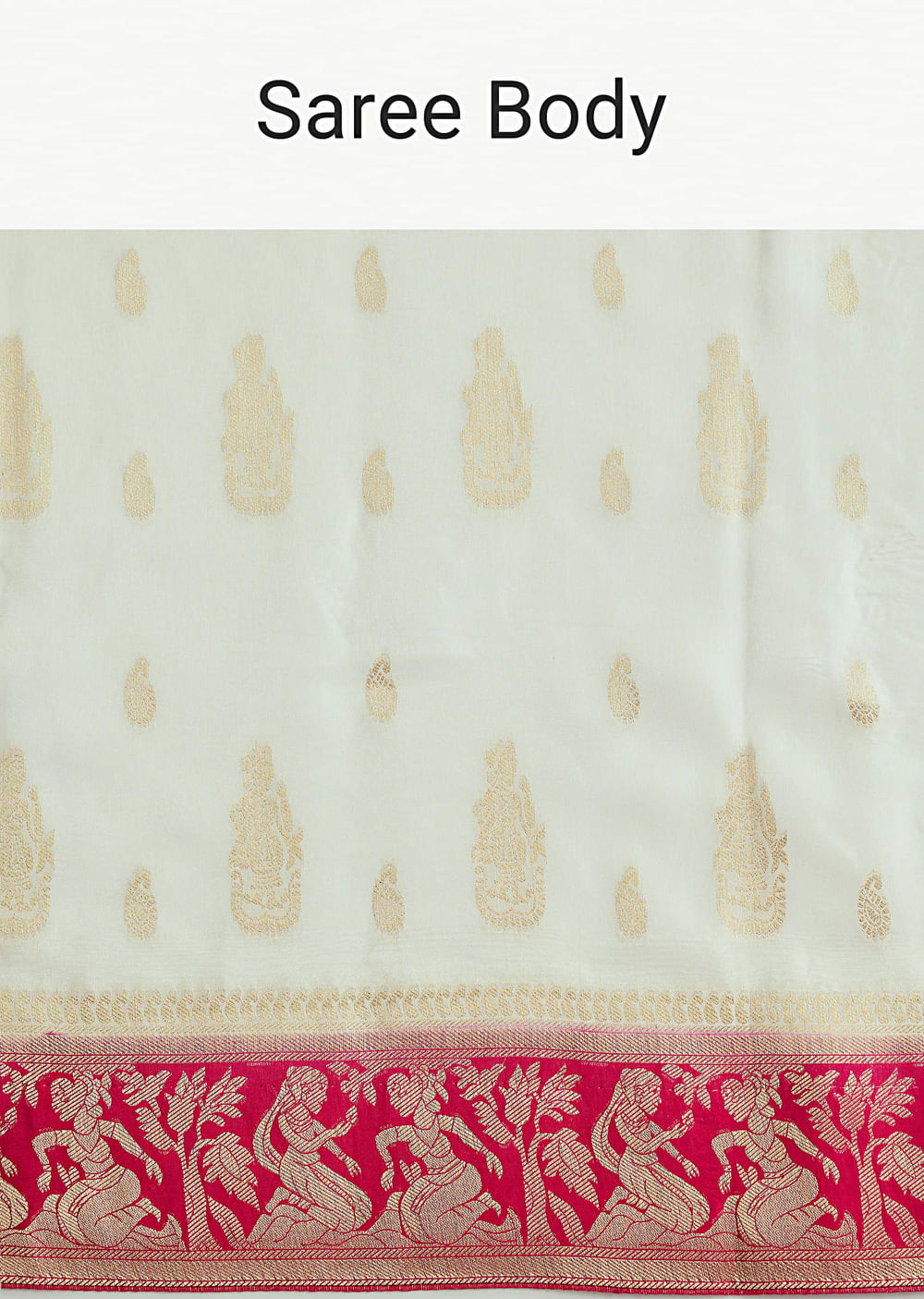 Beautiful in contrast, this pink silk woven saree sets an off white base against a rani pink border and pallu woven with tiny human figures that feel story-rich. Gentle brocade... More Product Details