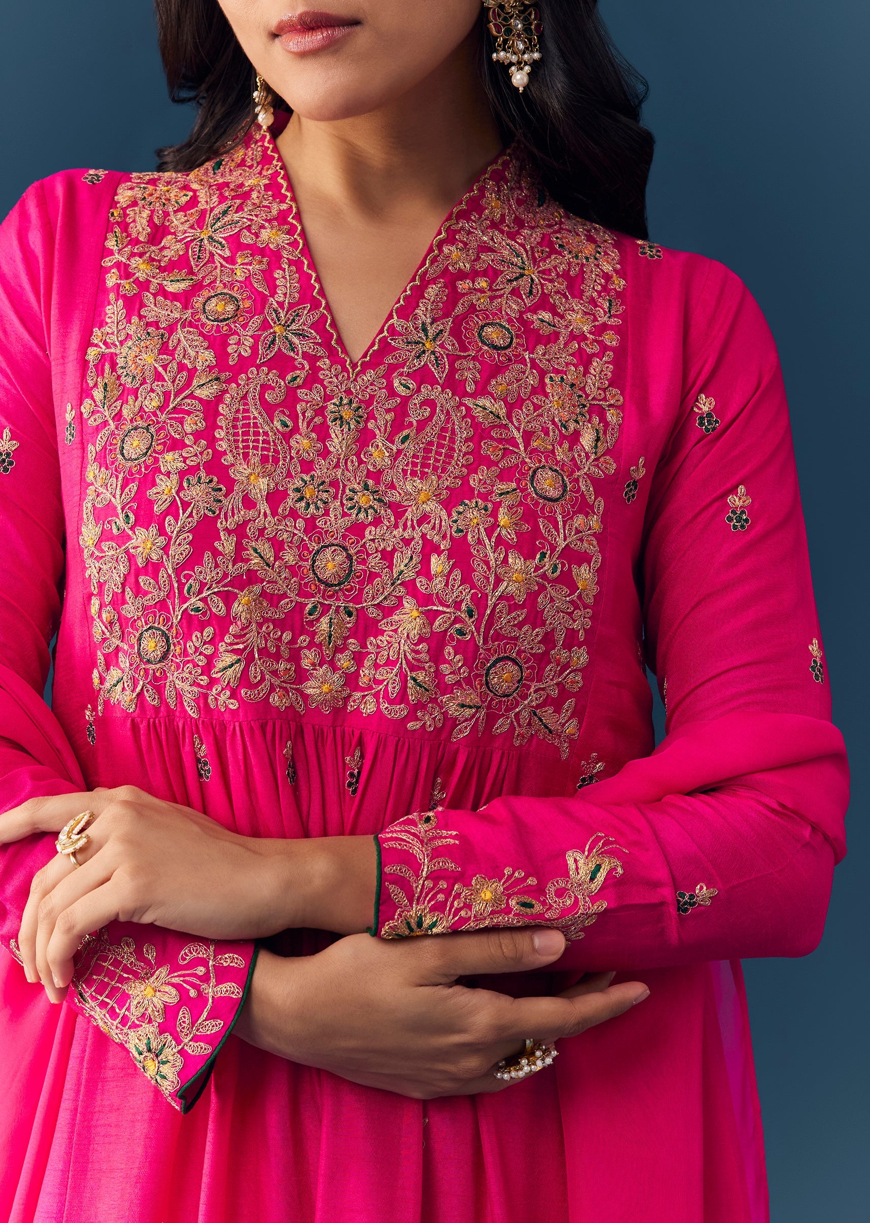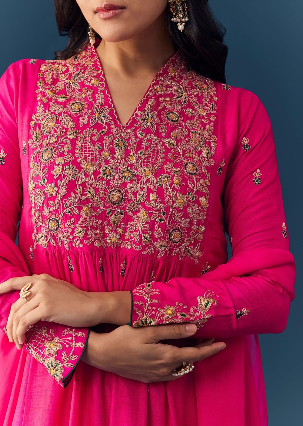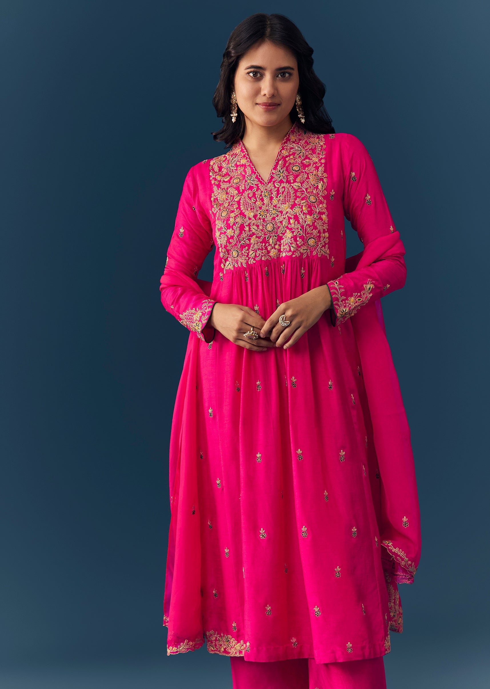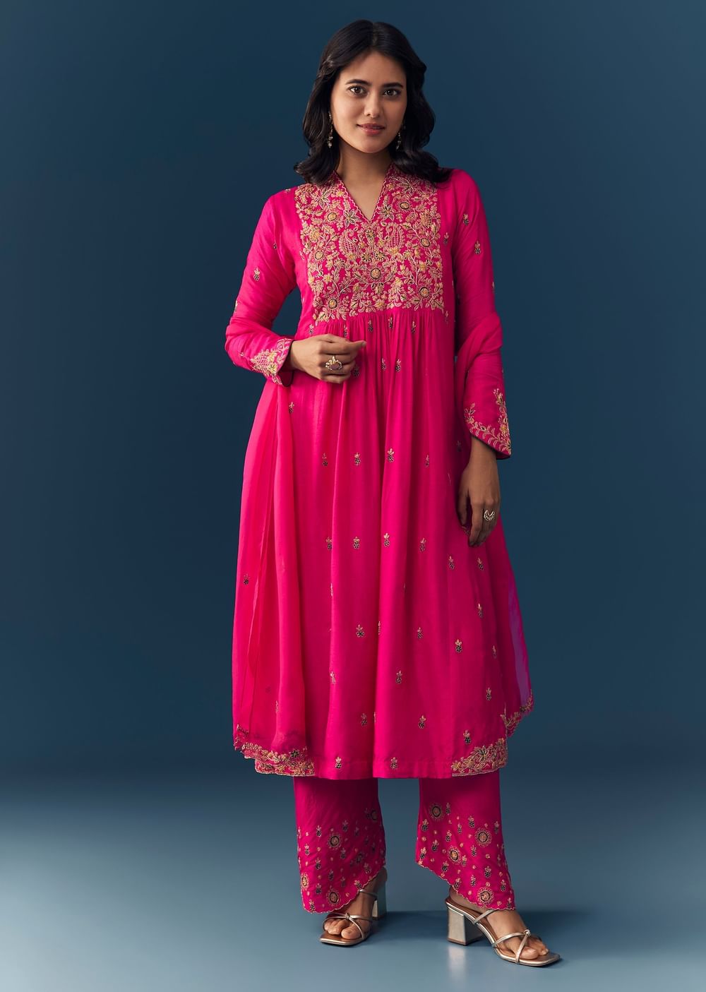 Step into festive moments with confidence in this pink Anarkali, shimmering with delicate zari work that adds a soft, celebratory glow. The luxurious pink silk pant and dupatta enhance the... More Product Details