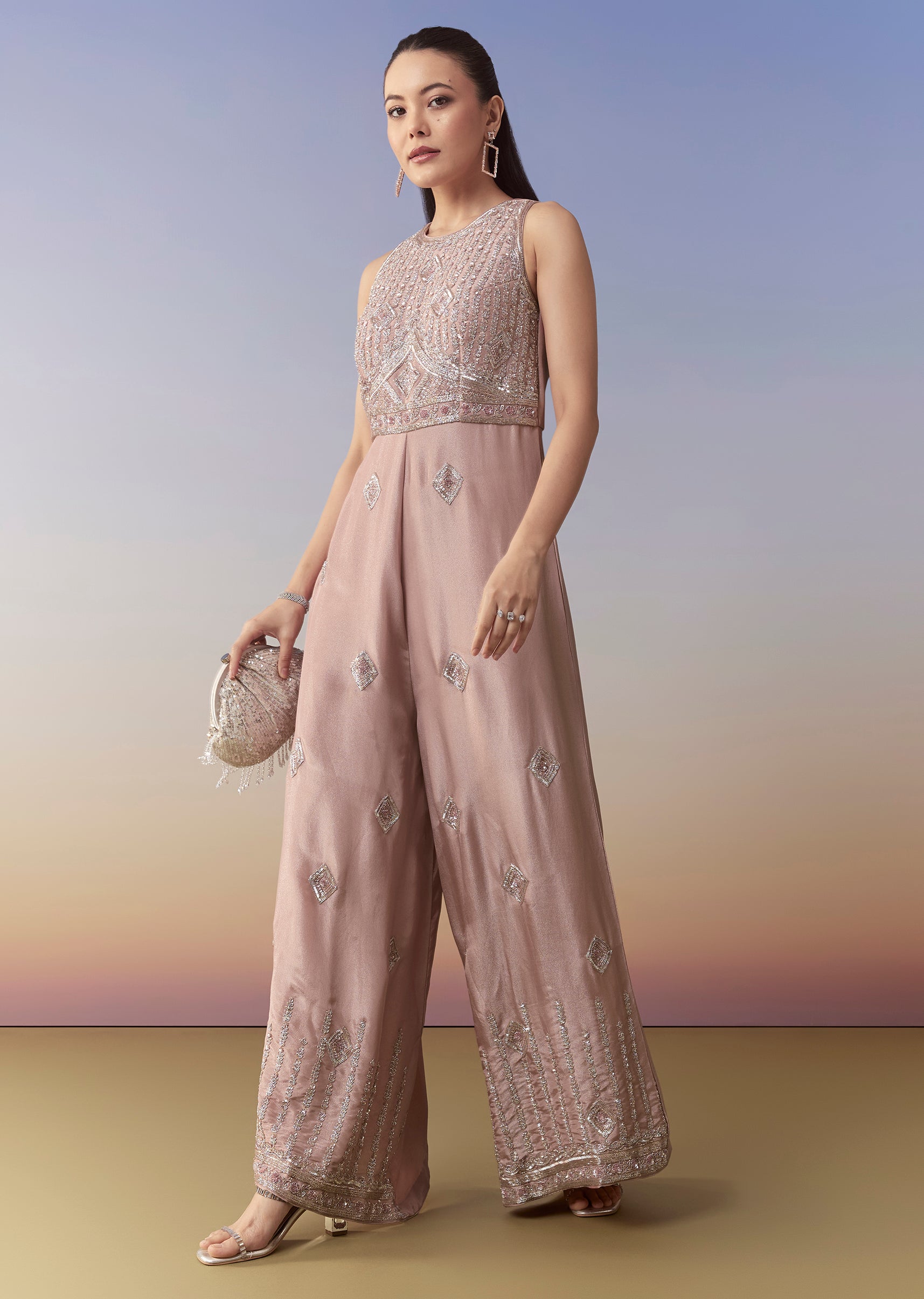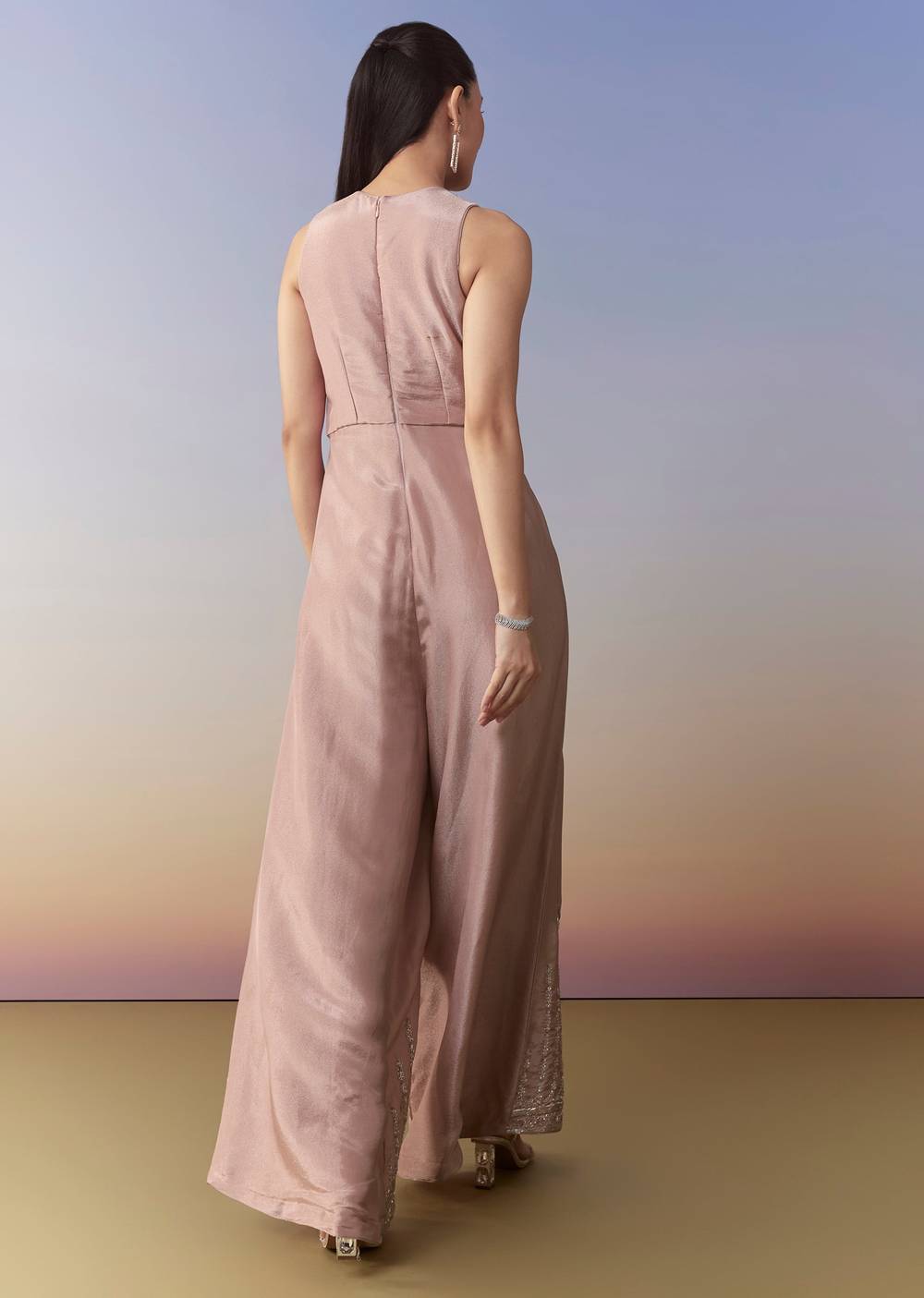 Make a stylish statement with this pink tissue jumpsuit, adorned with delicate sequins and cutdana work that adds a soft shimmer and festive charm. The lightweight tissue fabric offers a... More Product Details