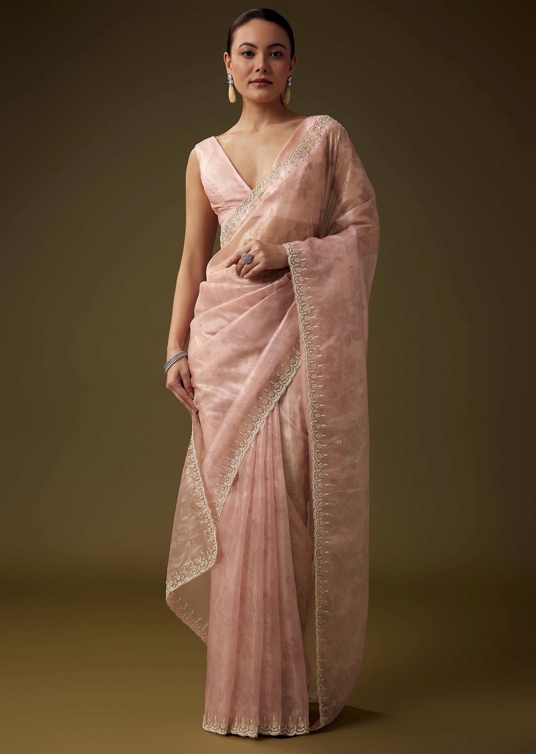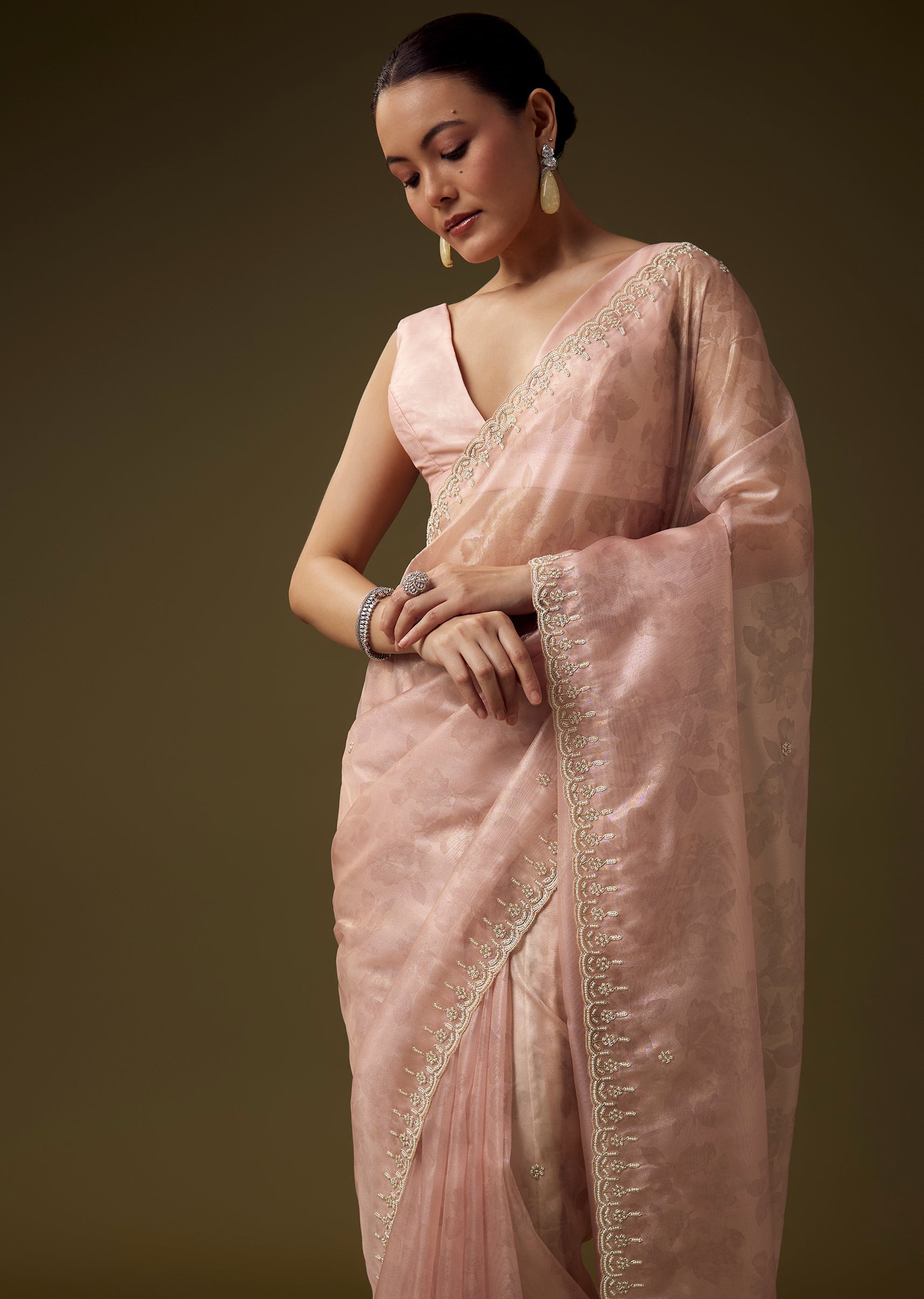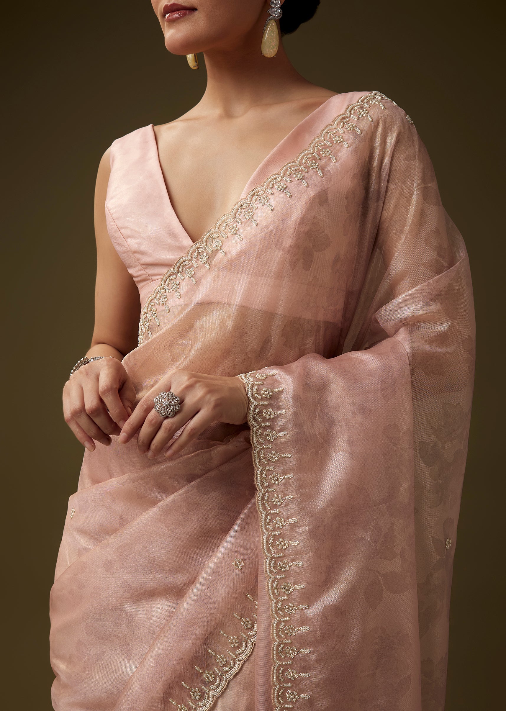 Indulge in soft festive elegance with this tissue saree featuring a beautifully scalloped border adorned with delicate moti embroidery and refined zardosi detailing that adds graceful shimmer. The gentle pink tone enhances its romantic charm, making it a perfect choice for weddings, receptions, and celebratory occasions. The set includes one saree and one unstitched blouse fabric, offering versatile styling options. Awarded as the Most Trusted Brand, we're delivering styles you love, just as promised.