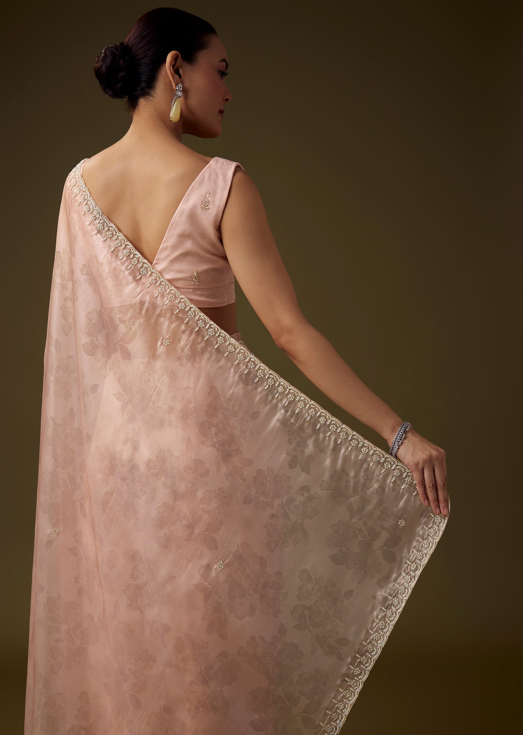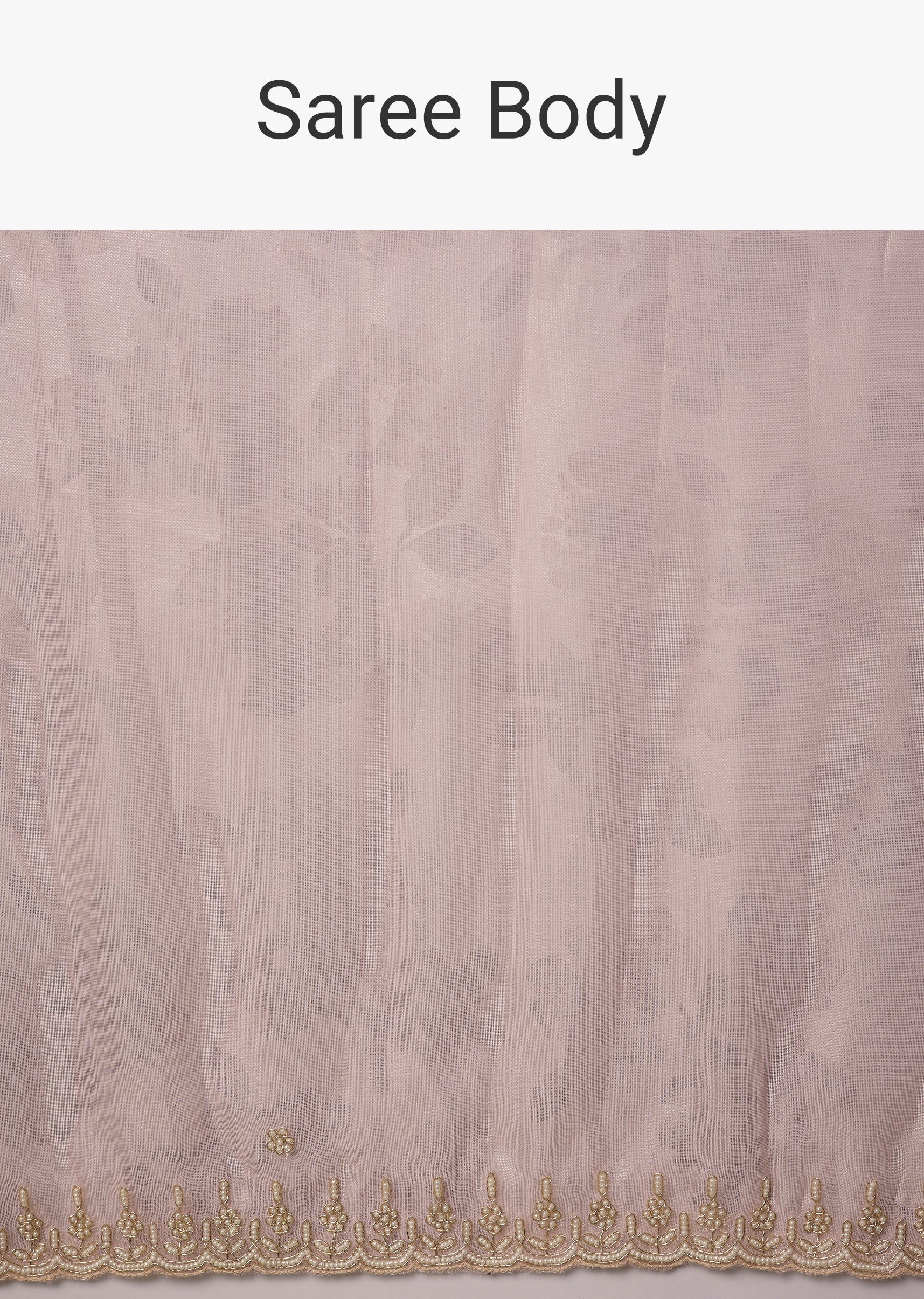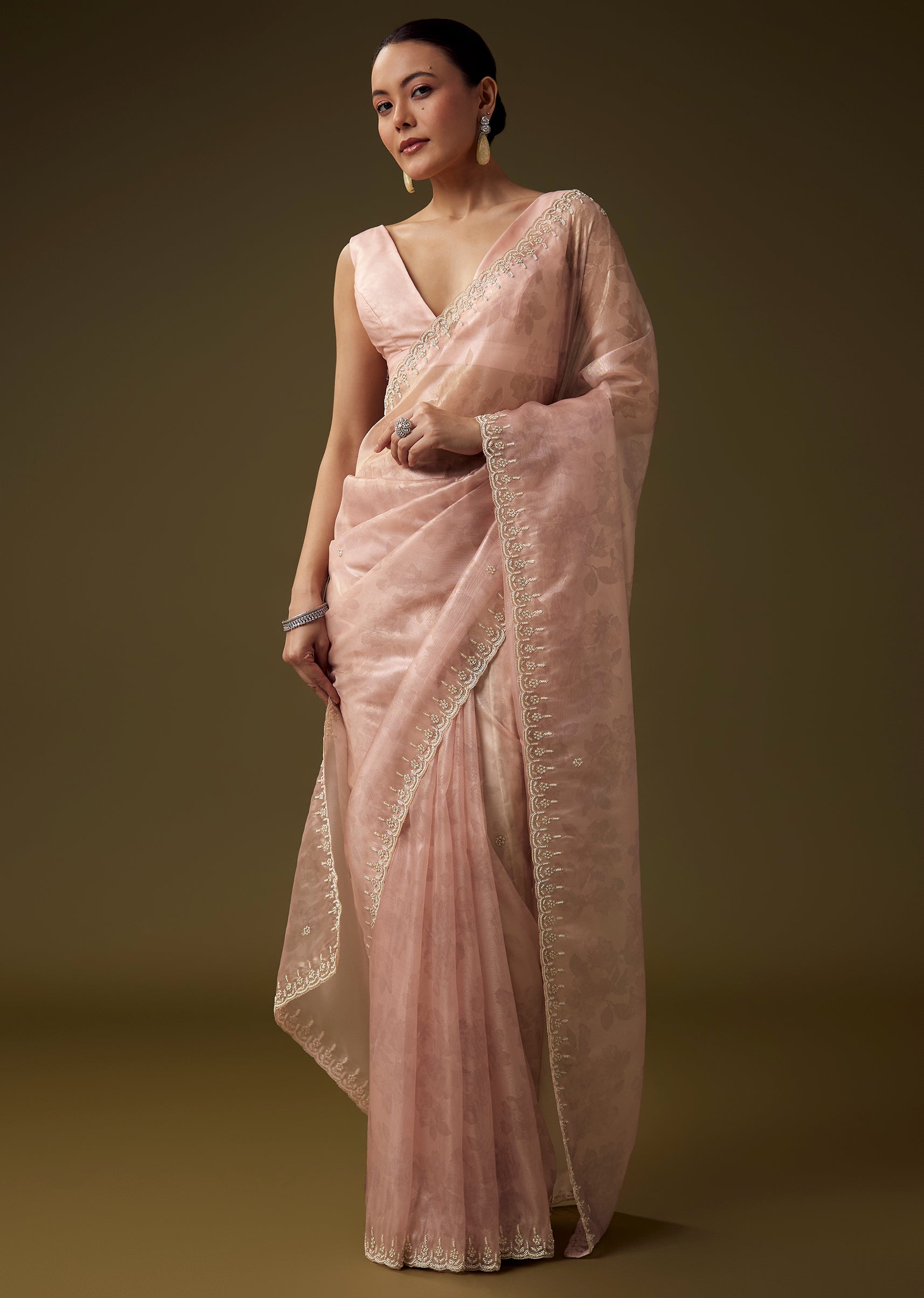 Indulge in soft festive elegance with this tissue saree featuring a beautifully scalloped border adorned with delicate moti embroidery and refined zardosi detailing that adds graceful shimmer. The gentle pink tone enhances its romantic charm, making it a perfect choice for weddings, receptions, and celebratory occasions. The set includes one saree and one unstitched blouse fabric, offering versatile styling options. Awarded as the Most Trusted Brand, we're delivering styles you love, just as promised.