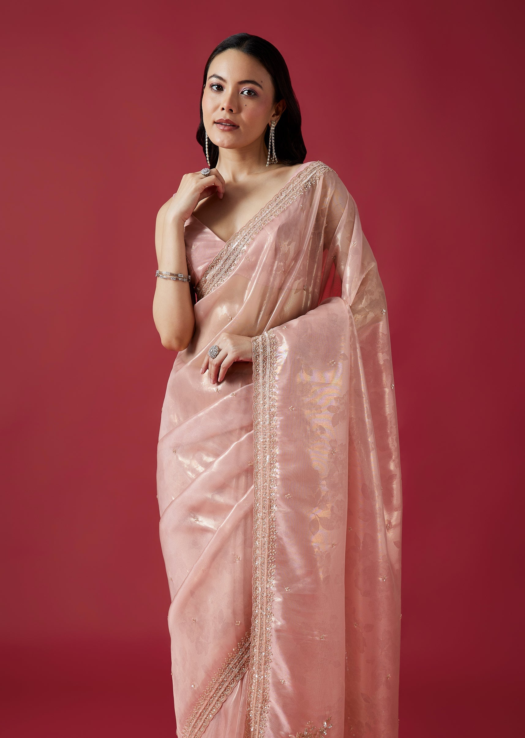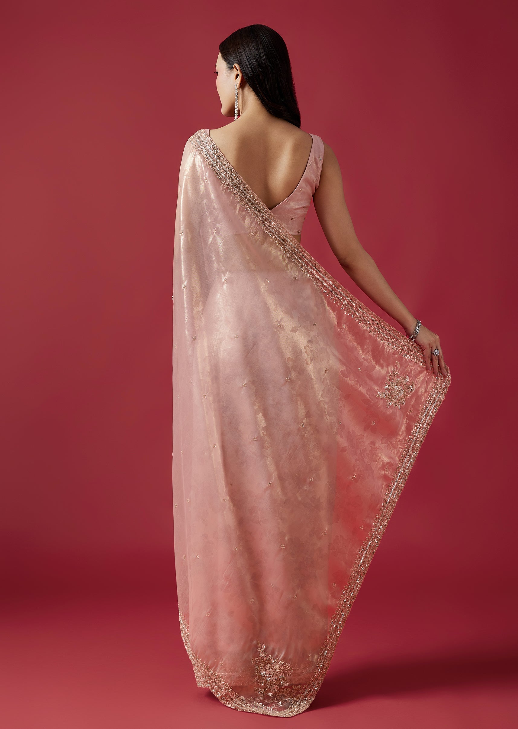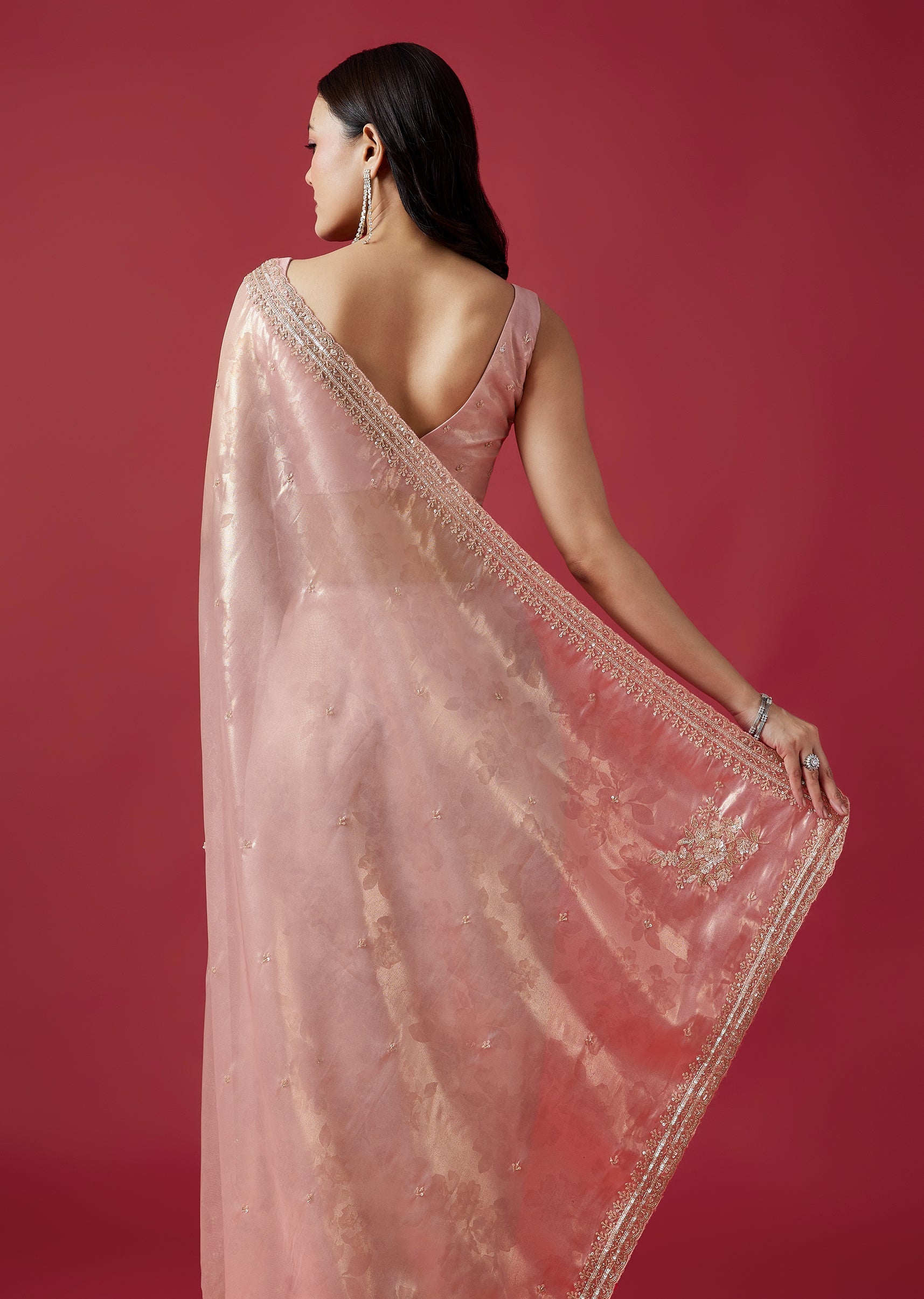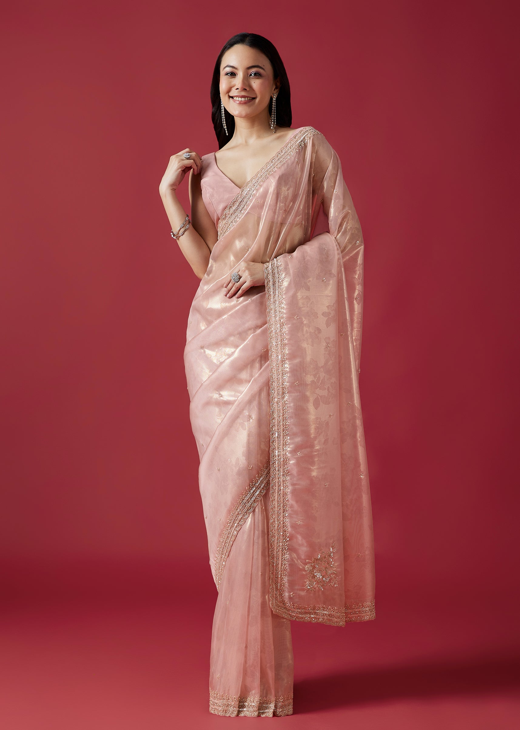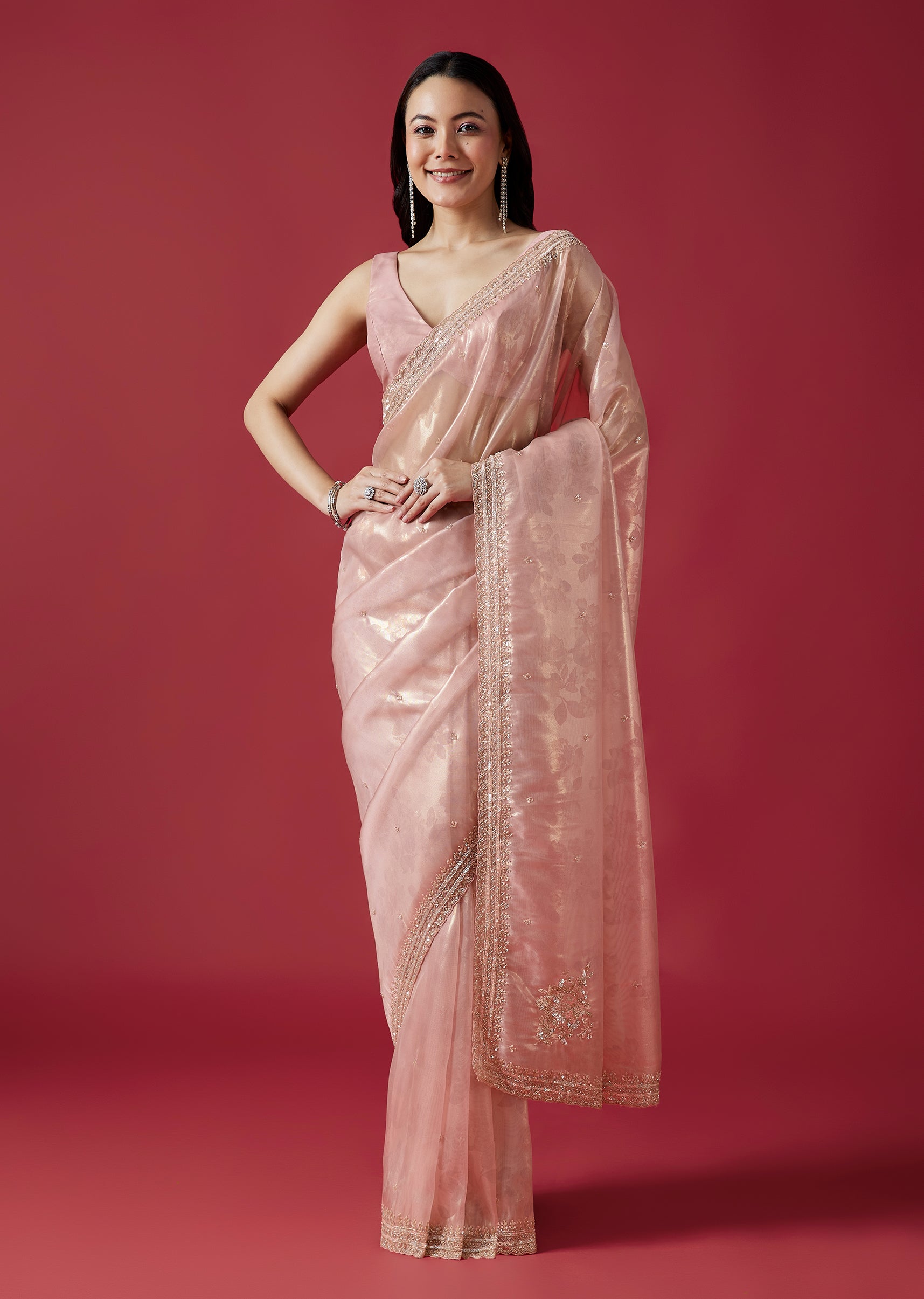 Crafted in delicate pink tissue organza jacquard, this saree features intricate embroidery with cutdana, sequins and beads along a scalloped border. The subtle sheen and refined detailing make it a beautiful choice for festive celebrations. Awarded as the Most Trusted Brand, we're delivering styles you love, just as promised.