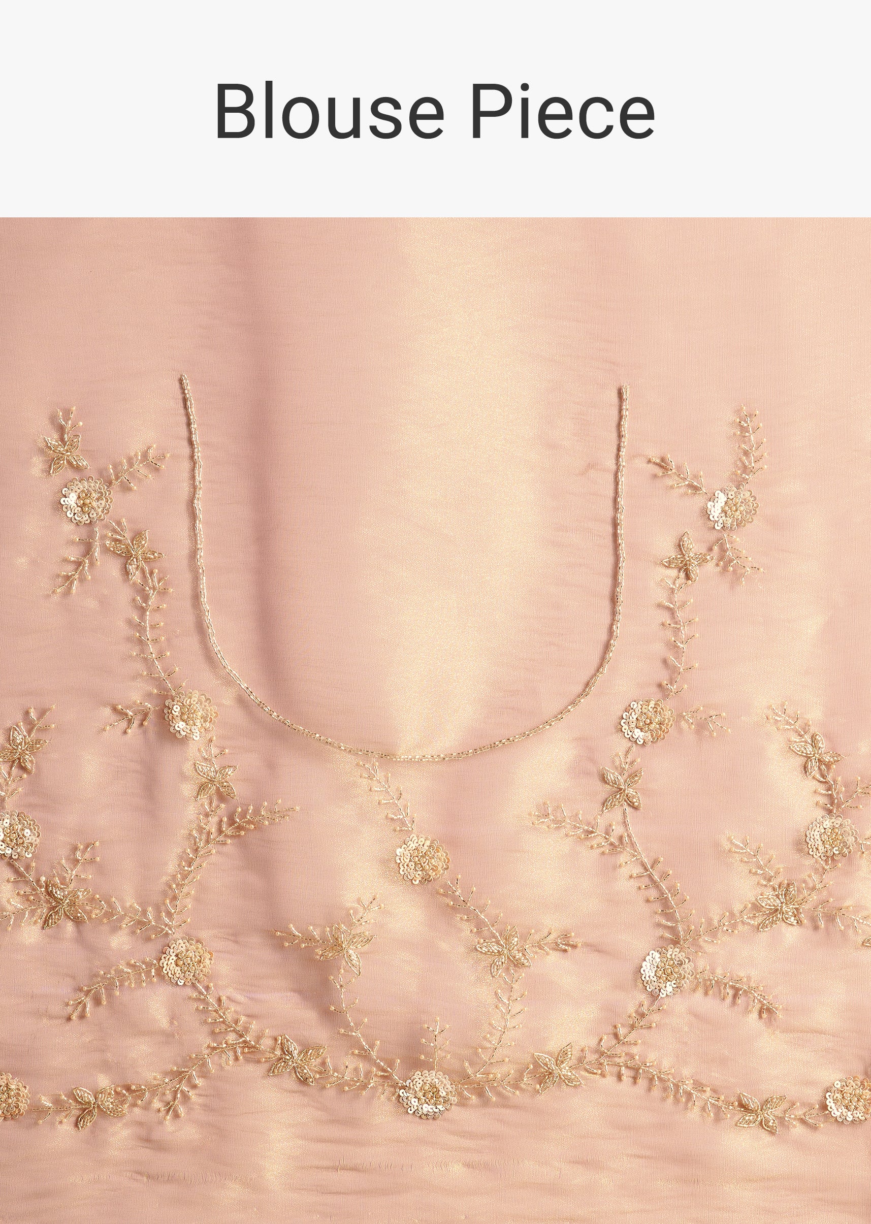 Delicate pink tones add a romantic vibe to this tissue saree. Heavy floral borders are embroidered with buttis, cutdana, sequins, beads, and stones, while the blouse fabric matches with equal... More Product Details