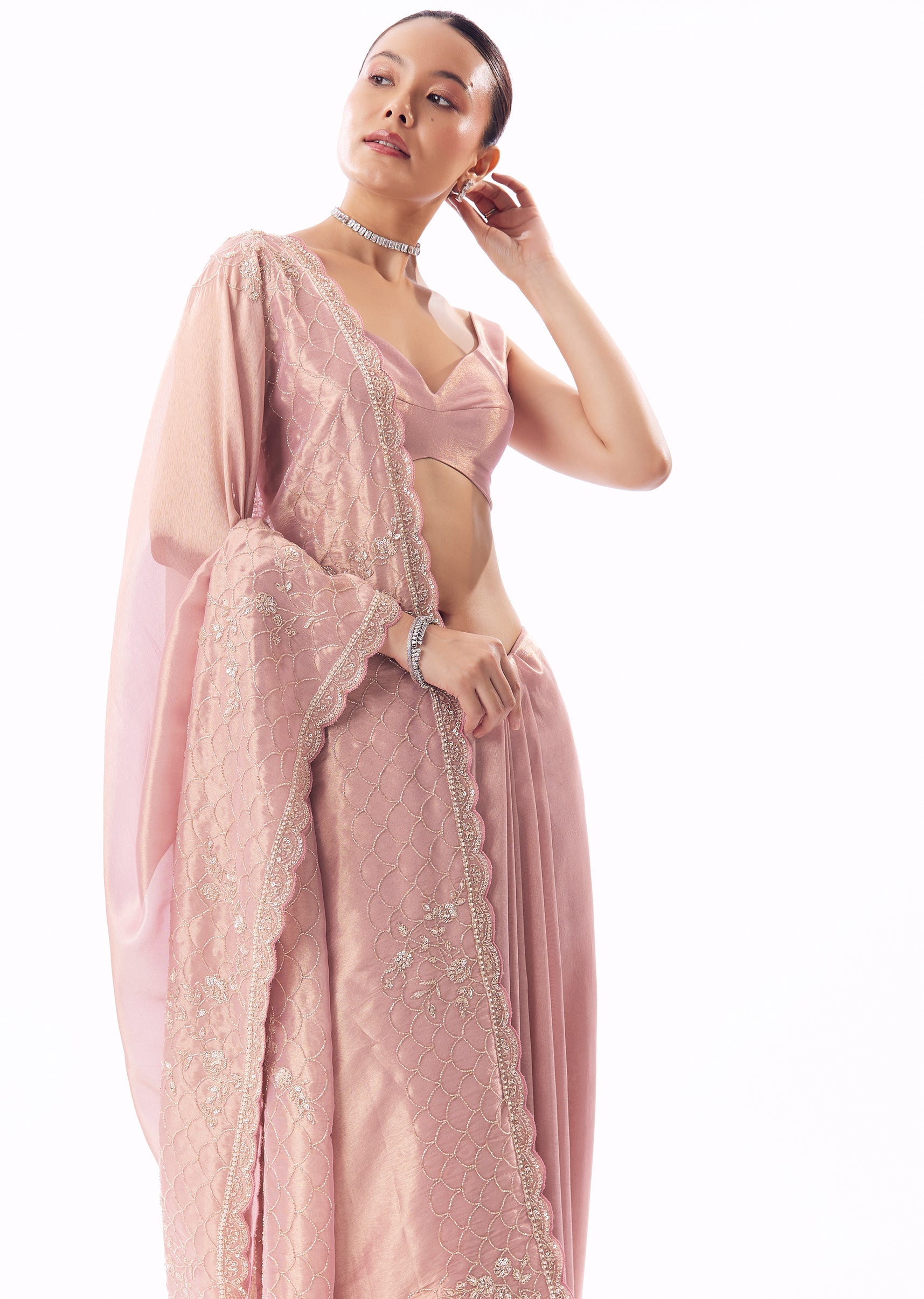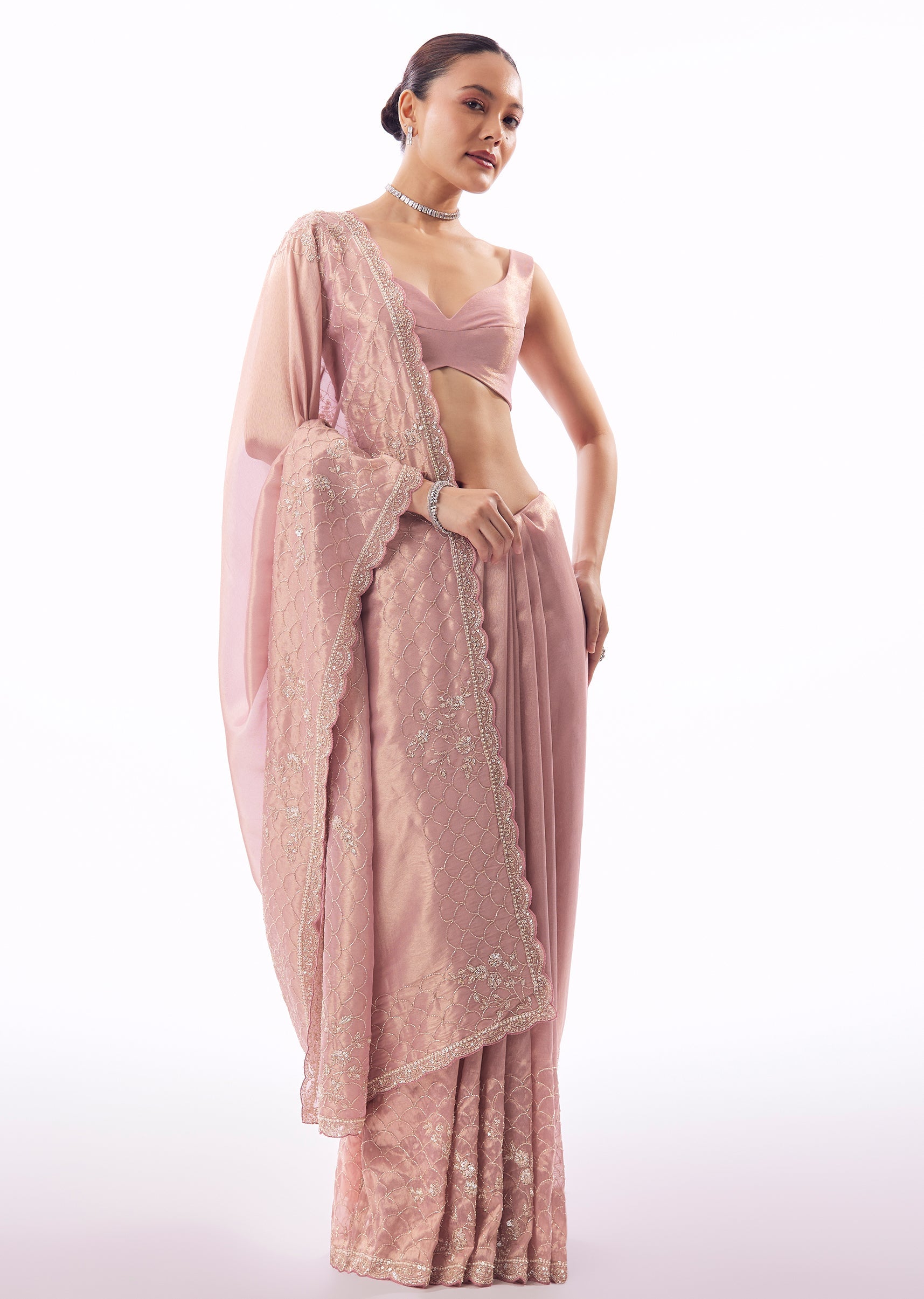 Pink Tissue Saree With Scallop Border And Floral Cutdana Embroidery
