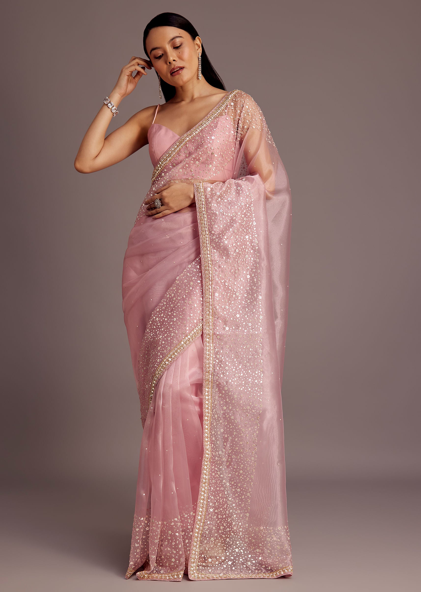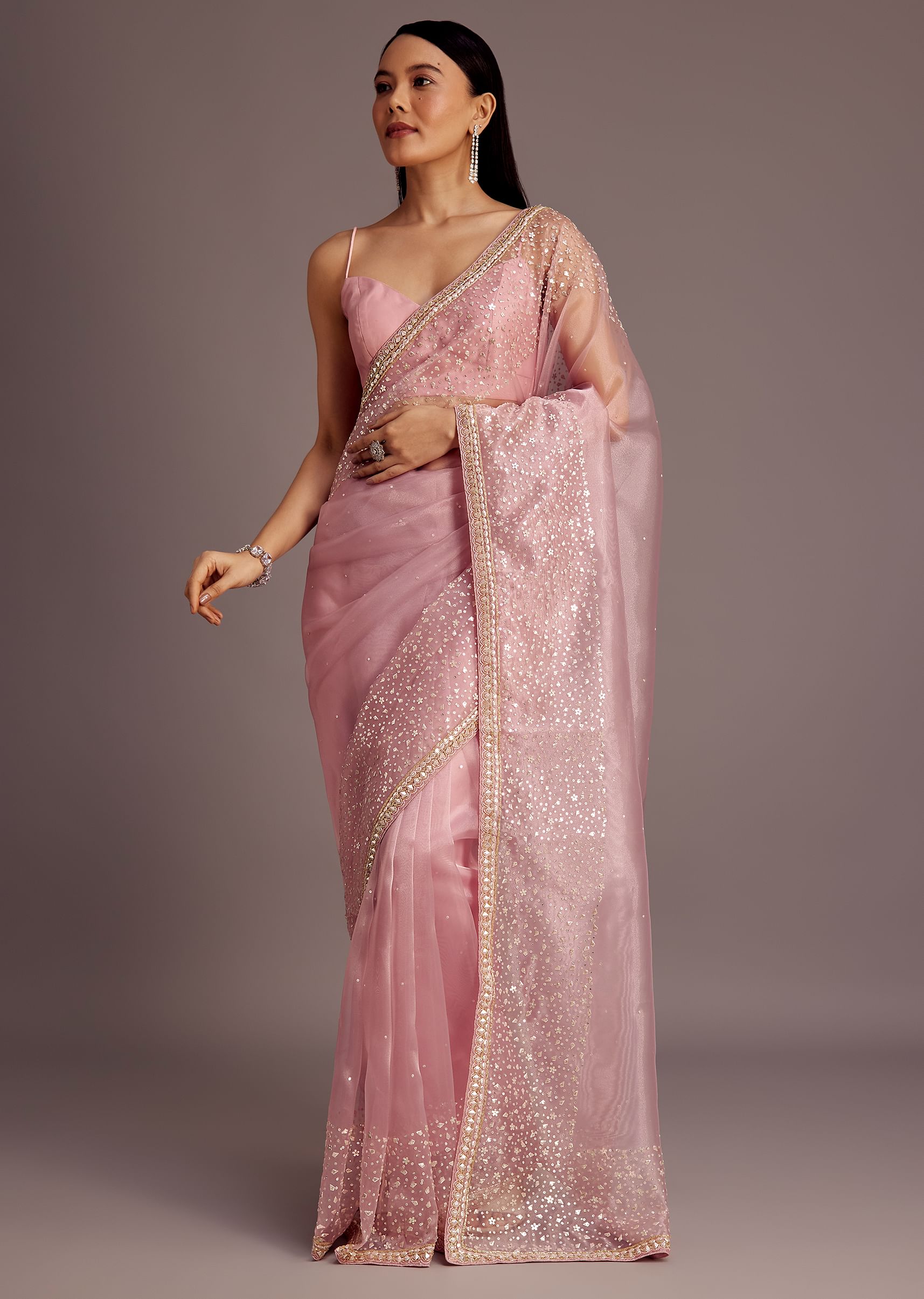 Pink Tissue Saree With Sequins Embellished Border
