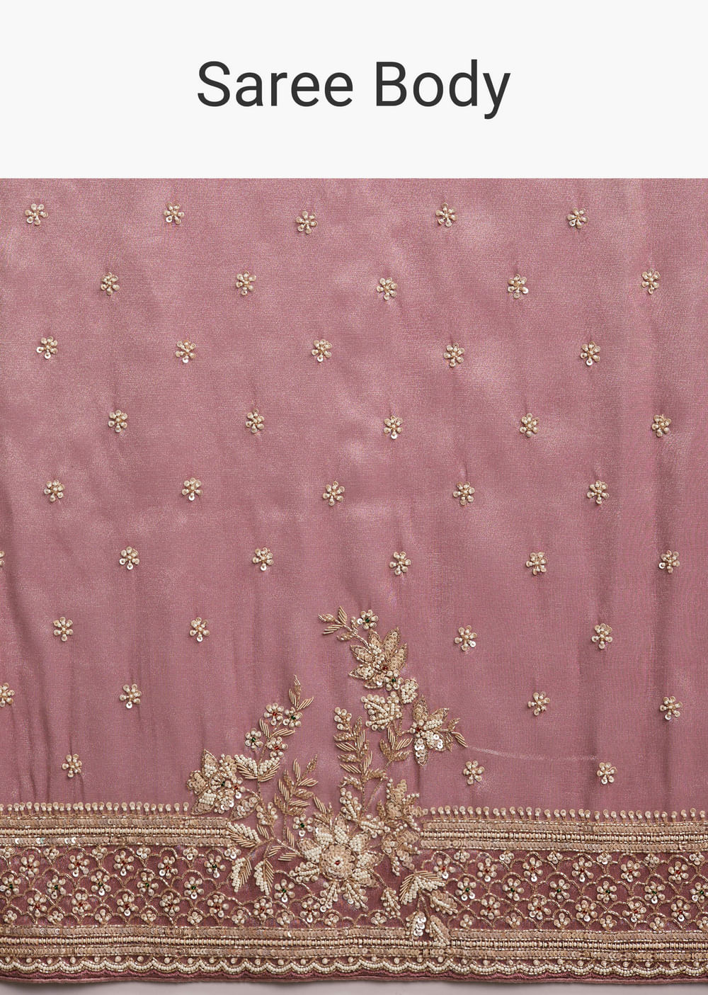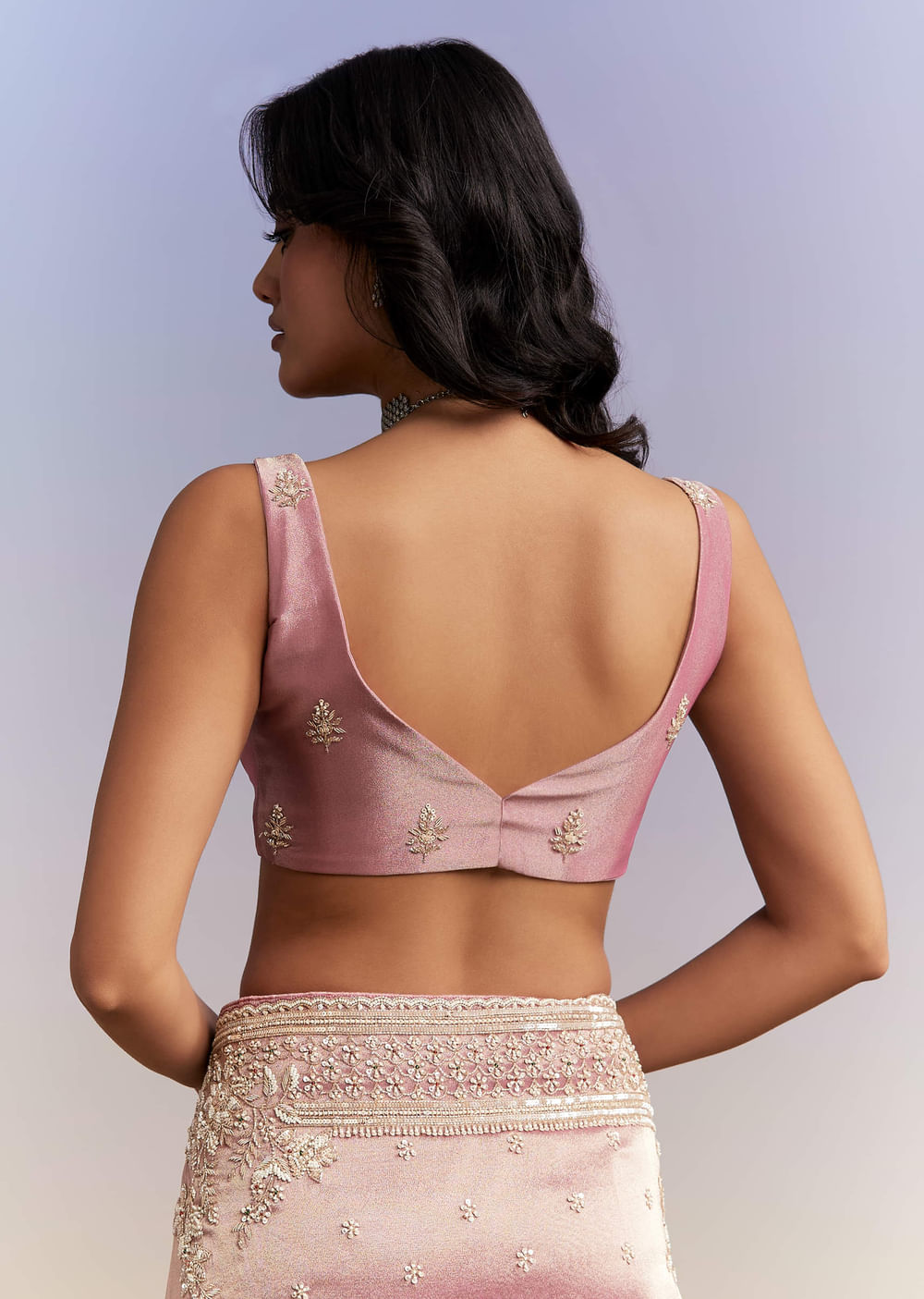 When colour needs craft to match, this pink tissue silk saree balances glossy sheen with intricate detailing. Floral jaal along the border and heavy embroidered buttis feature cutdana, beads and... More Product Details
