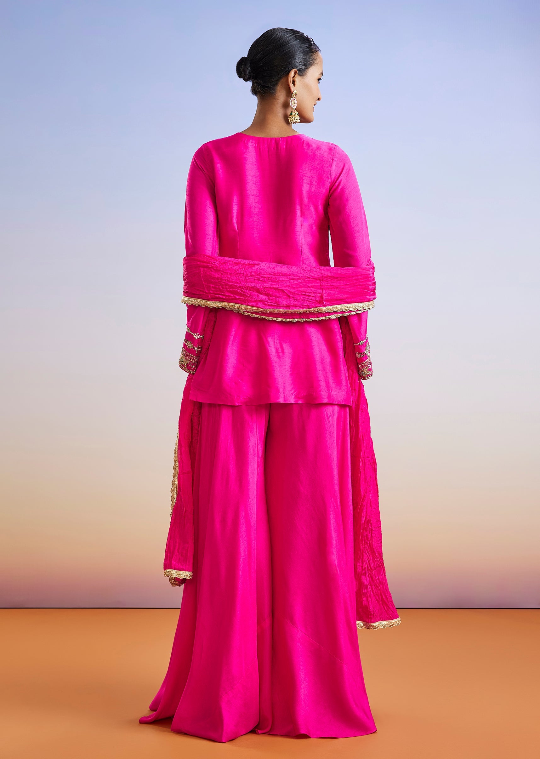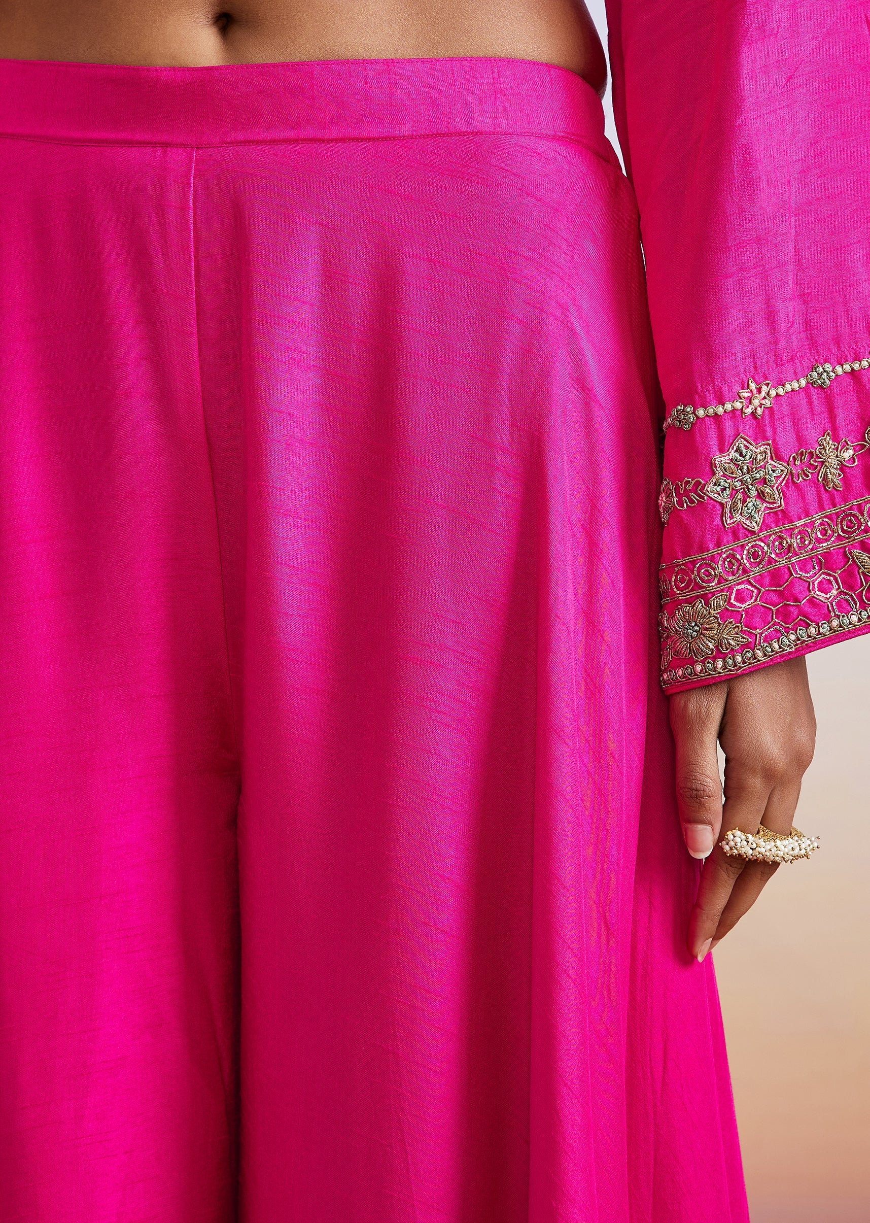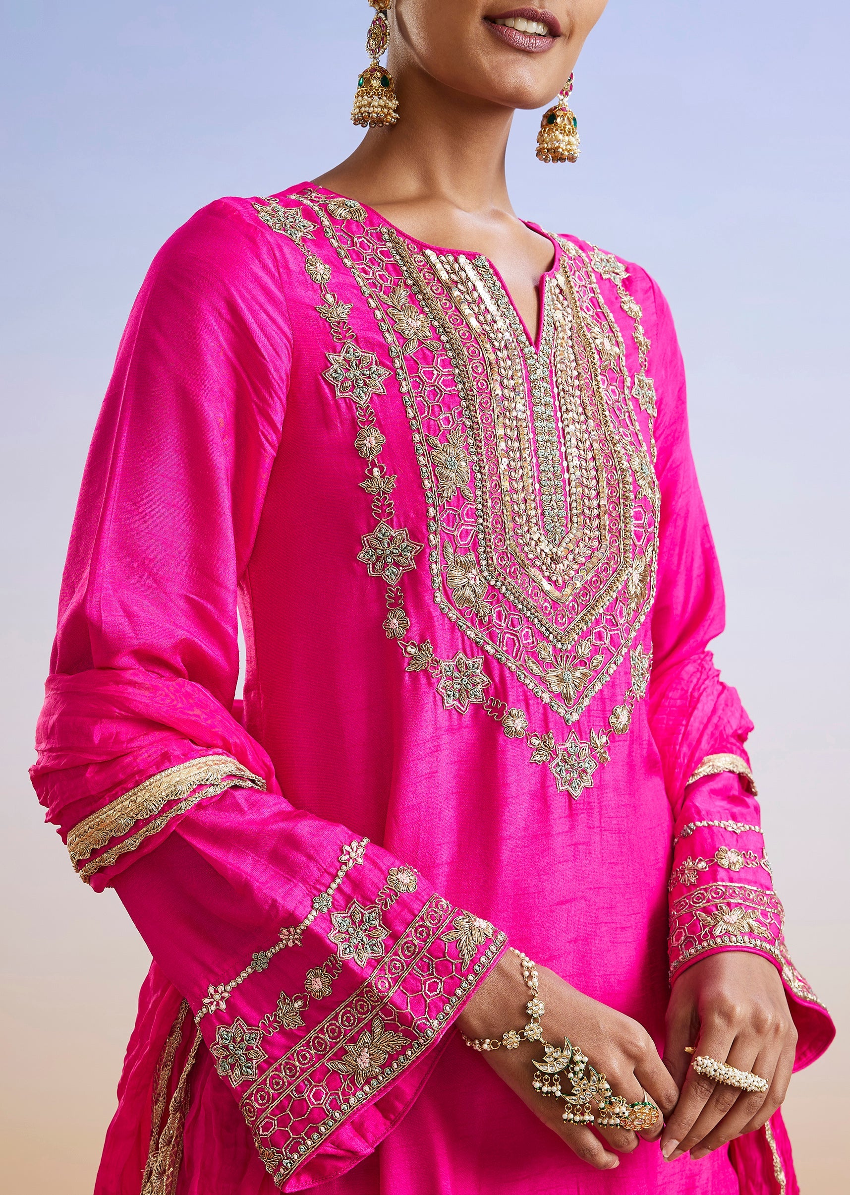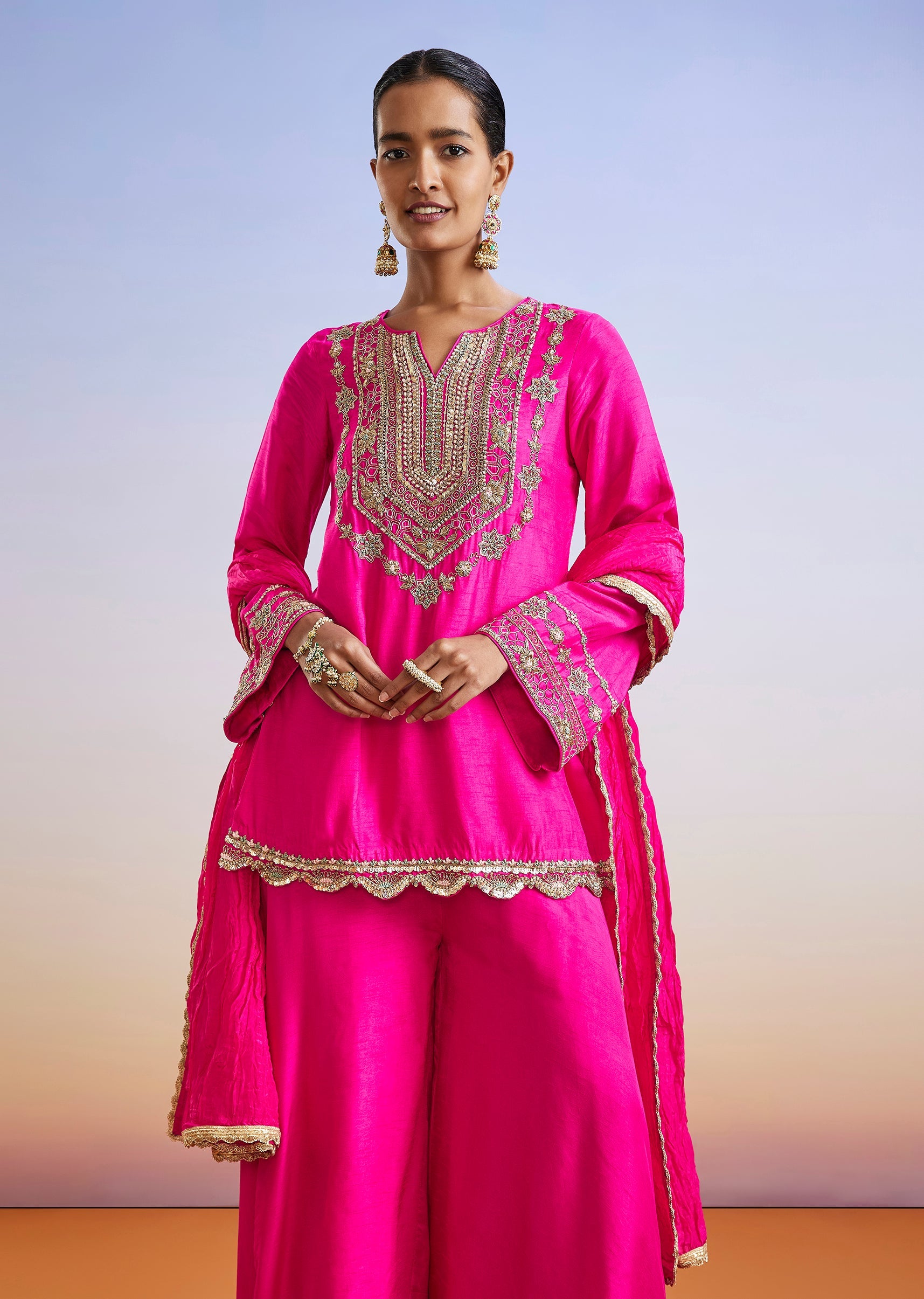 An elegant pink straight-cut kurta set crafted in dola silk and highlighted with delicate zardosi and sequin embroidery. Styled with flared sleeves, palazzo pants and a dupatta, this outfit blends... More Product Details