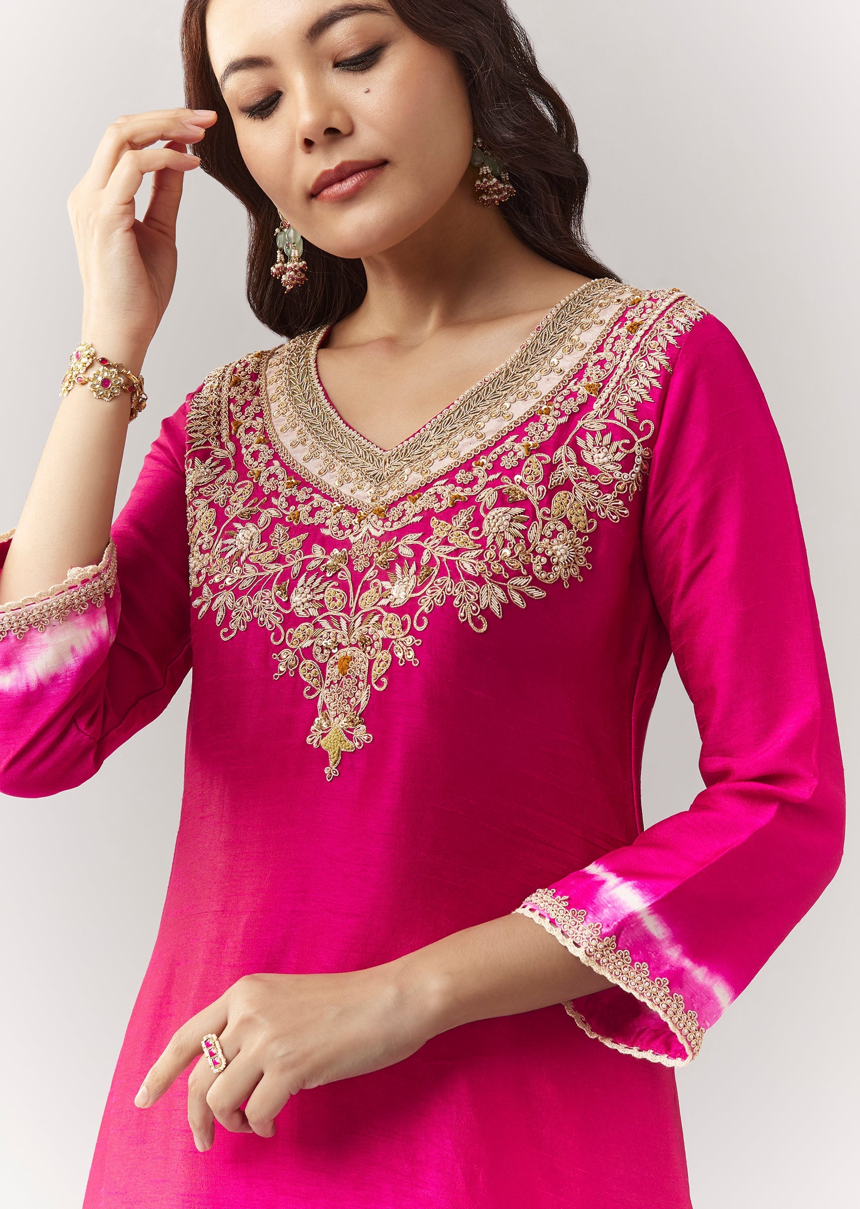 Pink Zardosi Kurta Straight Pant Coord With Leheriya Border