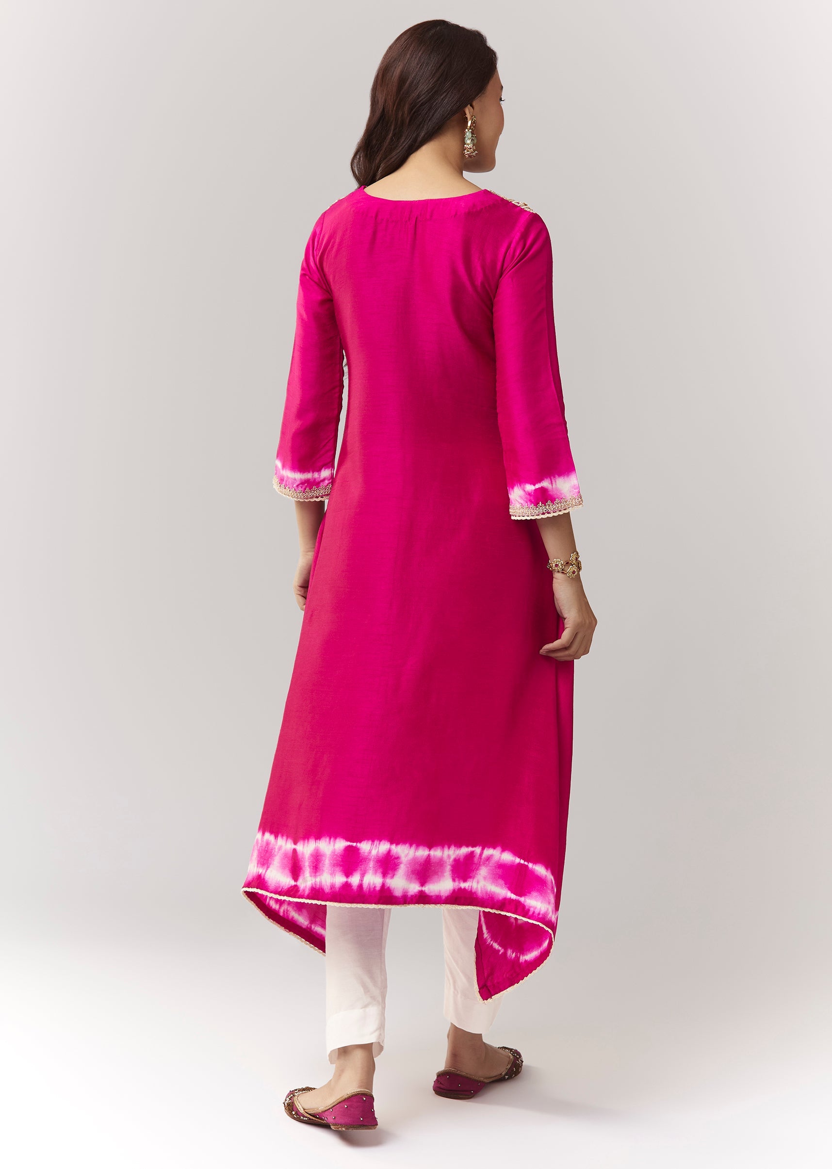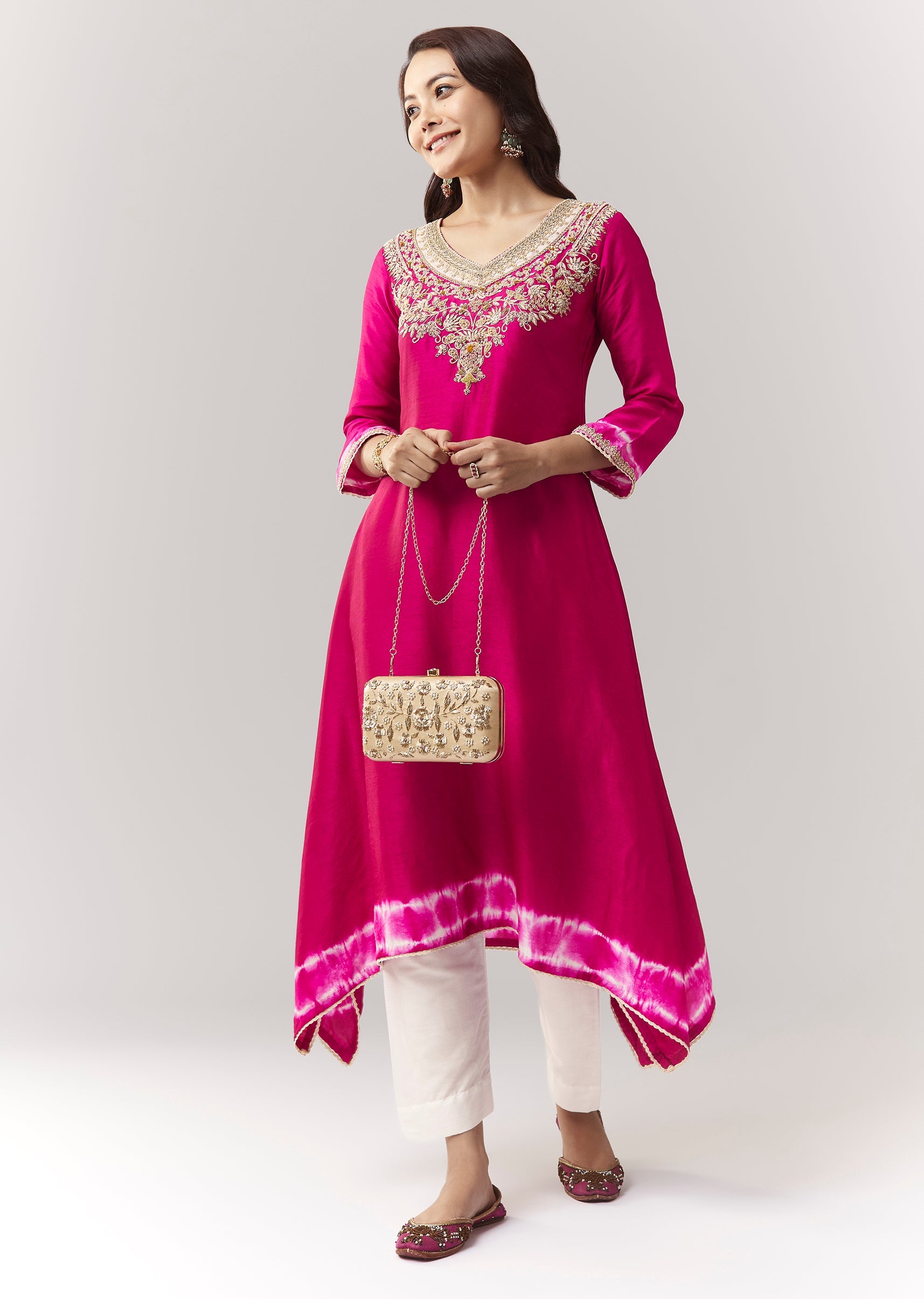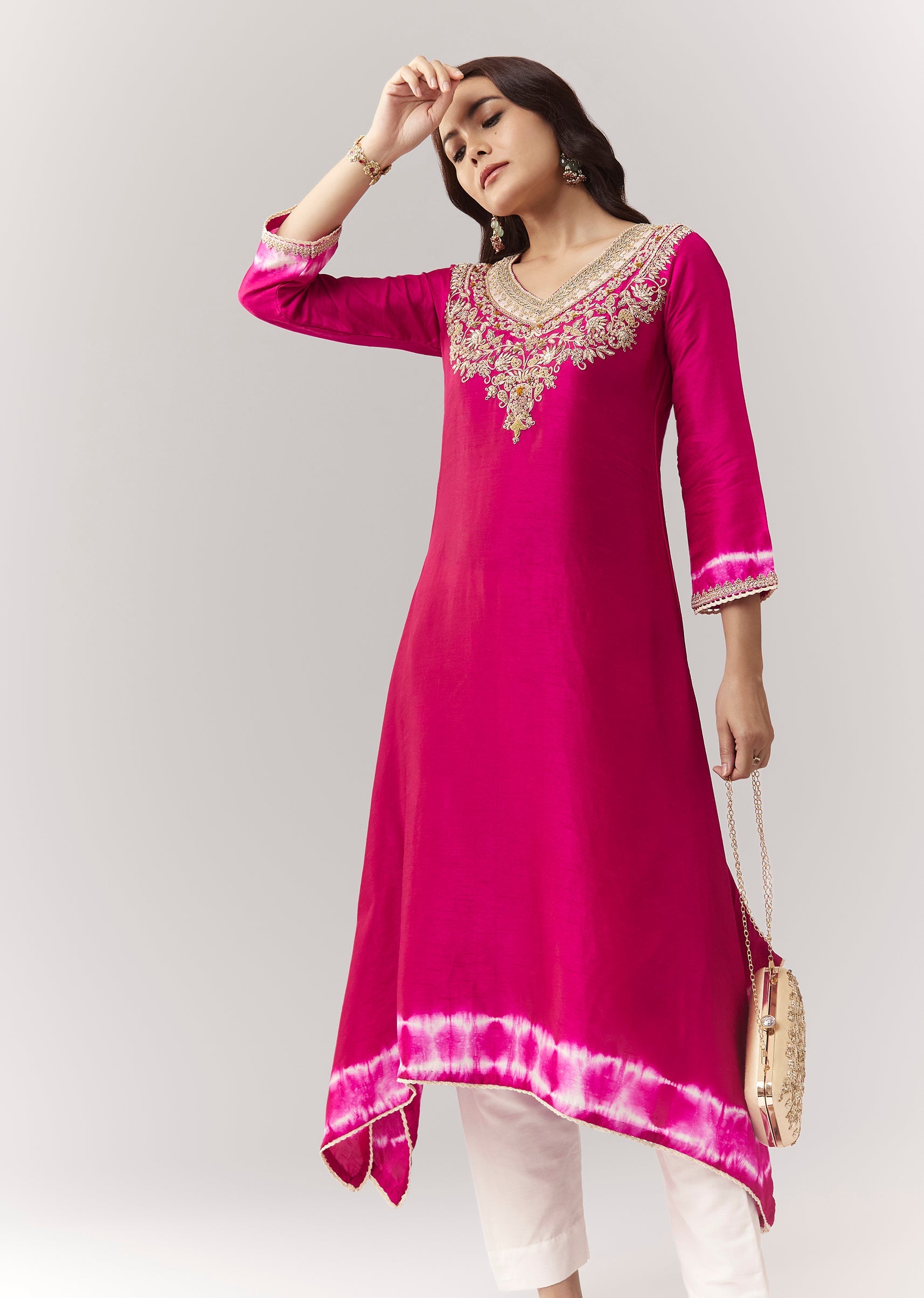 A vibrant pink asymmetric kurta with zardosi accents and leheriya border, paired with straight pants for a modern festive look. Awarded as the Most Trusted Brand, we're delivering styles you... More Product Details