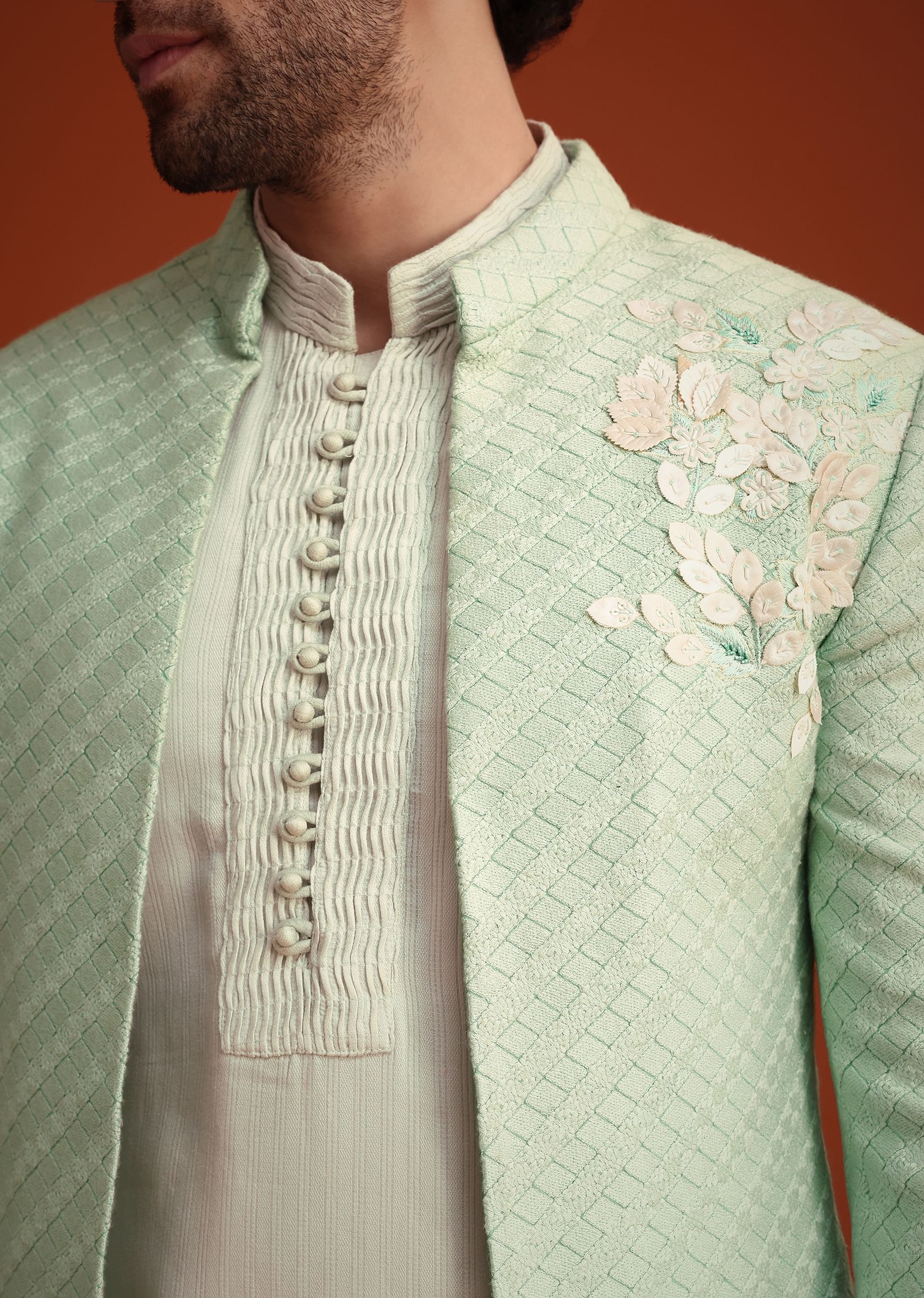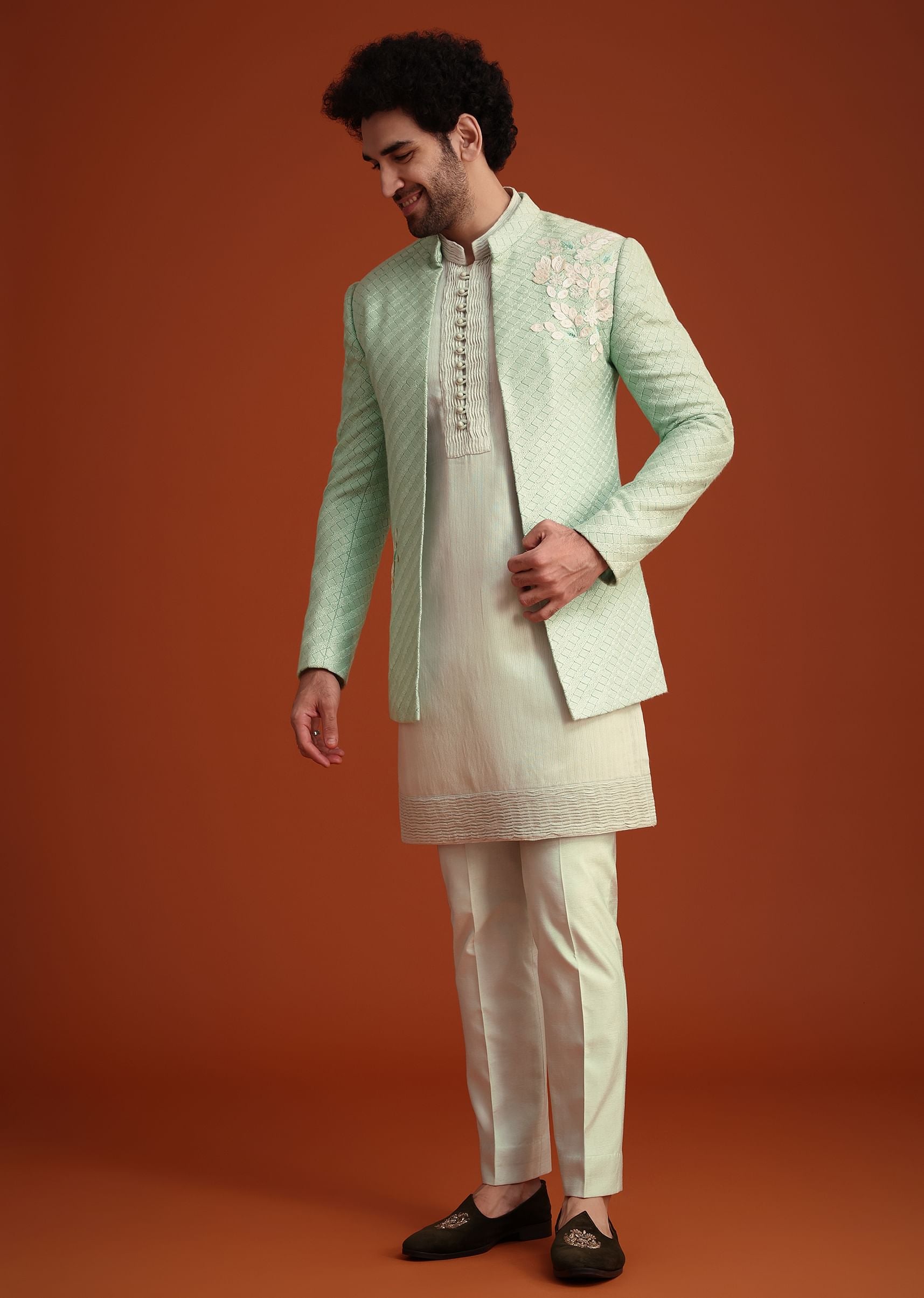 This pista green Jodhpuri set is elegantly crafted with fine embroidery adding a touch of sophistication and heritage to your wardrobe. The regal design makes it perfect for weddings or formal celebrations. Awarded as the Most Trusted Brand, we're delivering styles you love, just as promised.