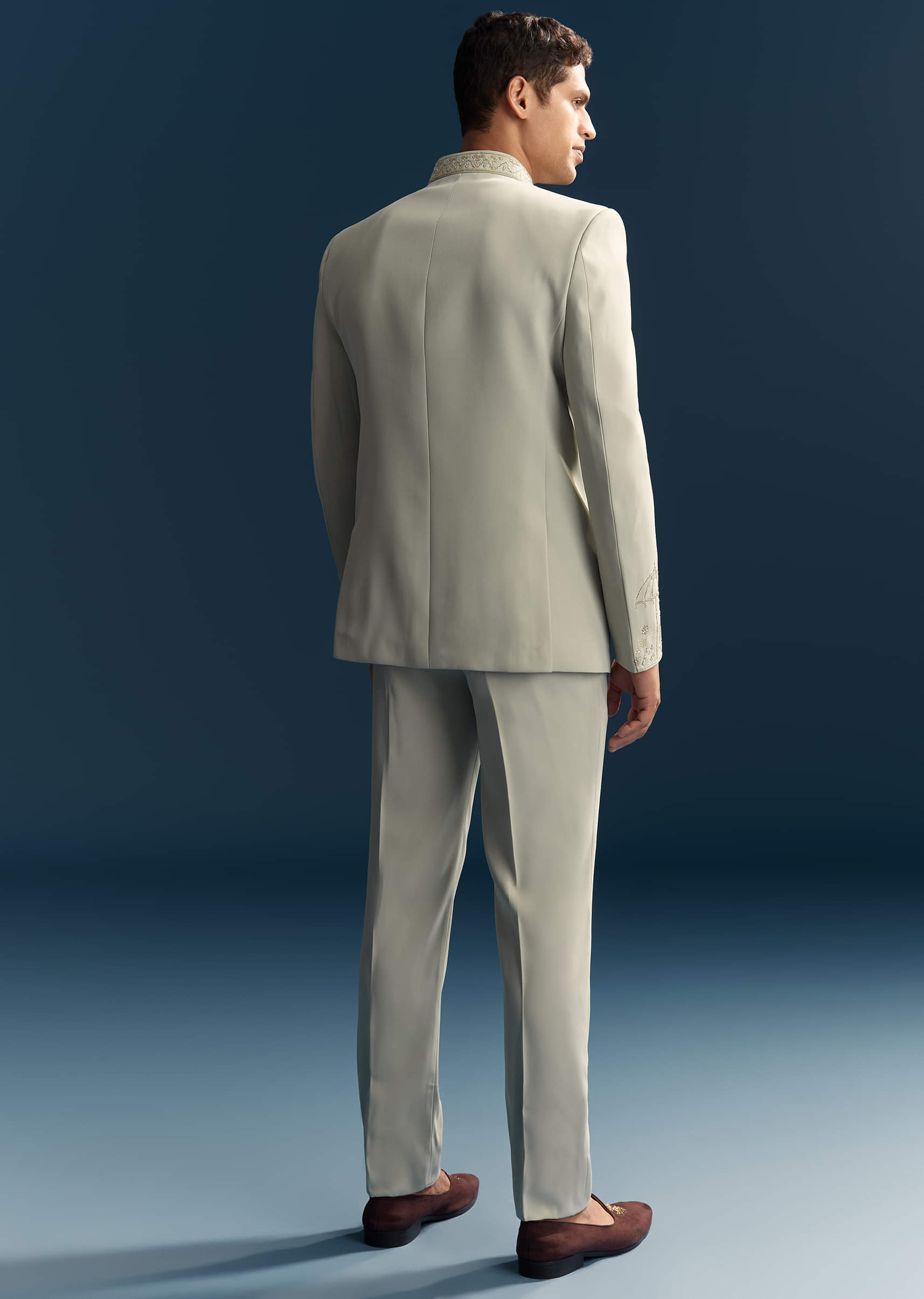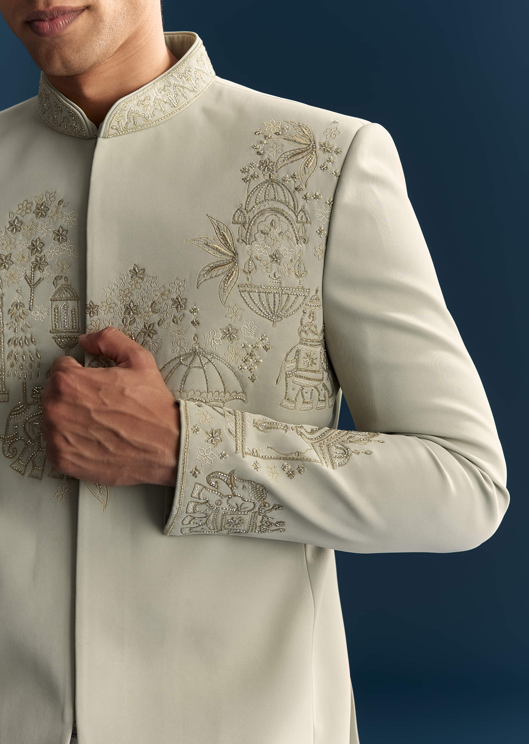Timeless in tone, this pista green jodhpuri suit in suiting fabric carries gold embroidery inspired by Mughal domes and arches across the chest, sleeves, and collar. The architectural motifs add... More Product Details