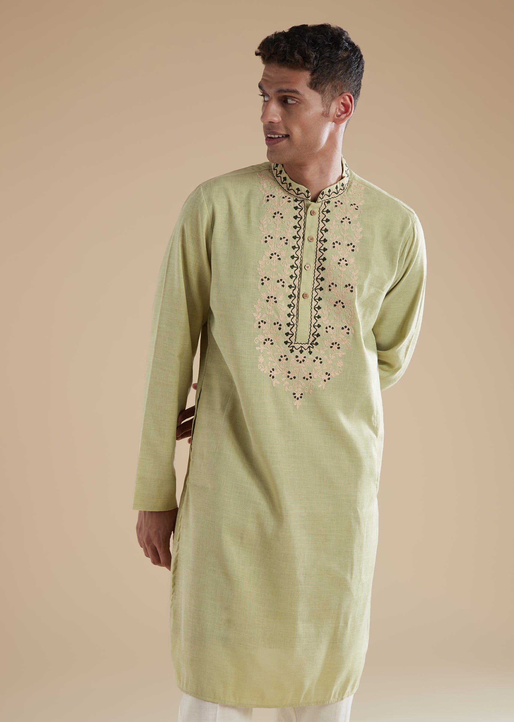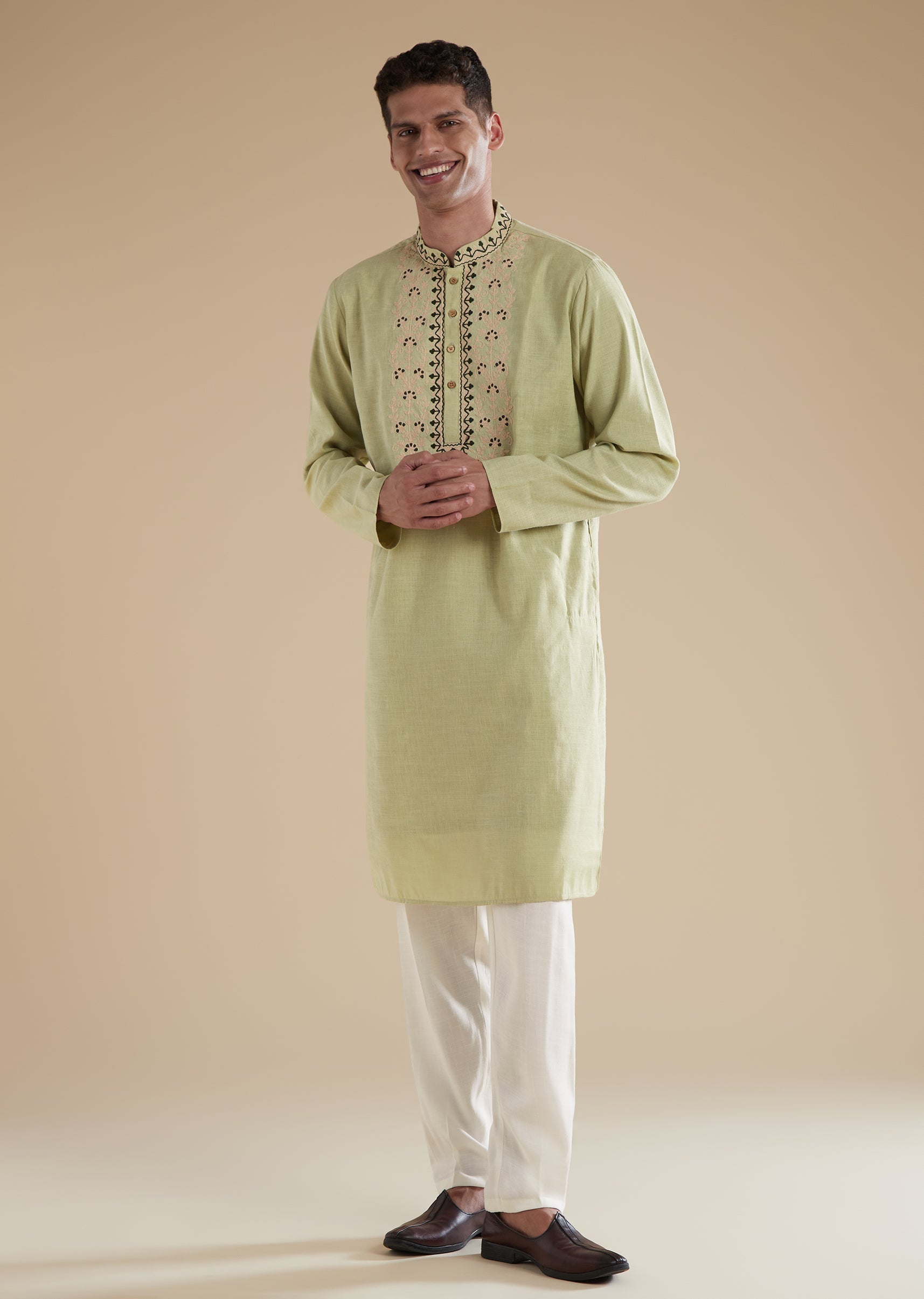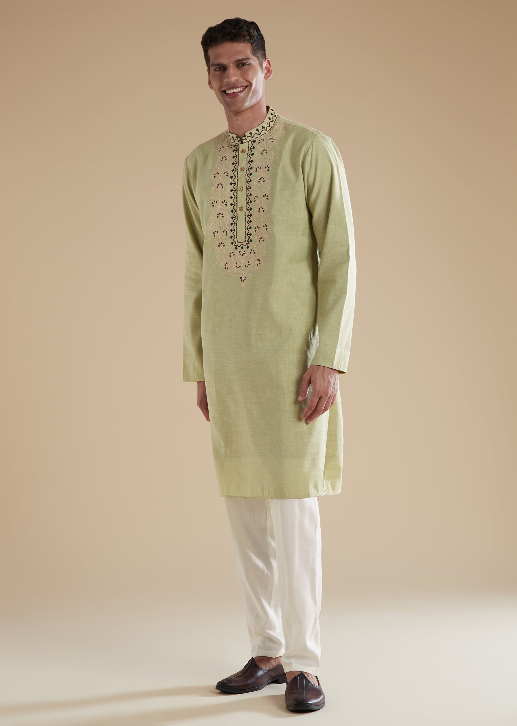 This pista green mens kurta set is crafted in soft cotton with polyester as the secondary fabric, offering a comfortable fit with a clean and structured appearance. The kurta features delicate resham thread detail, full sleeves, and a refined mandarin collar that enhances its pastel charm. Coordinating pants complete the set, creating a balanced and elegant look suitable for daytime celebrations and light festive occasions.