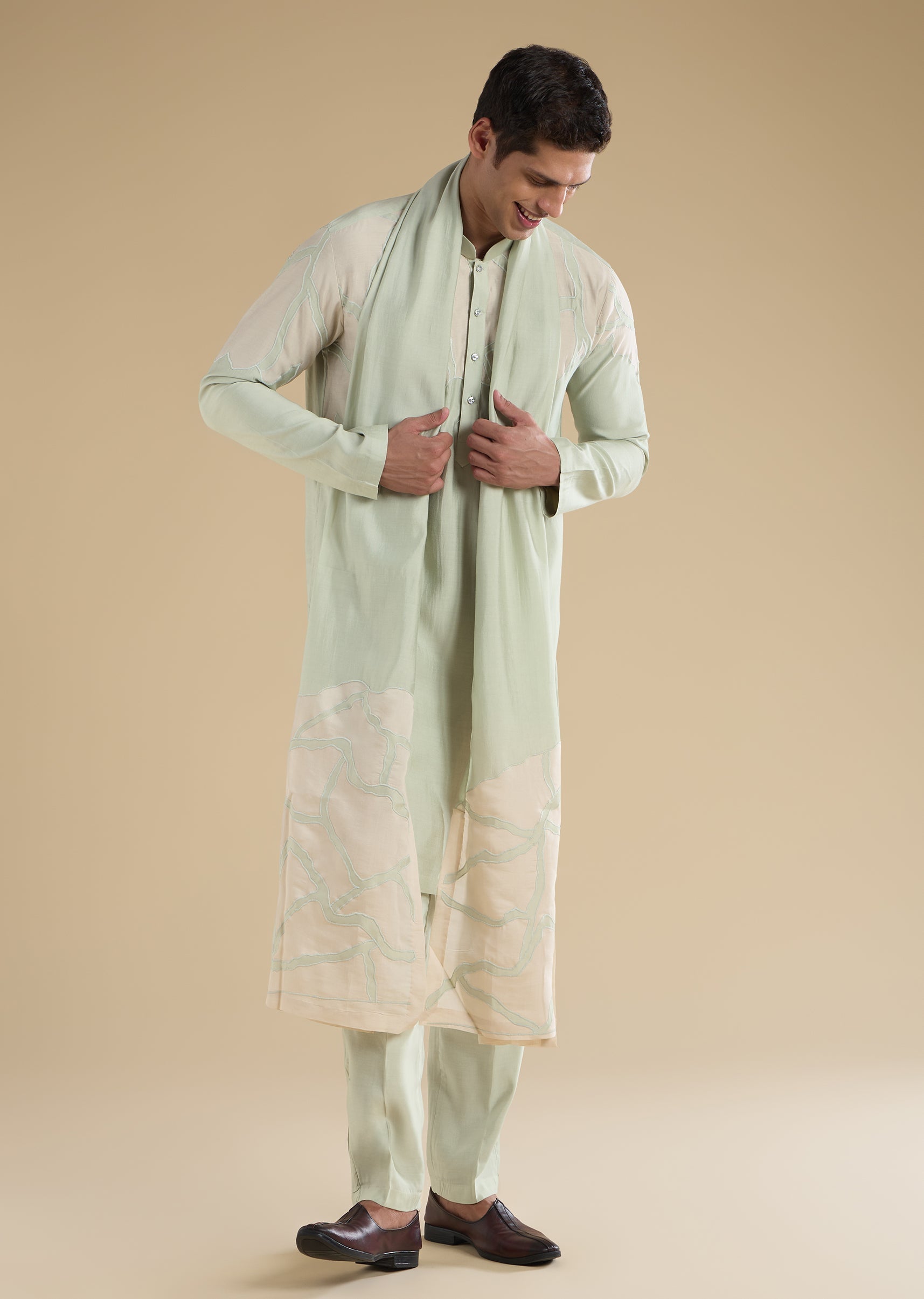 A soft pista green festive kurta set featuring self-design texture and applique work for elevated minimal style. With mandarin collar, full sleeves, and front buttons, it comes with straight mid-waist pants and a matching dupatta—perfect for mehendi or wedding guest looks.