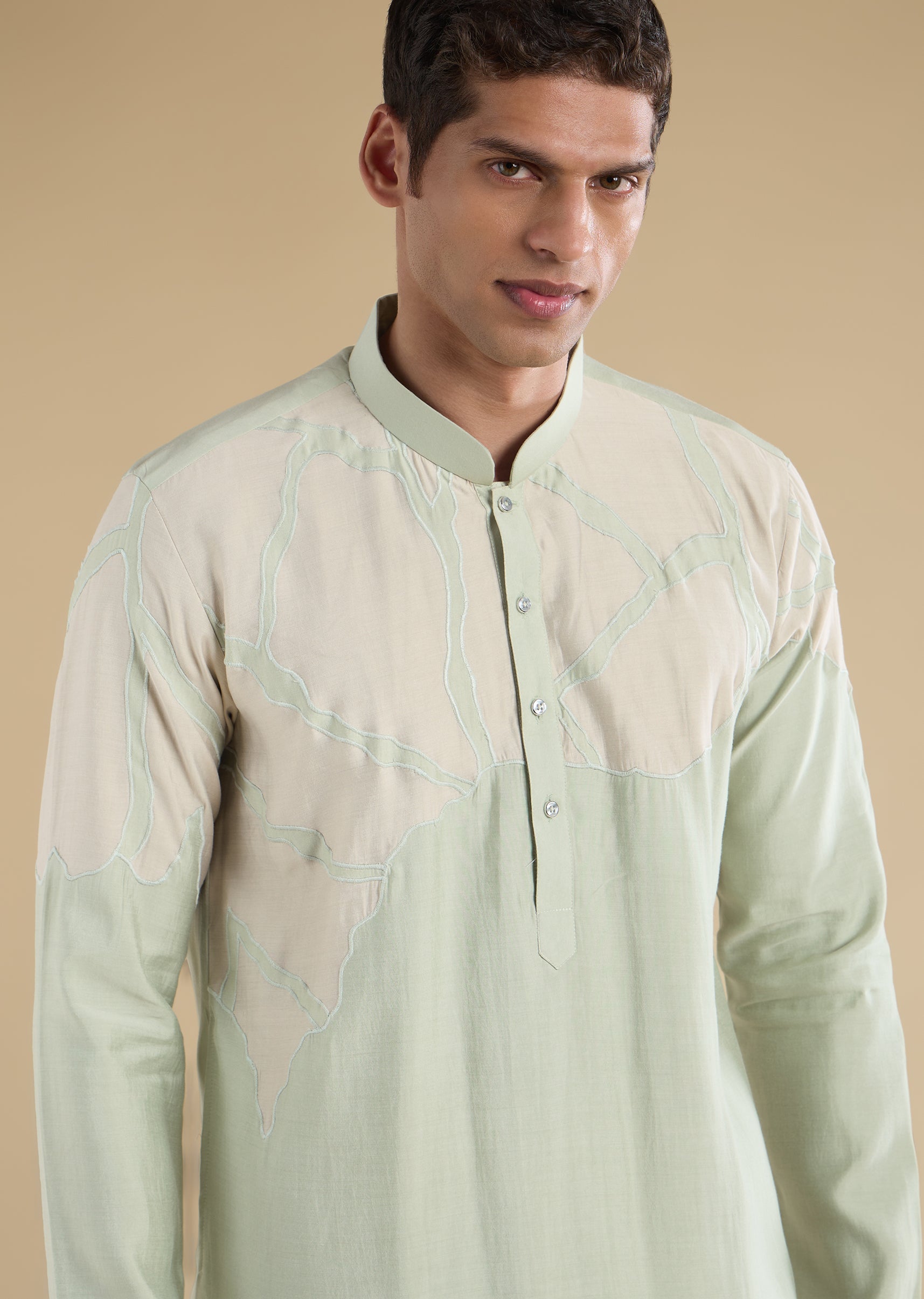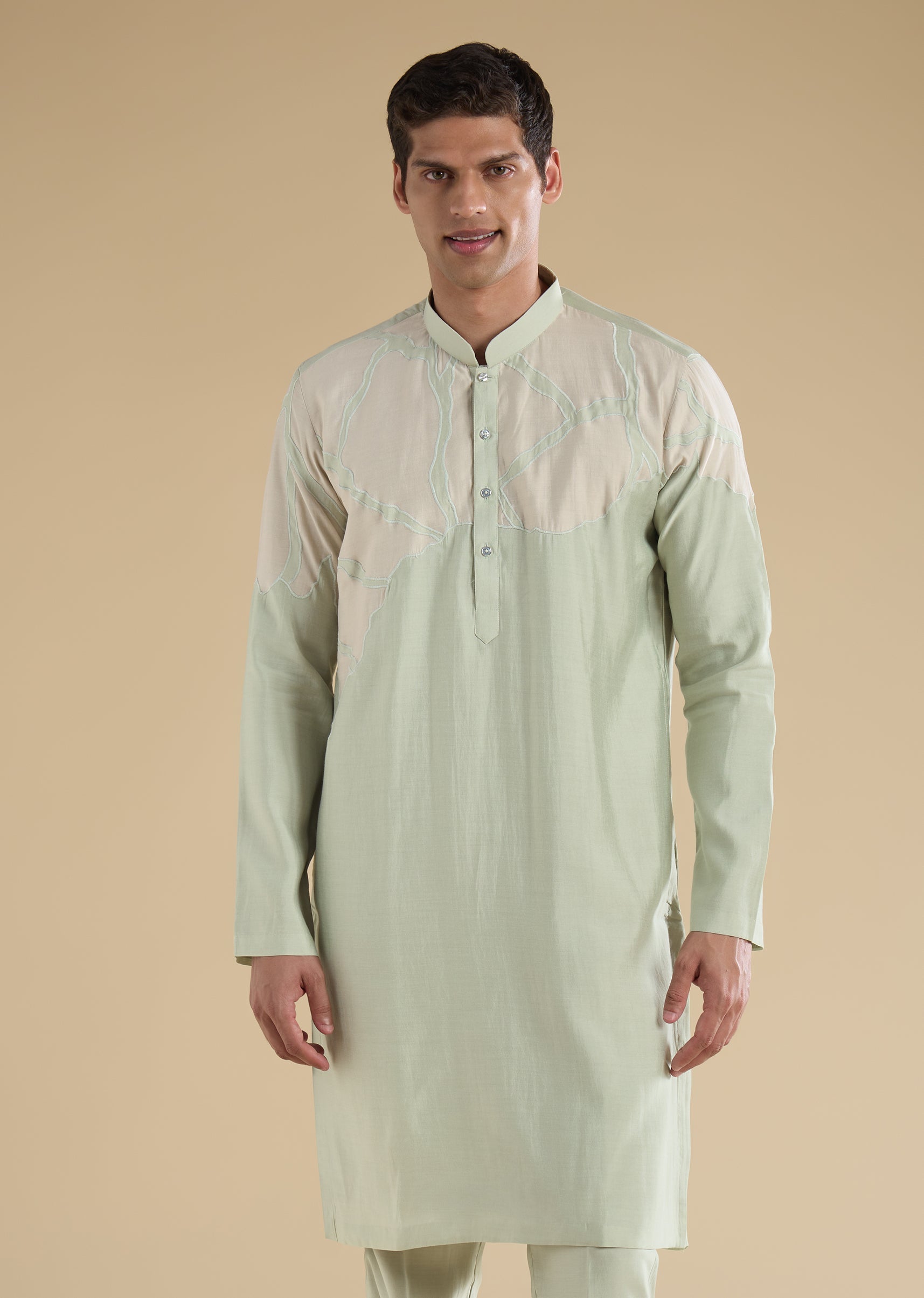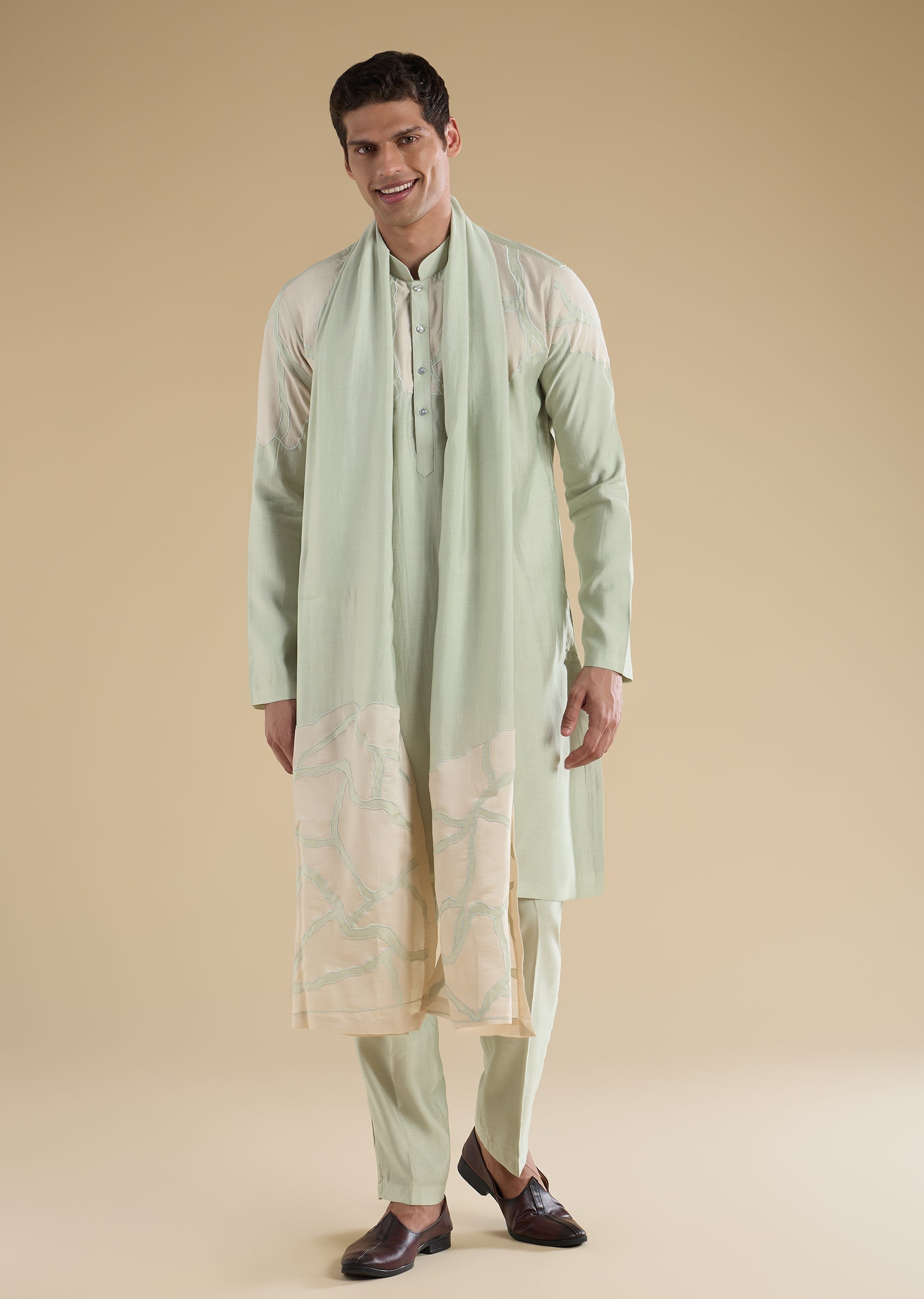 A soft pista green festive kurta set featuring self-design texture and applique work for elevated minimal style. With mandarin collar, full sleeves, and front buttons, it comes with straight mid-waist... More Product Details
