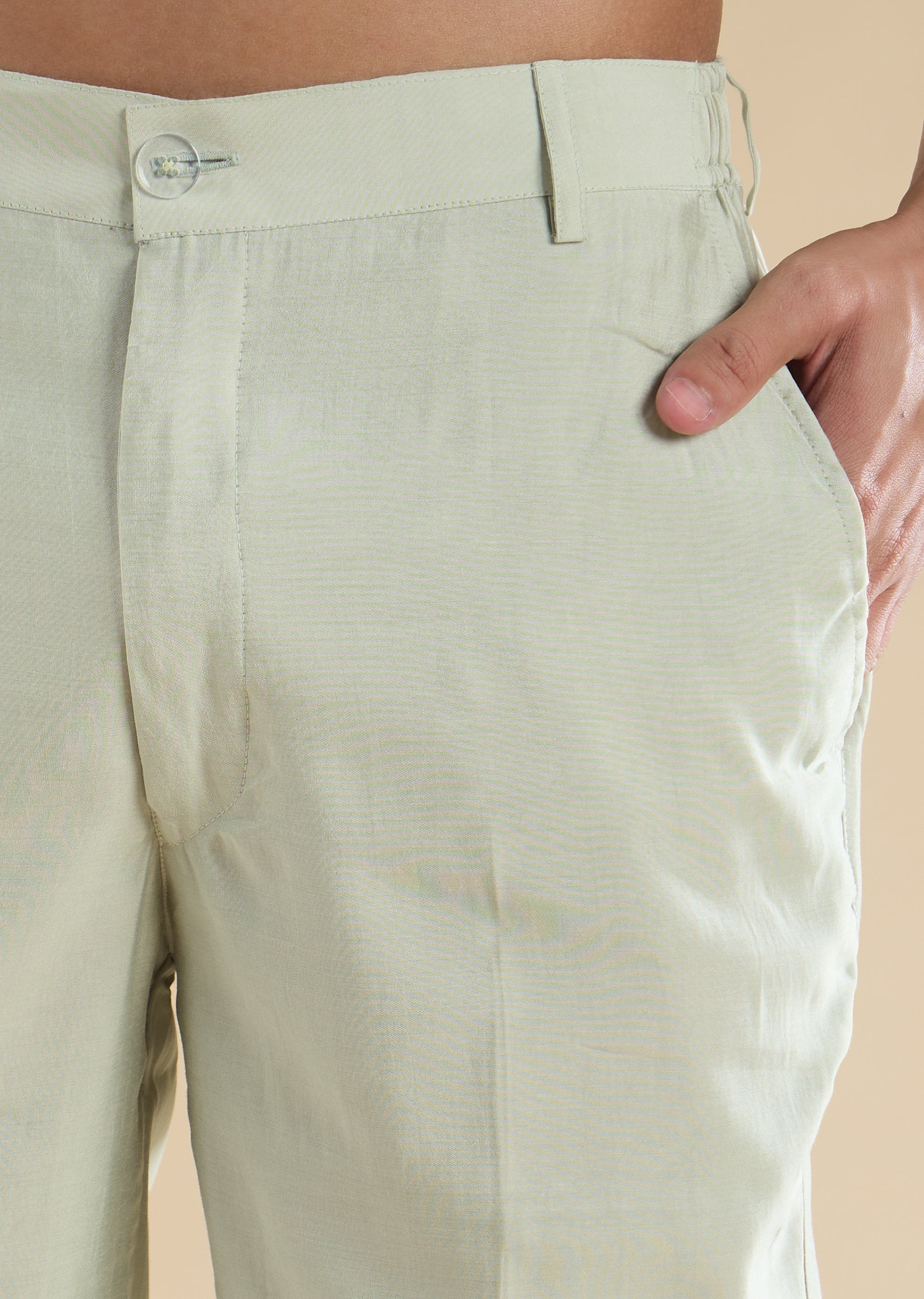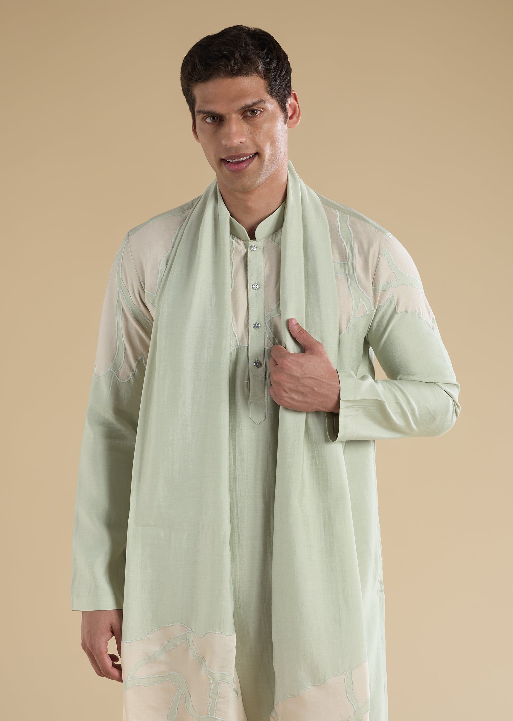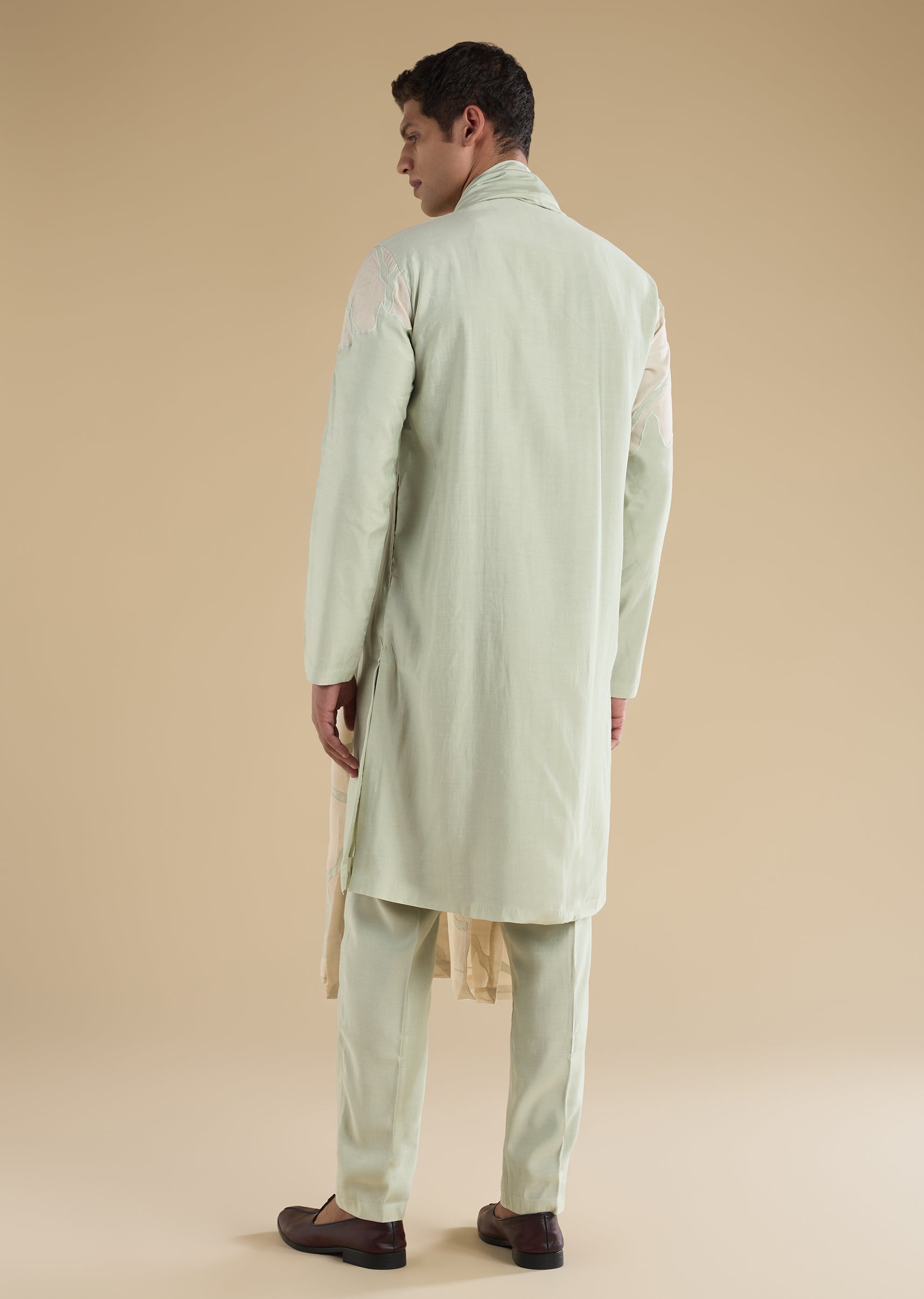 A soft pista green festive kurta set featuring self-design texture and applique work for elevated minimal style. With mandarin collar, full sleeves, and front buttons, it comes with straight mid-waist... More Product Details