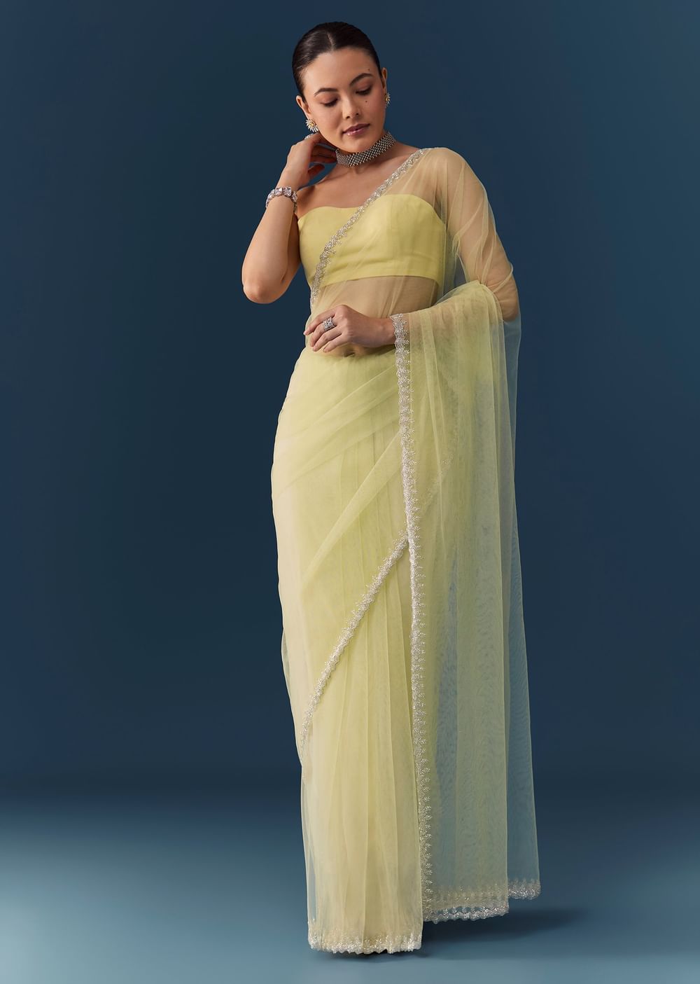 Fit Tips:Tailor the blouse for a structured yet comfortable fit to complement the saree’s lightweight, flowing texture.