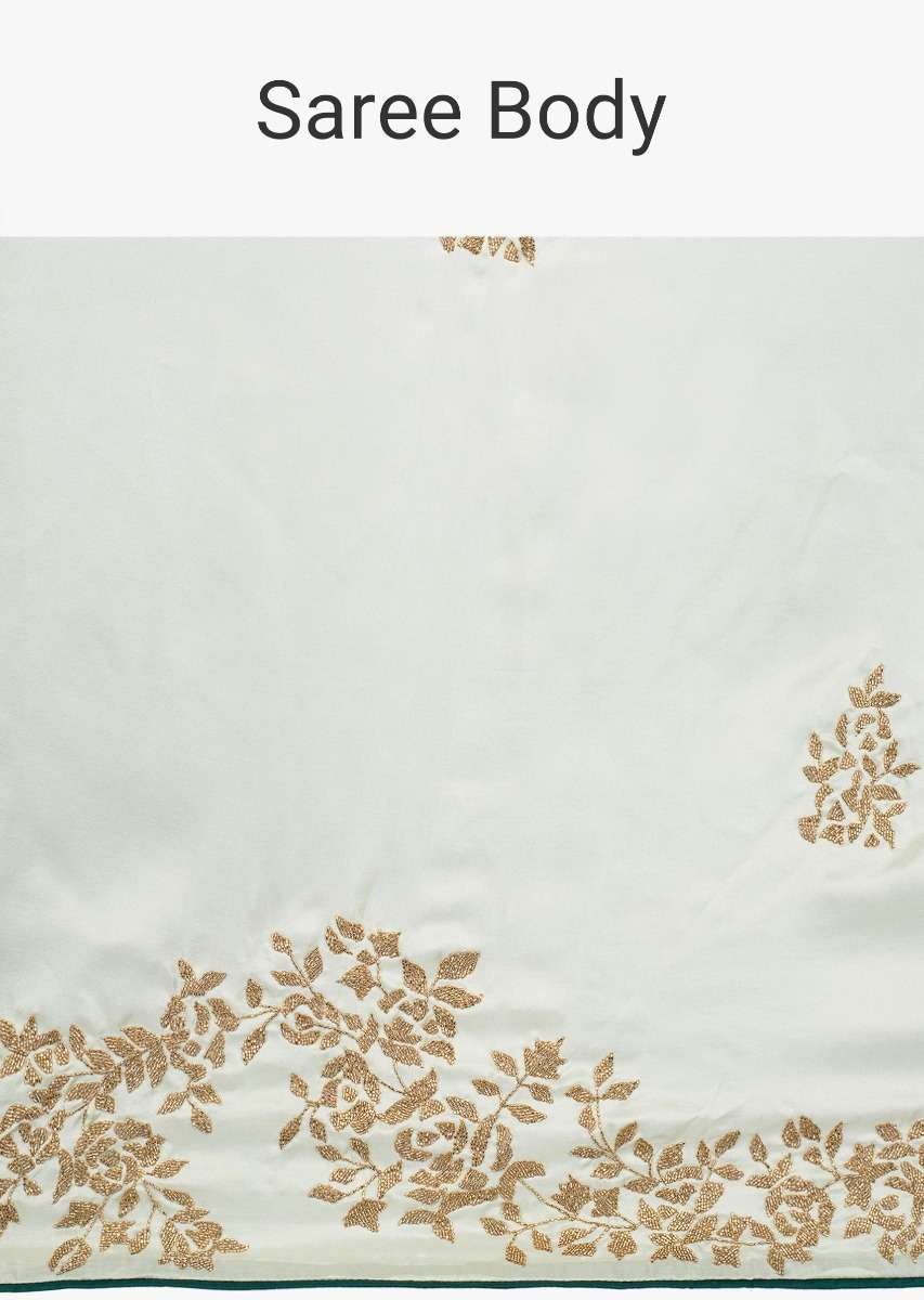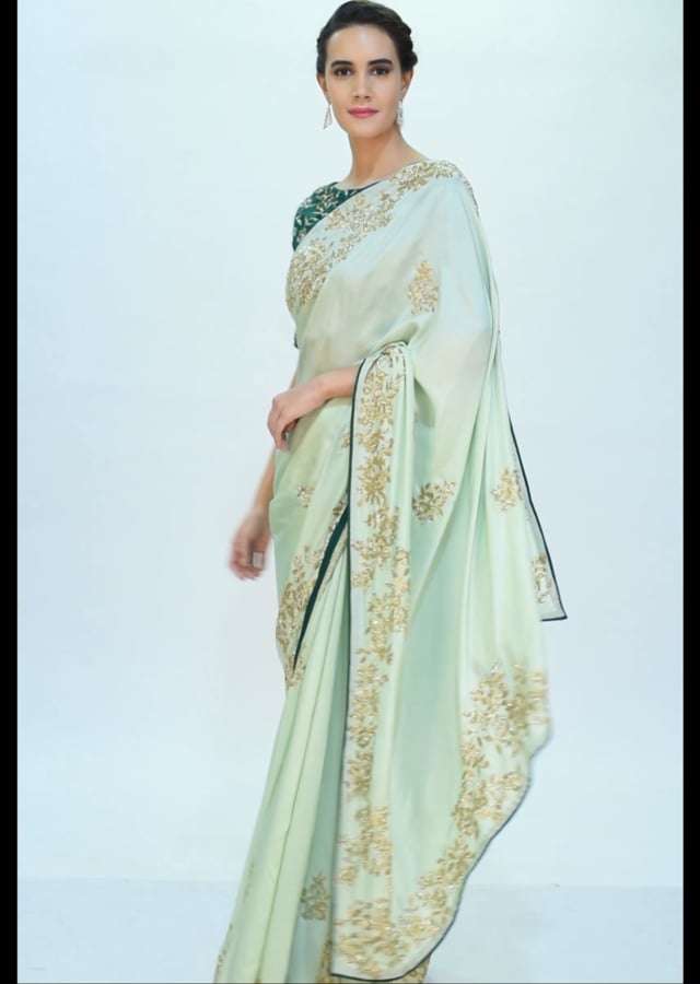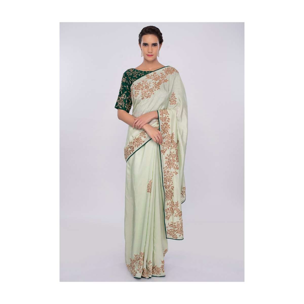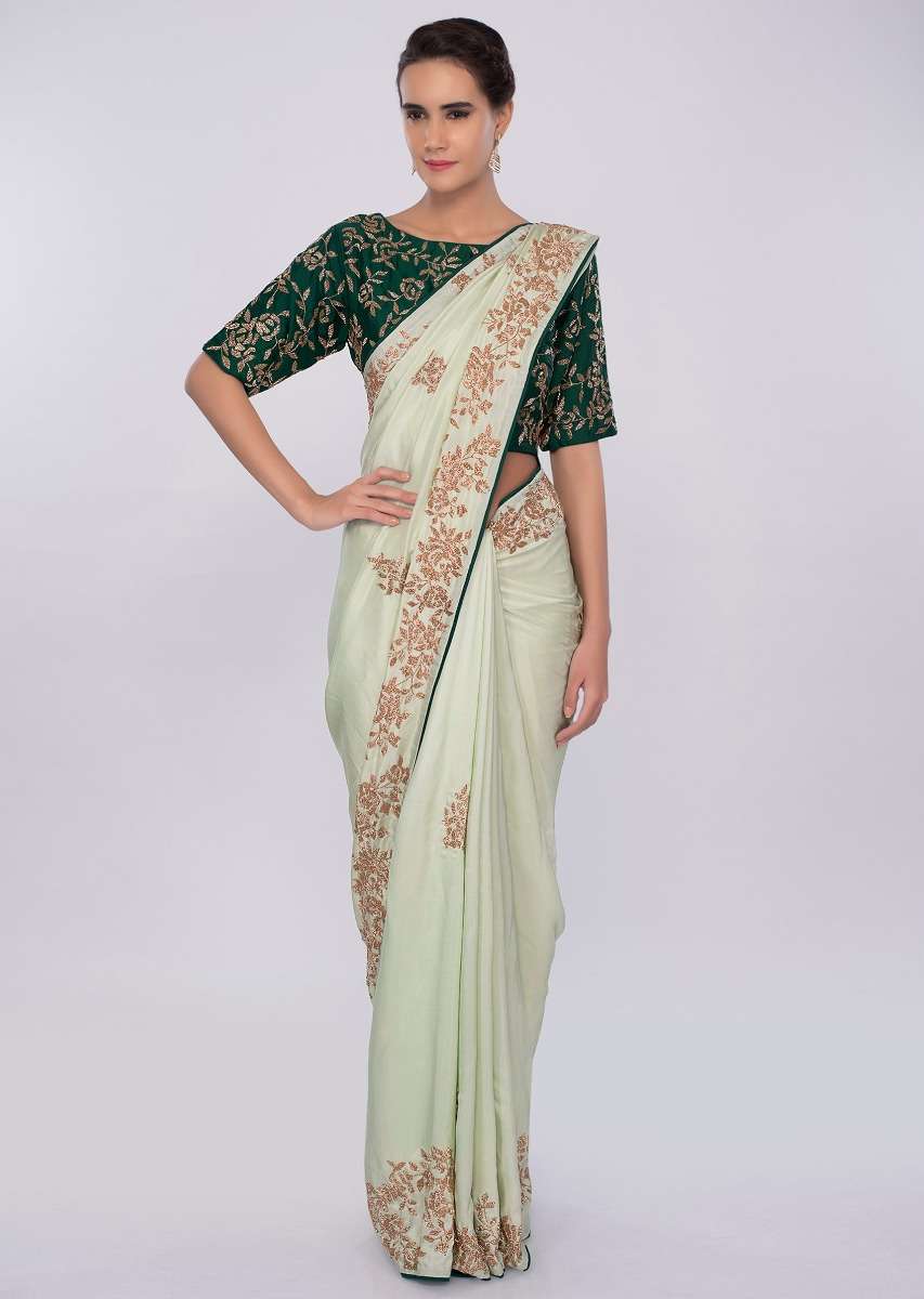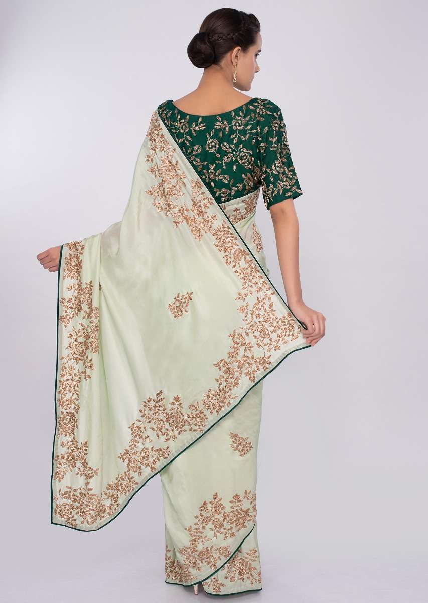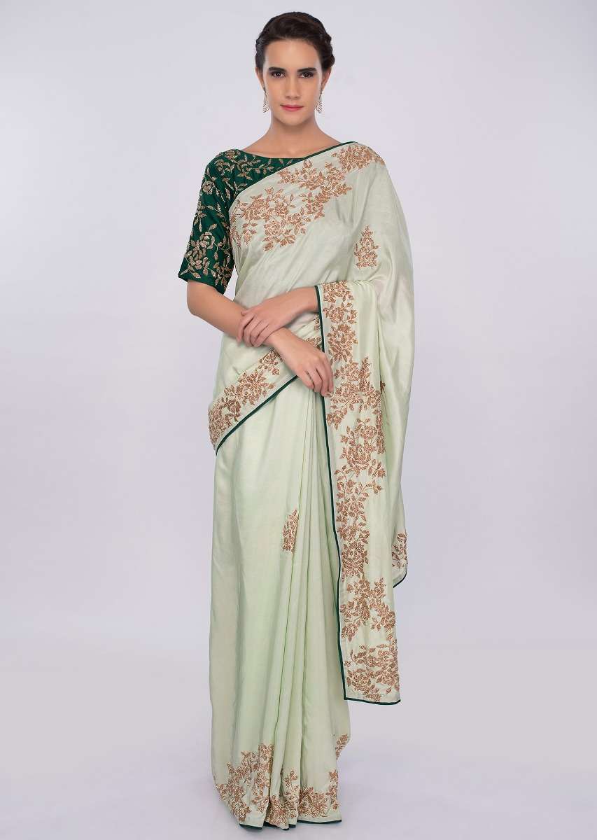 Pista green satin saree with emerald green silk blouse with cut dana embroidery only on kalki