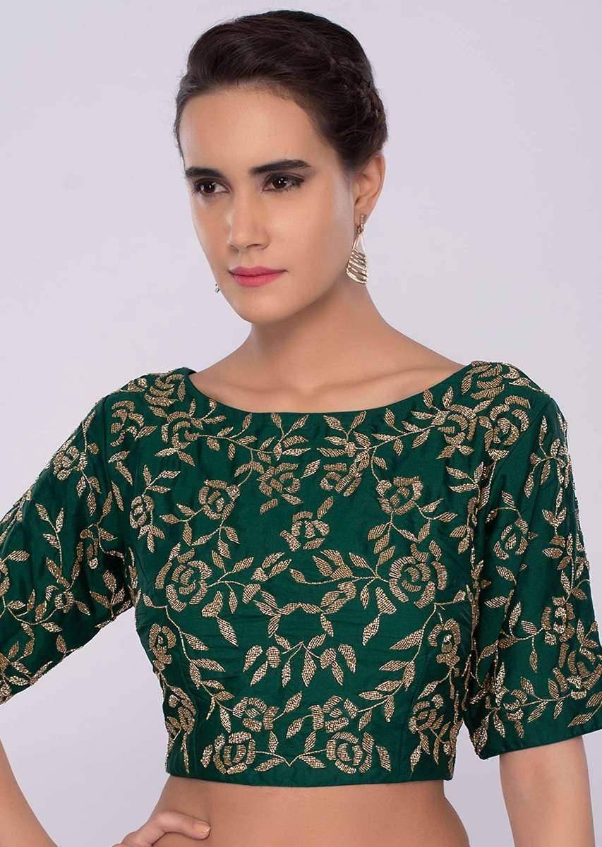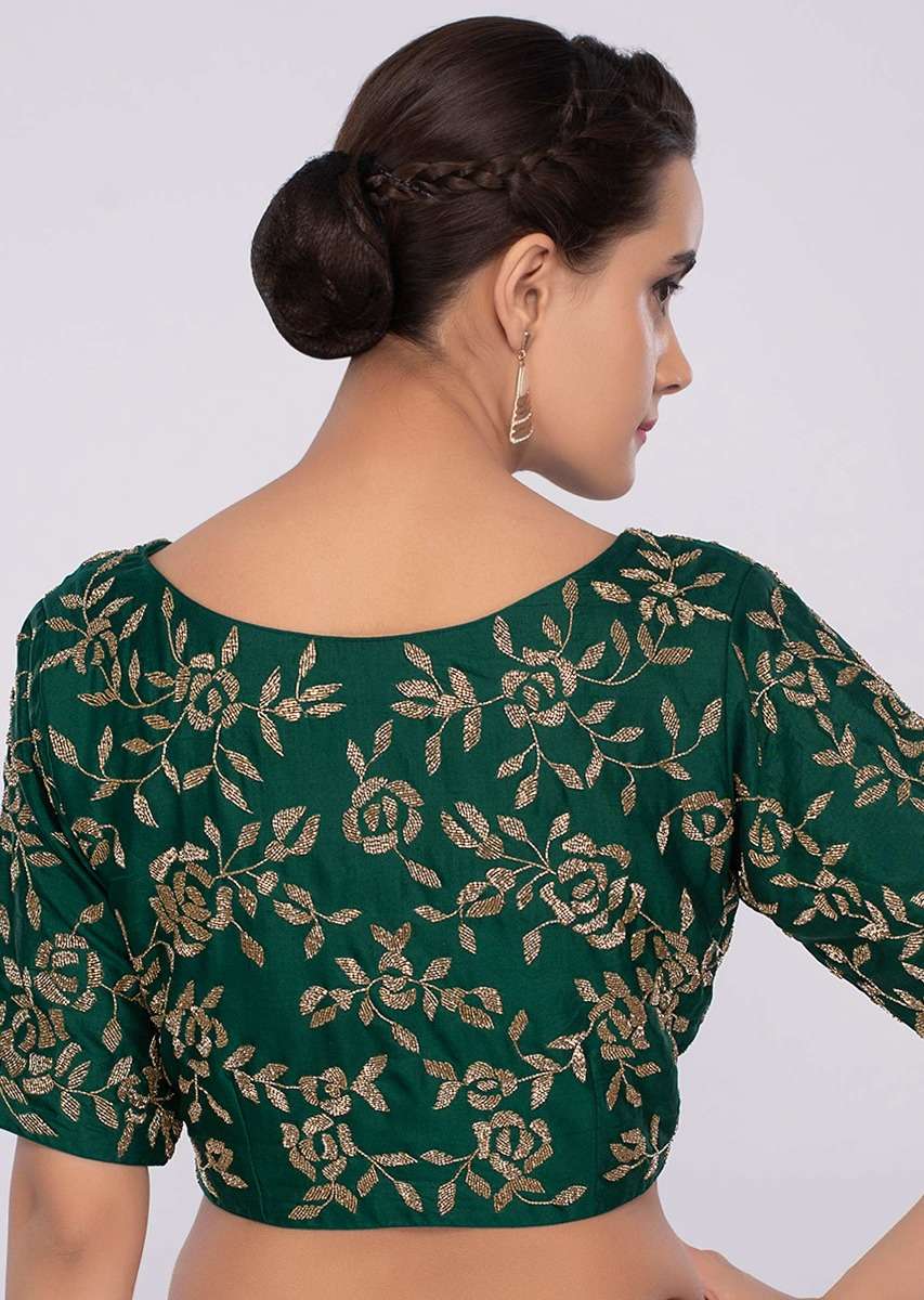 Pista green satin saree with butti and border. Adorn in cut dana embroidery in floral motif. Paired with an emerald green high neck silk blouse in cut dana floral jaal embroidery. Model is wearing an outfit that's "US size 0" (XS). height is 5.9", Bust - 32", Waist - 26" and Hip - 39". Awarded As The Most Trusted Brand We'Re Delivering Styles You Love Just As Promised.
