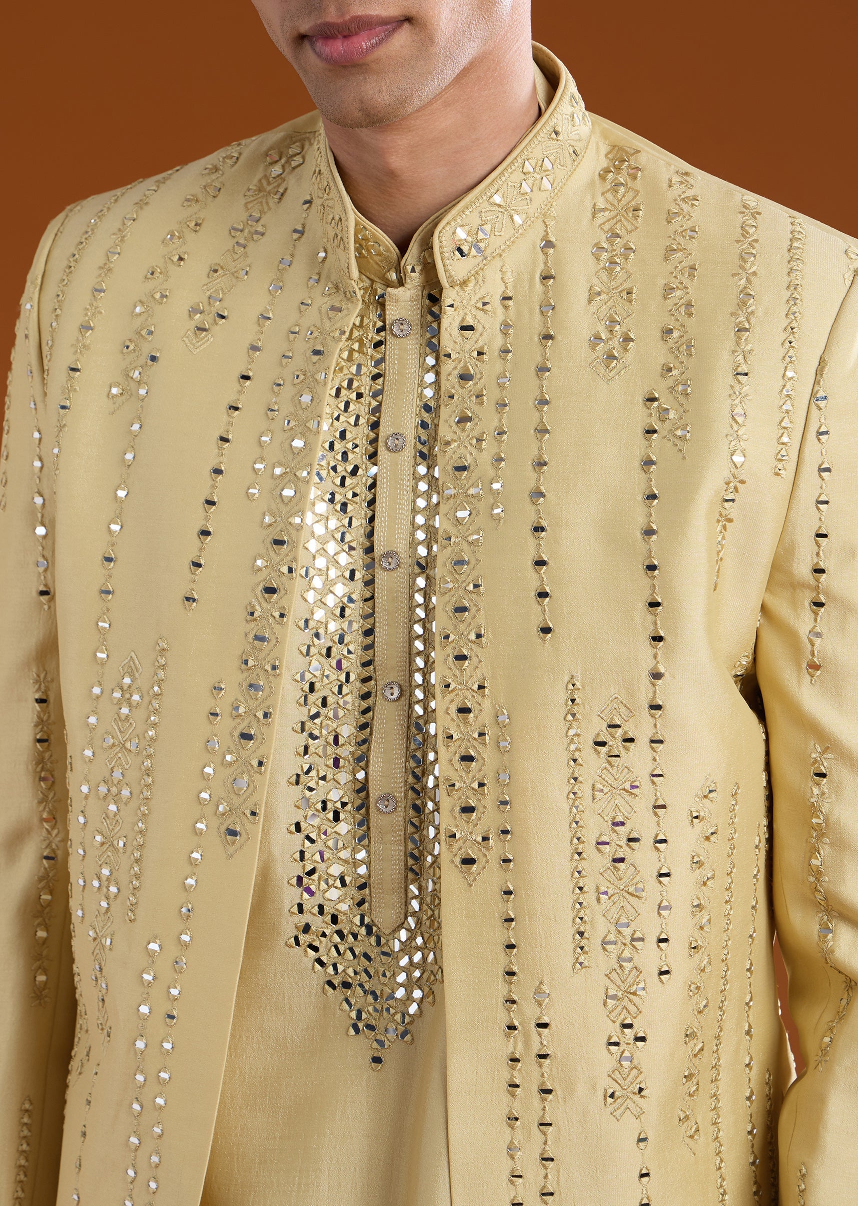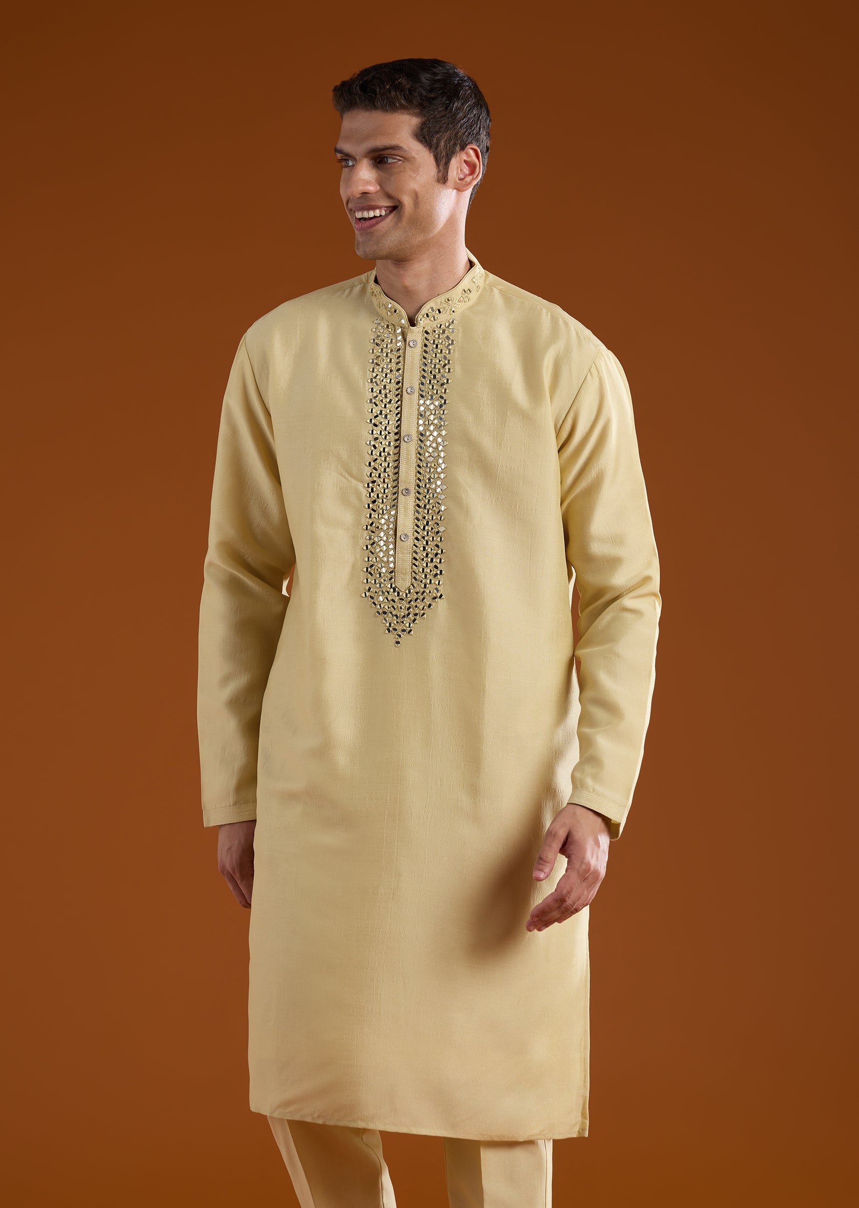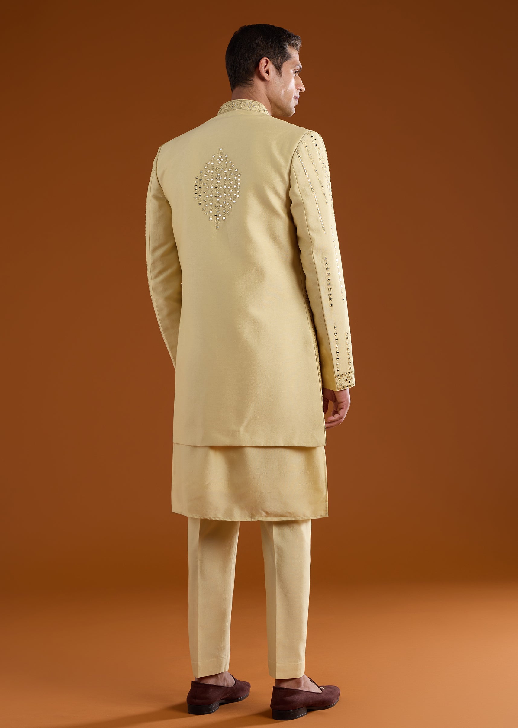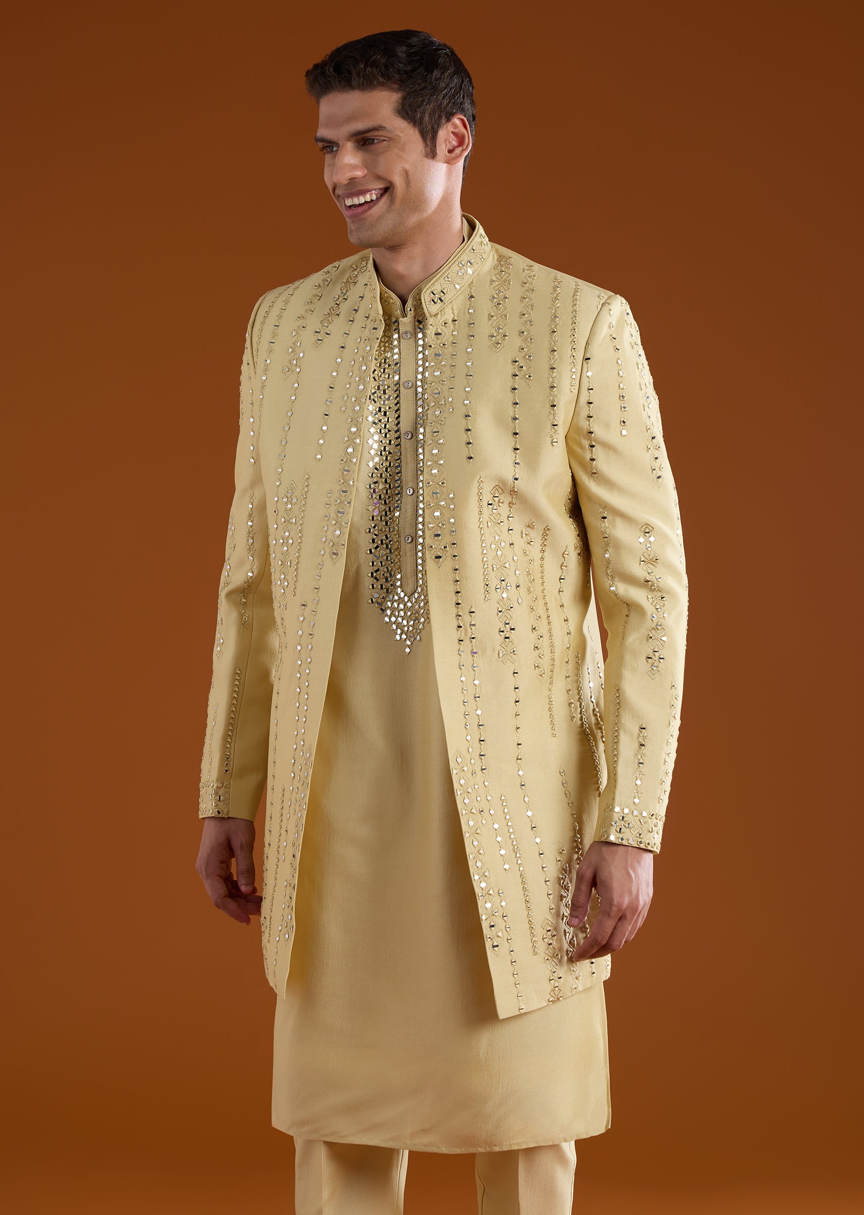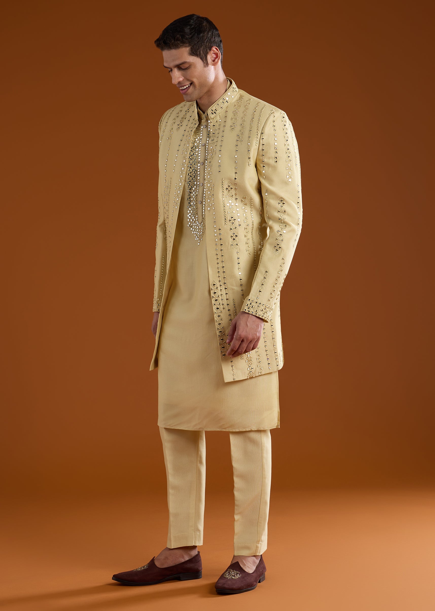 Balanced with tradition and modern finesse, this silk indo western kurta set is designed for elegant festive dressing. The kurta is adorned with mirror accents and refined thread and resham embroidery, adding subtle shine and texture. Full sleeves and a mandarin collar give the silhouette a sharp, structured appeal while maintaining ethnic charm. Paired with coordinated pants, this ensemble is ideal for weddings, festive occasions, and celebratory evenings.Awarded as the Most Trusted Brand, we're delivering styles you love, just as promised.