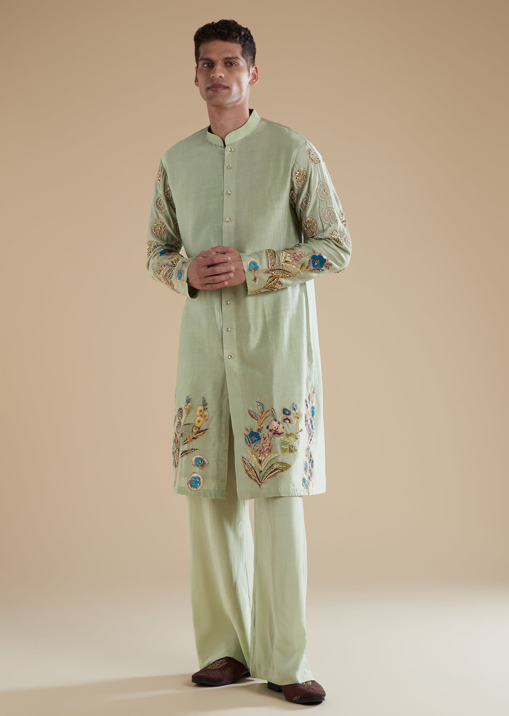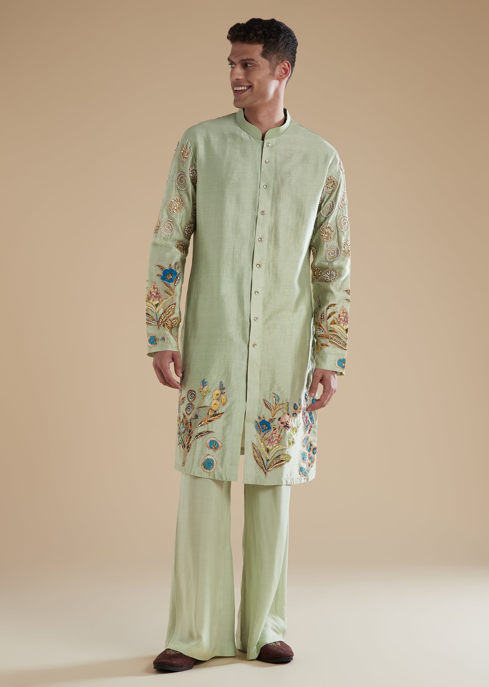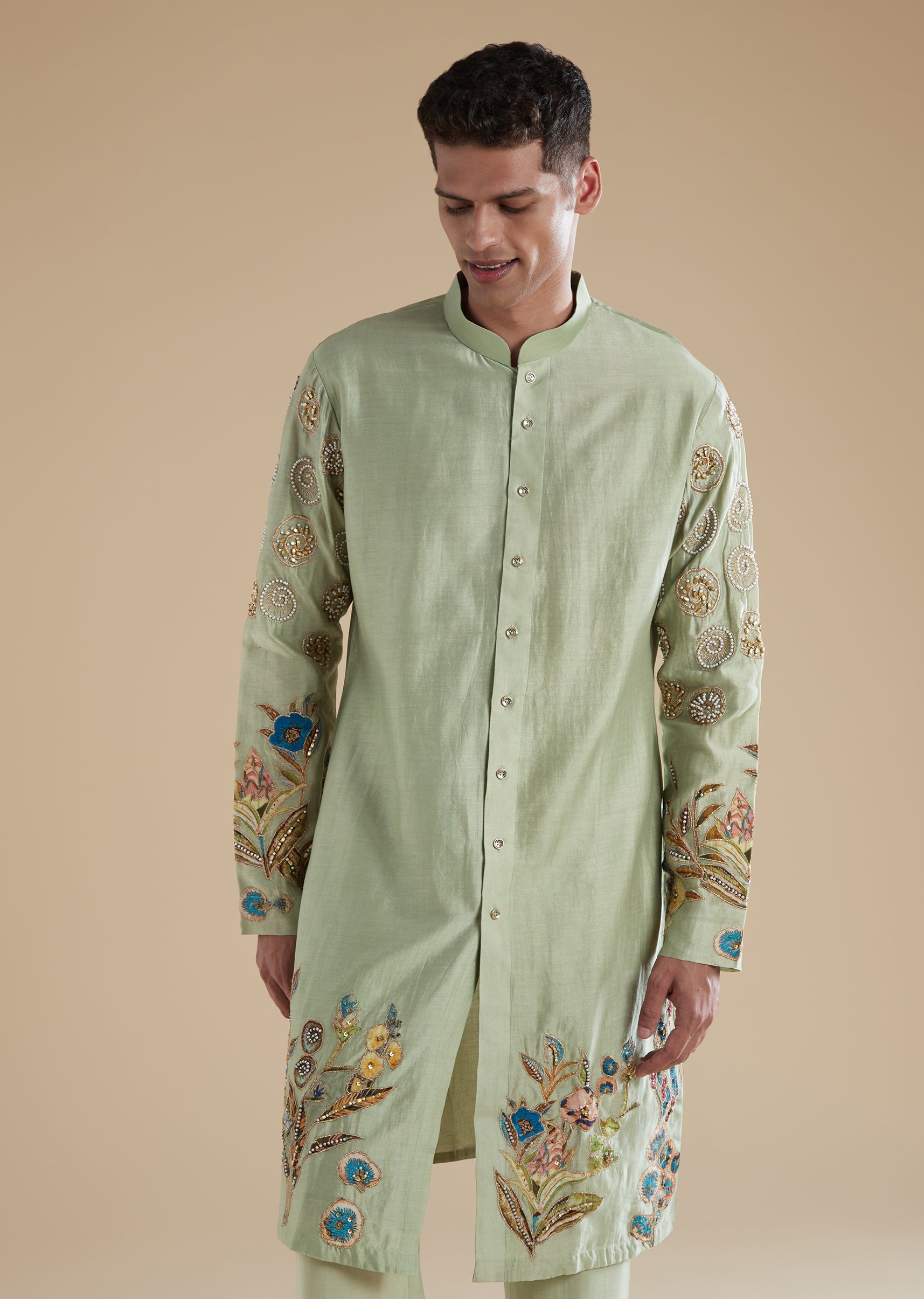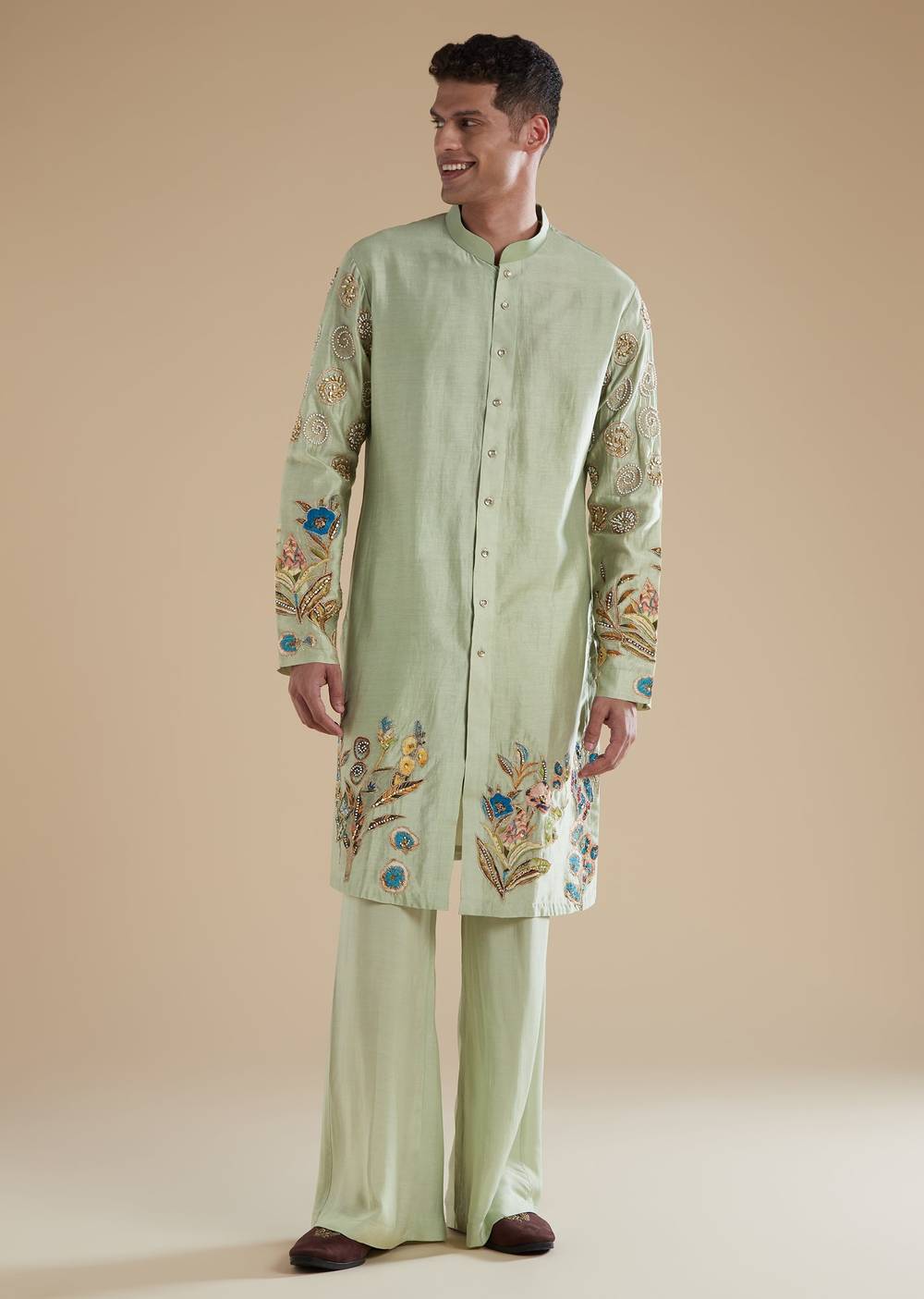 Pista Green Silk Mens Kurta Set with Moti Thread Resham Detail Work
