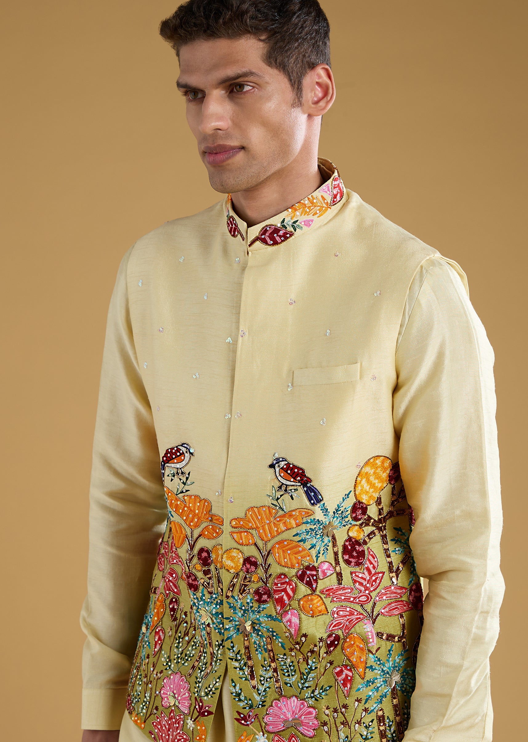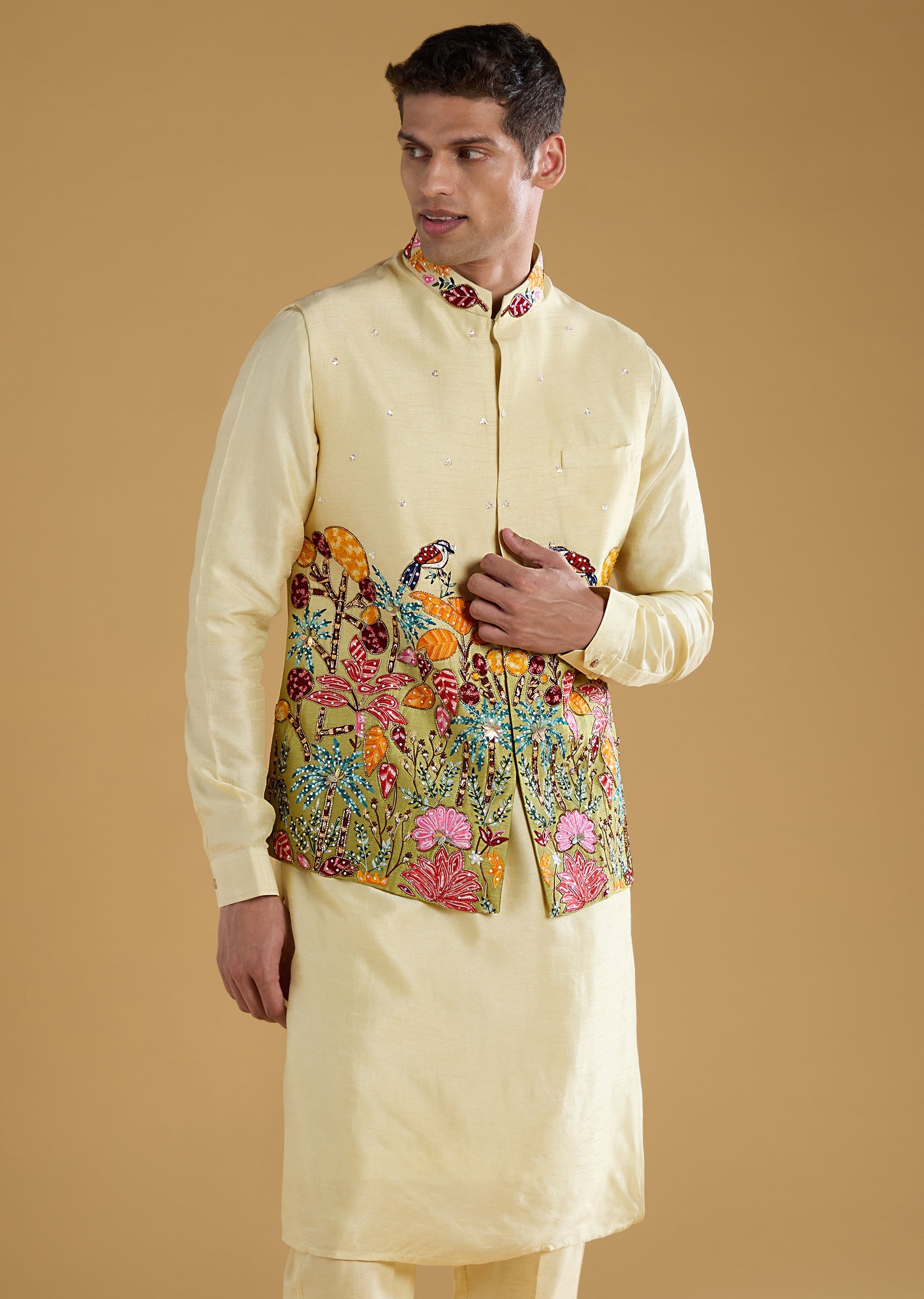 This silk jacket set brings together the richness of resham threadwork and zardosi detailing for a look that radiates regal charm. The mandarin collar and full sleeves add a polished, classic touch, making it perfect for celebrations and formal gatherings. Paired with a matching kurta and pants, it delivers an elegant layered silhouette. A refined choice for anyone looking to make a sophisticated style statement. Awarded as the Most Trusted Brand, we're delivering styles you love, just as promised.
