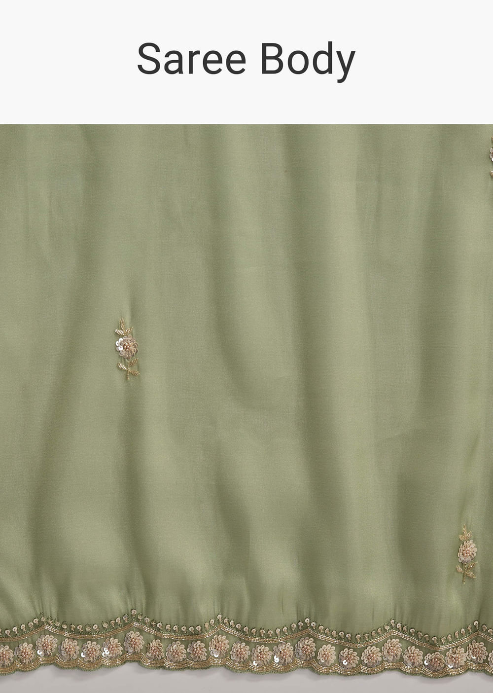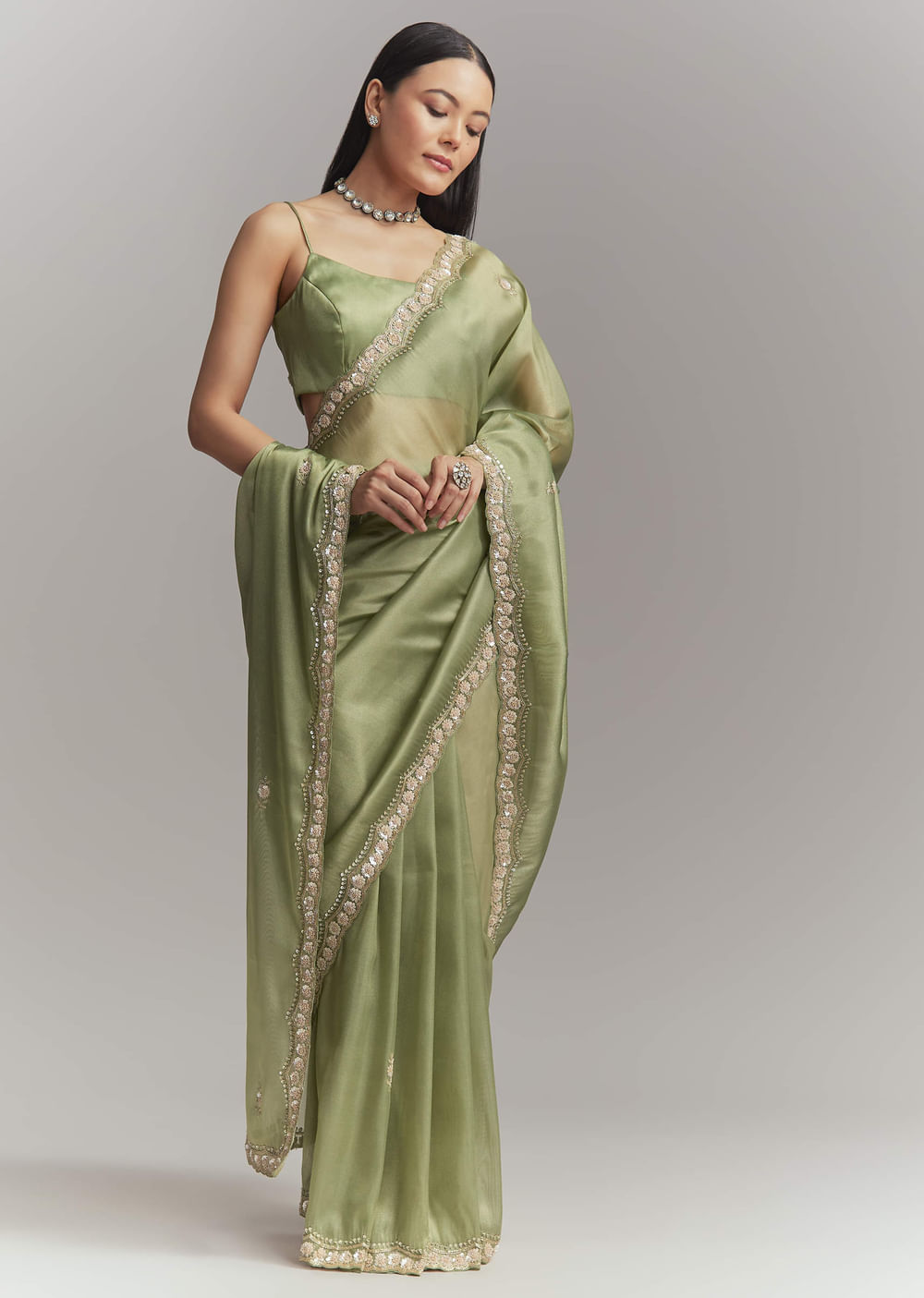 Soft tones feel refreshing, and this pista green tissue embroidered saree is made for lighthearted occasions. The scallop border and buttis sparkle with cutdana, beads, sequins and touches of zardosi.... More Product Details