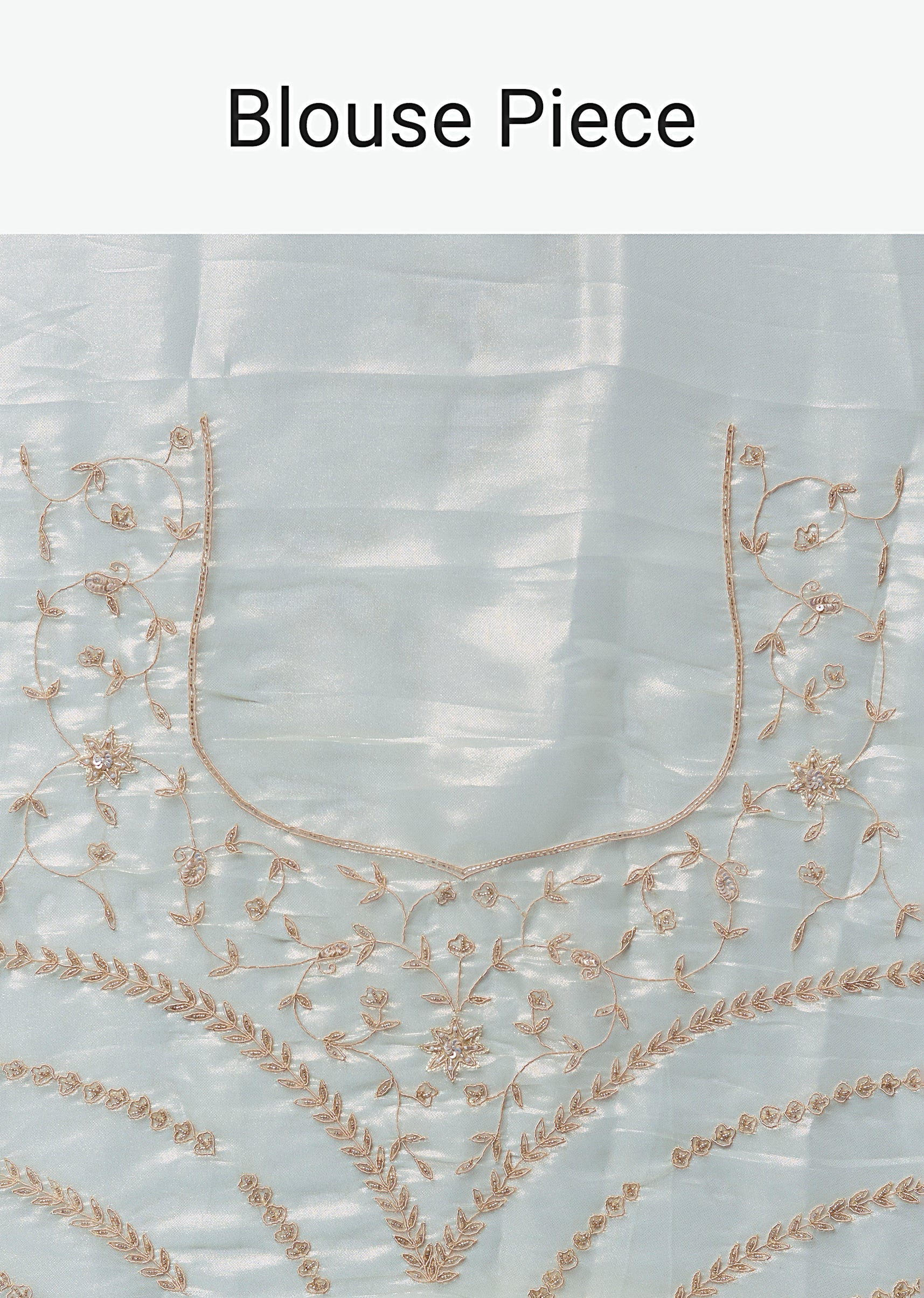 Delicate and elegant, this pista green tissue saree is perfect for mehendi and reception celebrations as a wedding guest. The soft pastel shade is complemented by a refined cutwork border intricately embroidered with cutdana, beads, sequins, and detailed zardosi, creating a subtle shimmer without overwhelming the minimal design. The saree comes with unstitched blouse fabric featuring matching embroidery, allowing a customized and graceful fit. Ideal for daytime and evening festivities, this ensemble exudes understated sophistication and festive charm. Awarded as the Most Trusted Brand, we're delivering styles you love, just as promised.