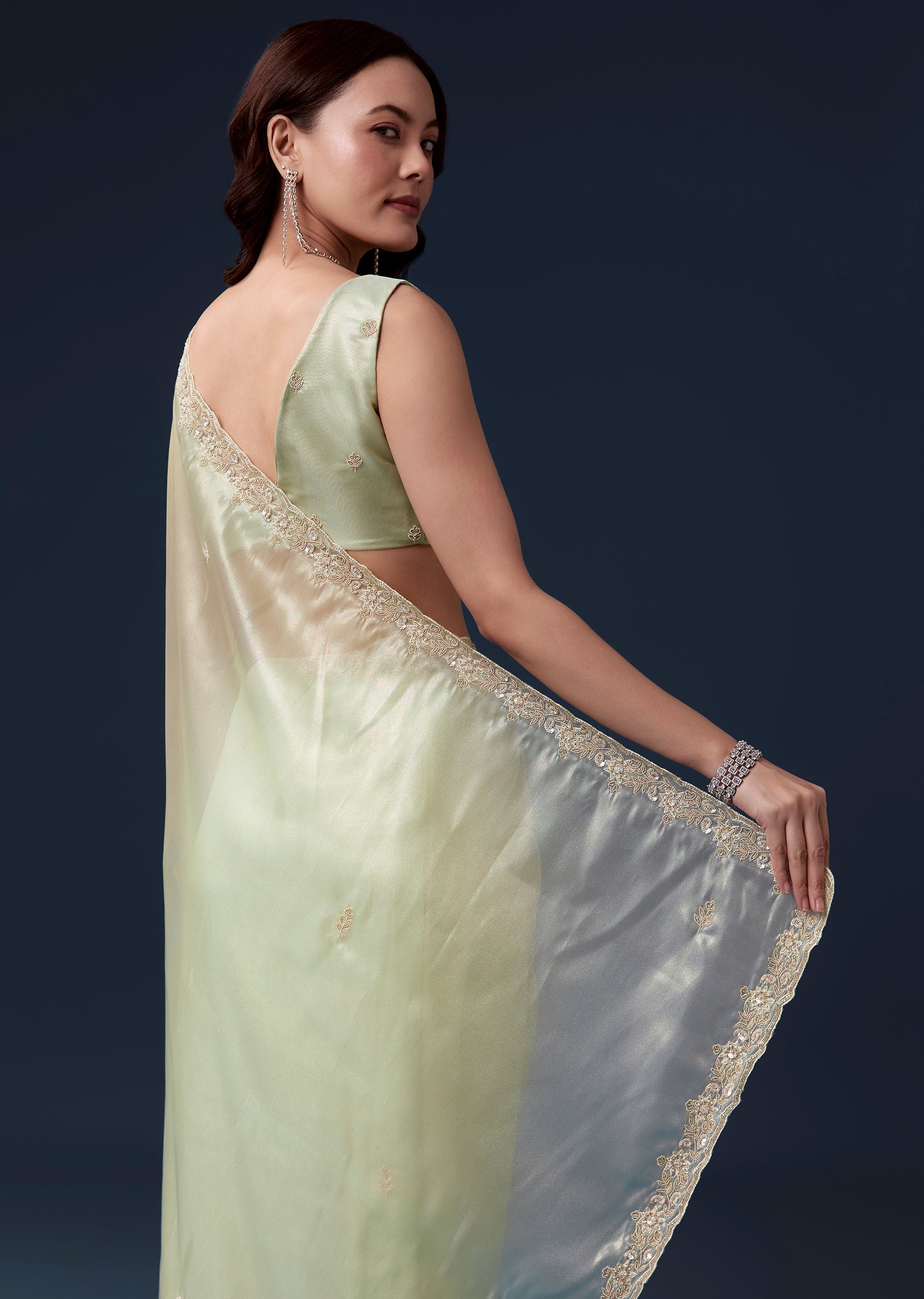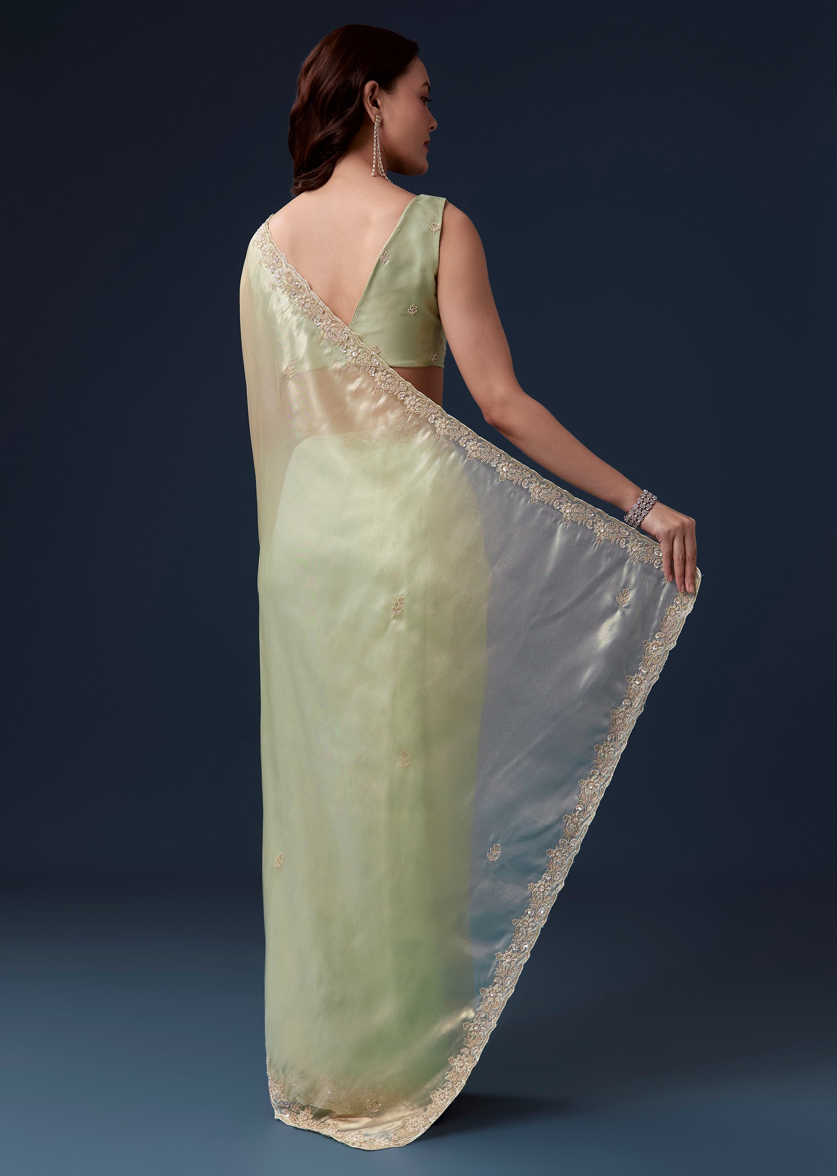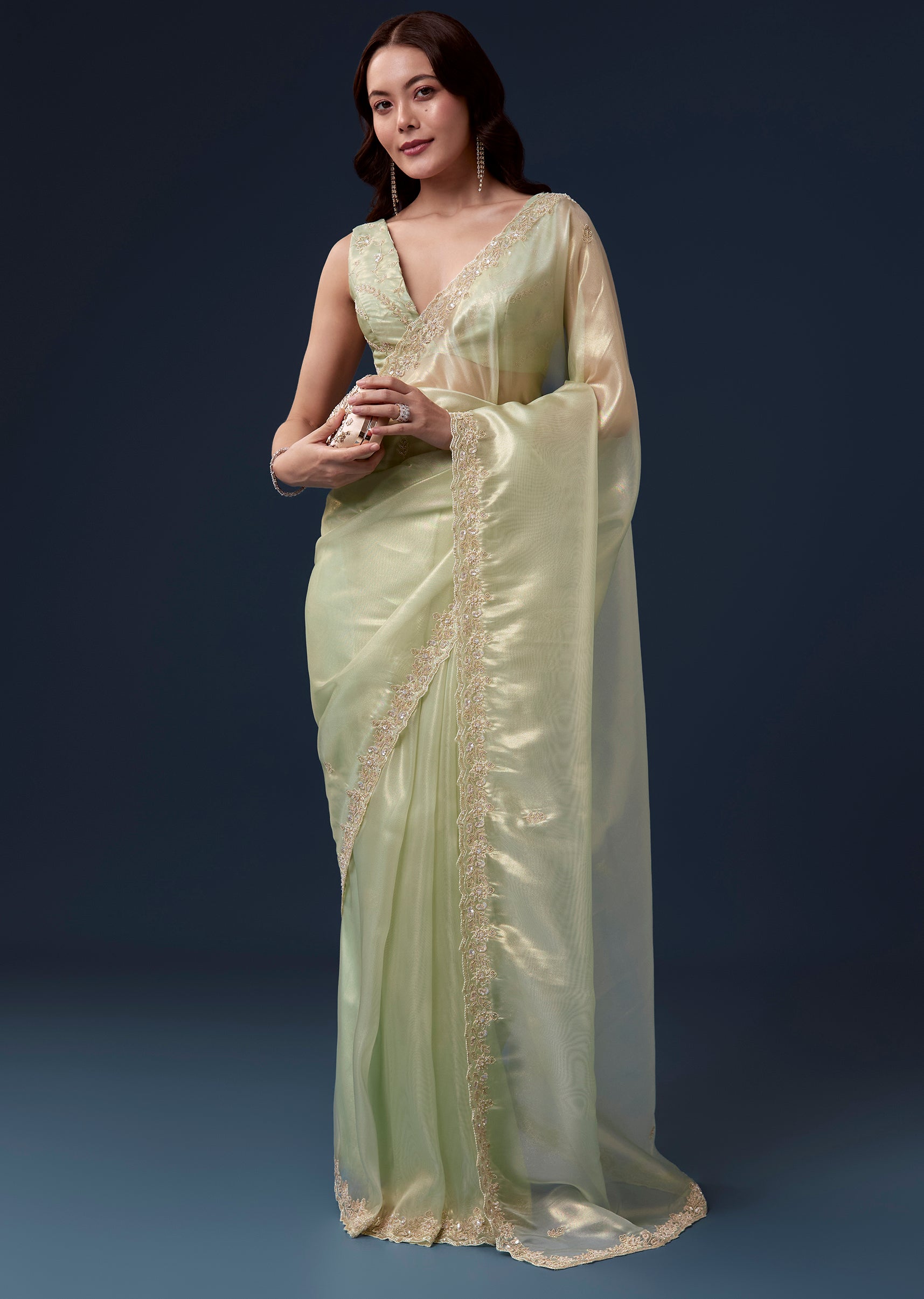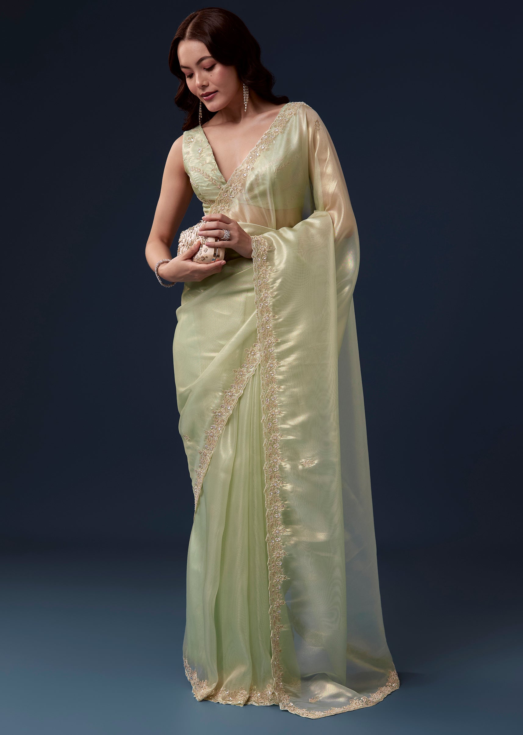 Pista Green Tissue Saree With Cutdana Beads Sequins And Zardosi Work