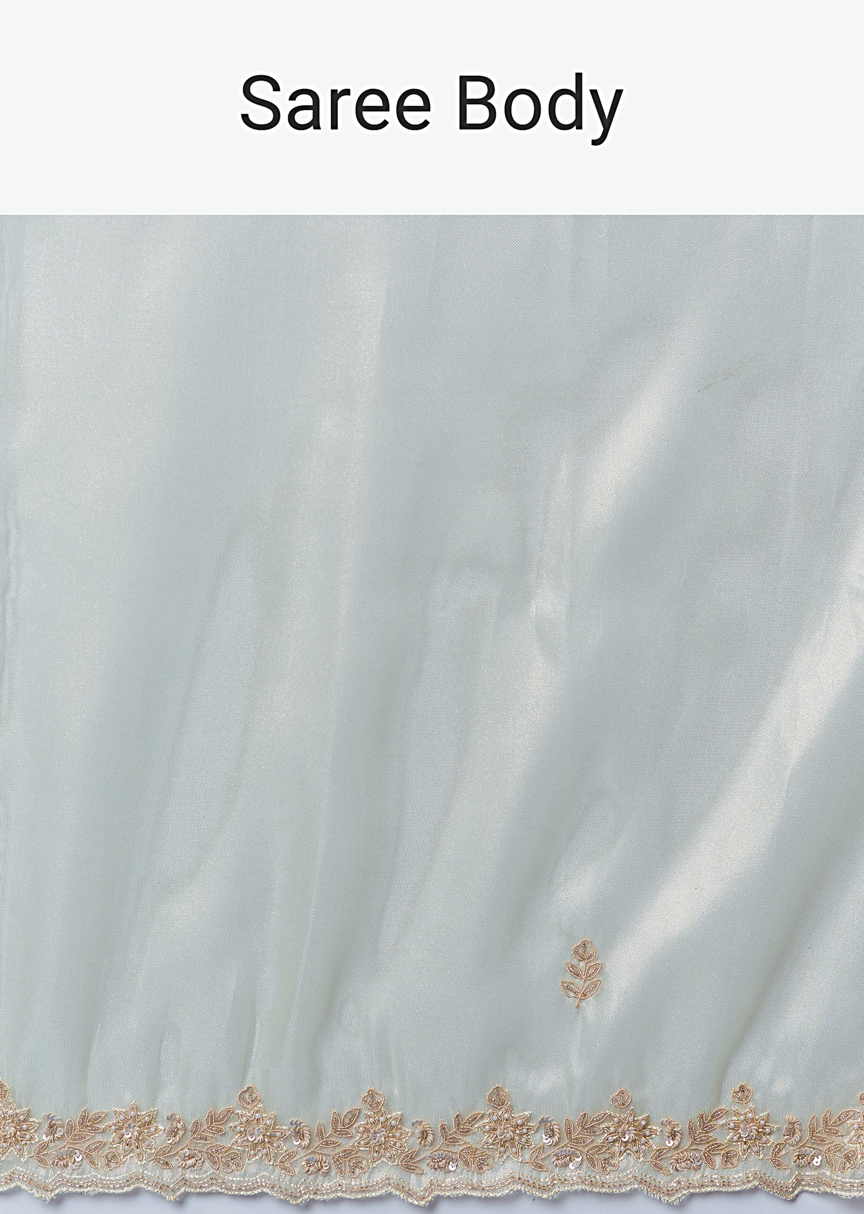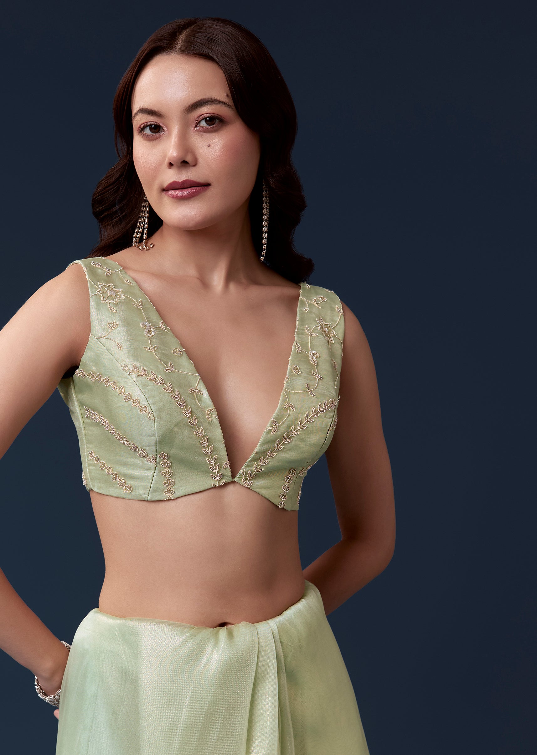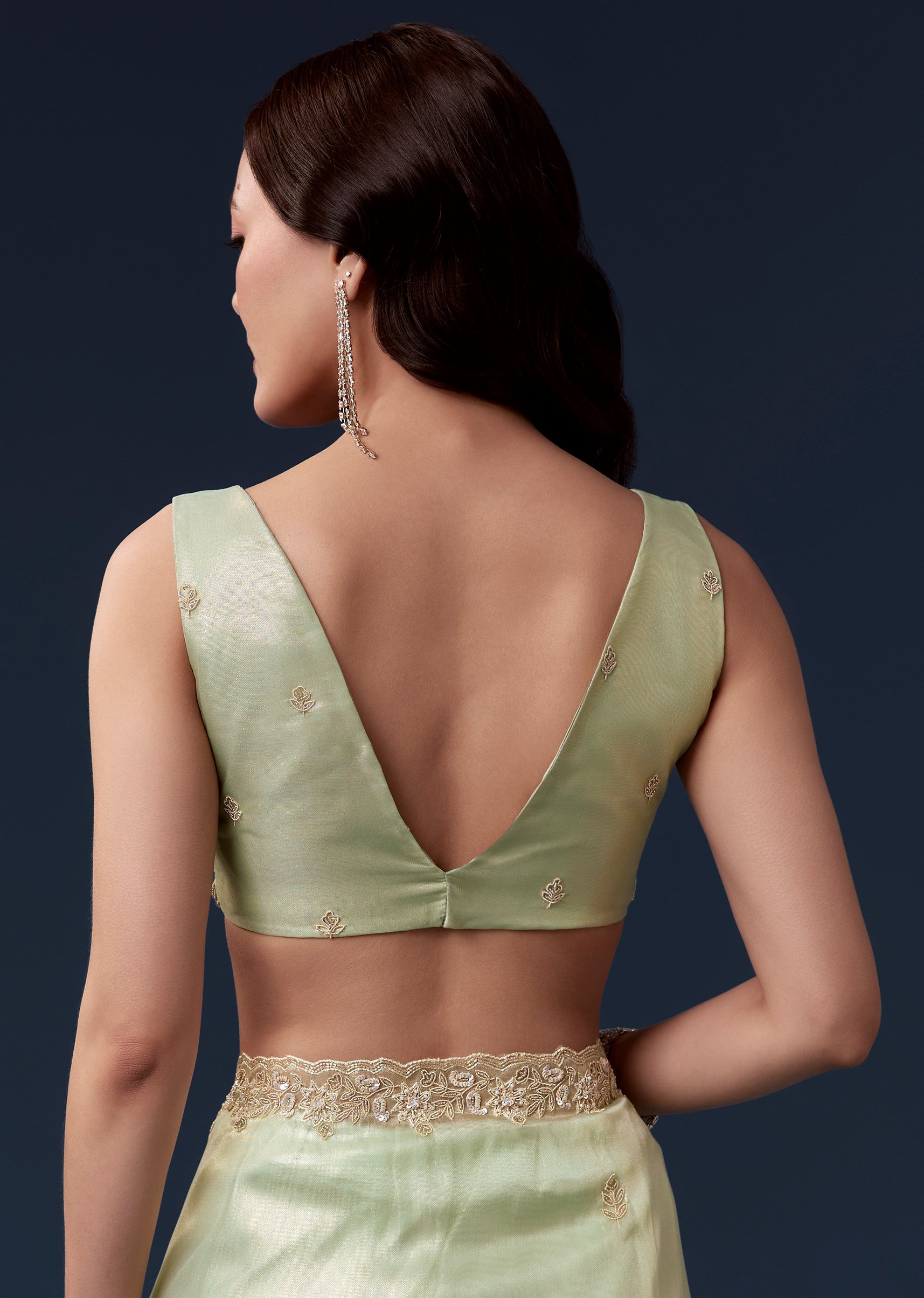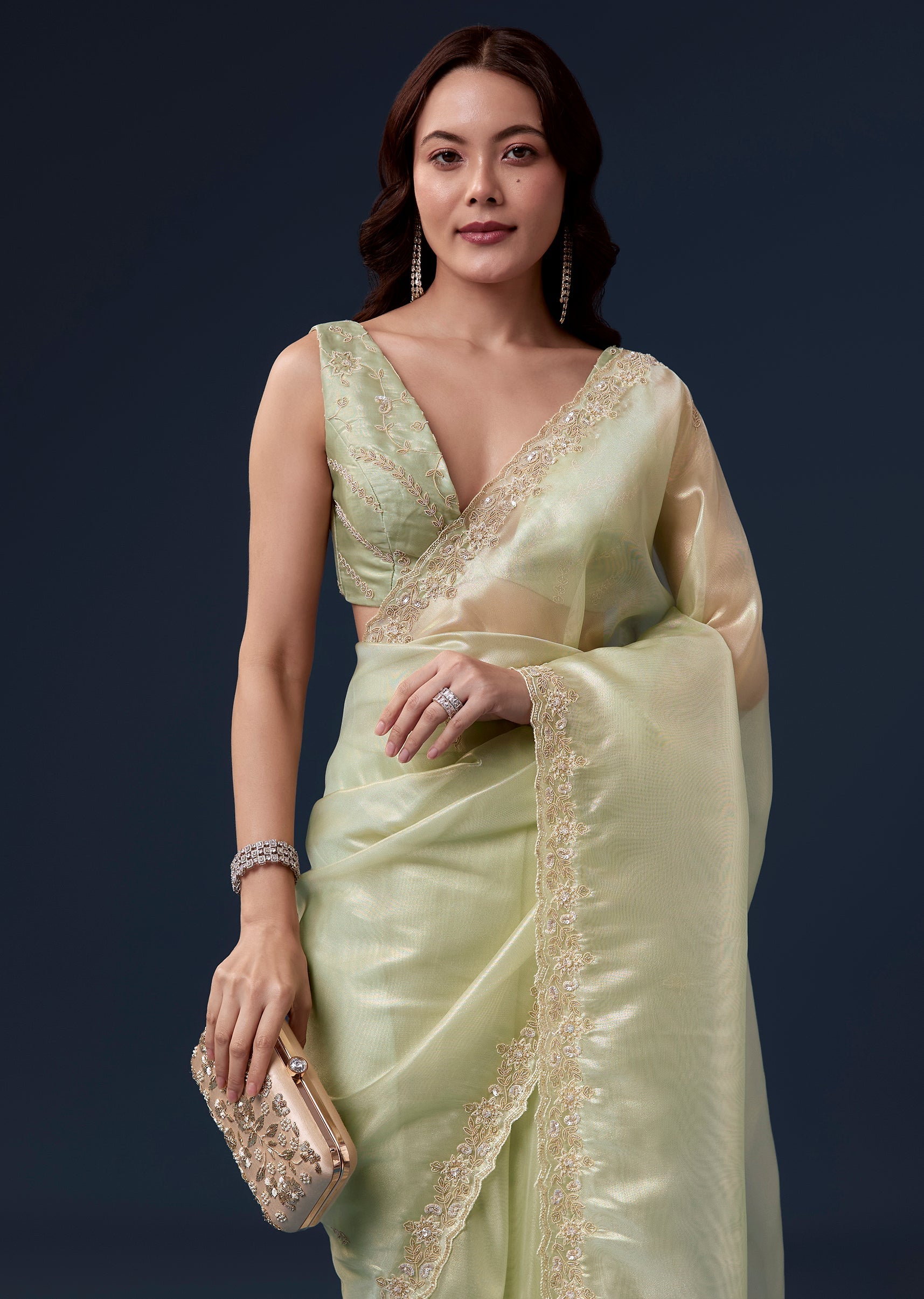 Pista Green Tissue Saree With Cutdana Beads Sequins And Zardosi Work