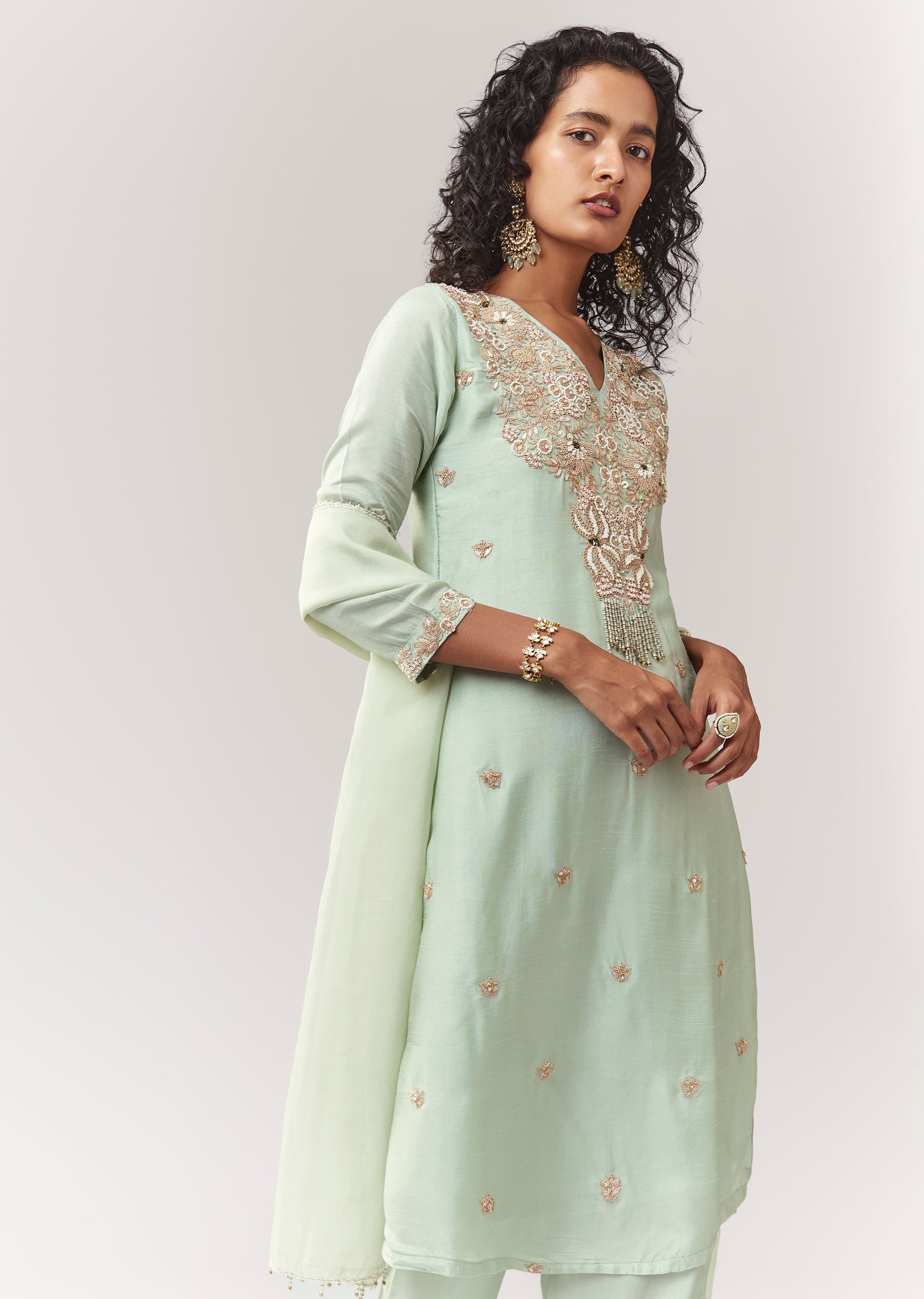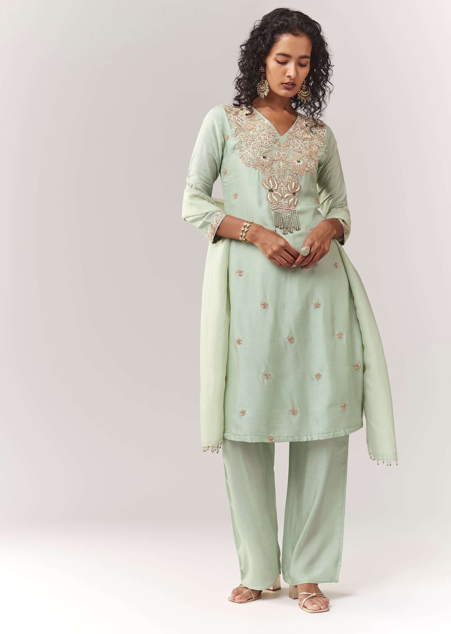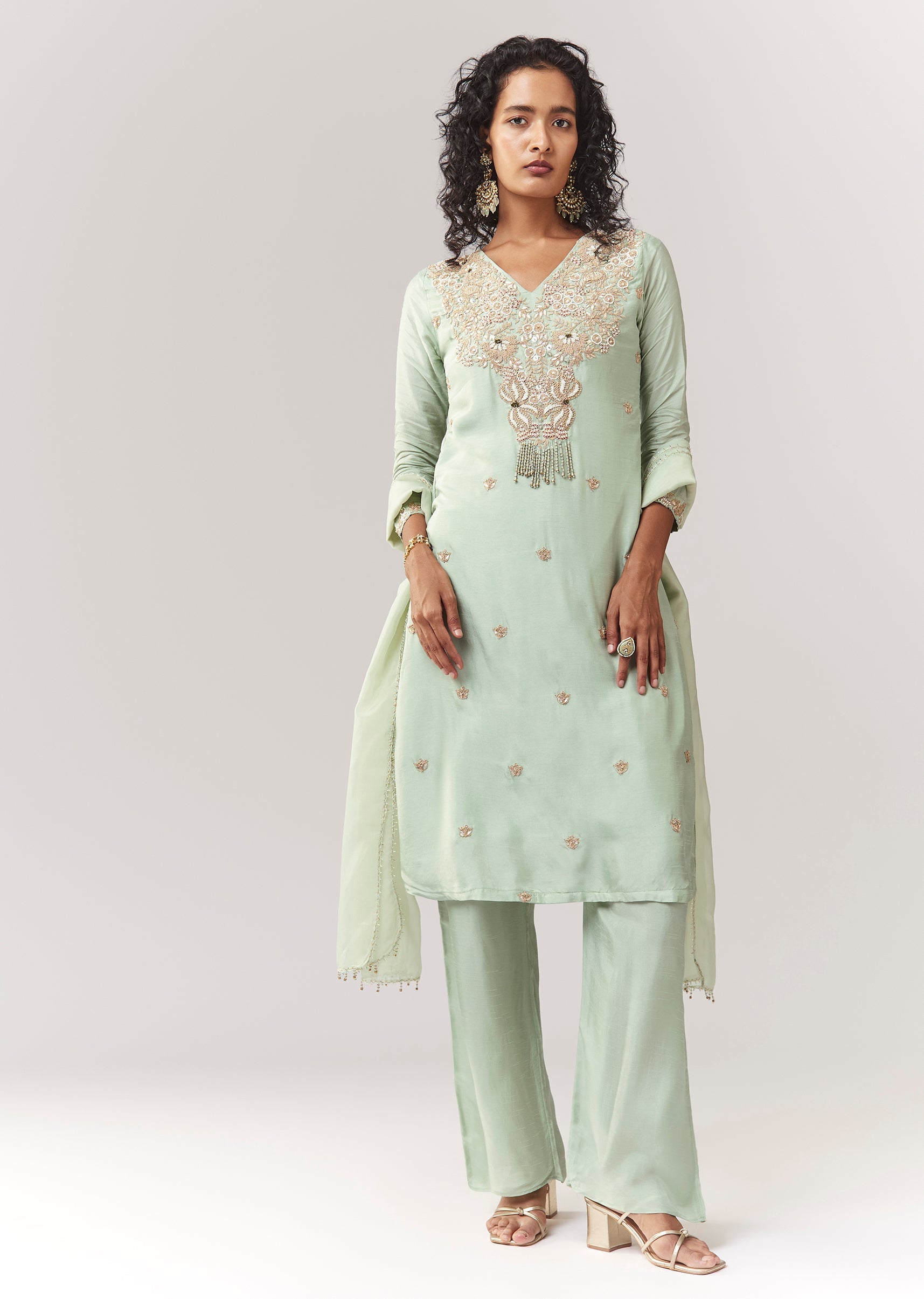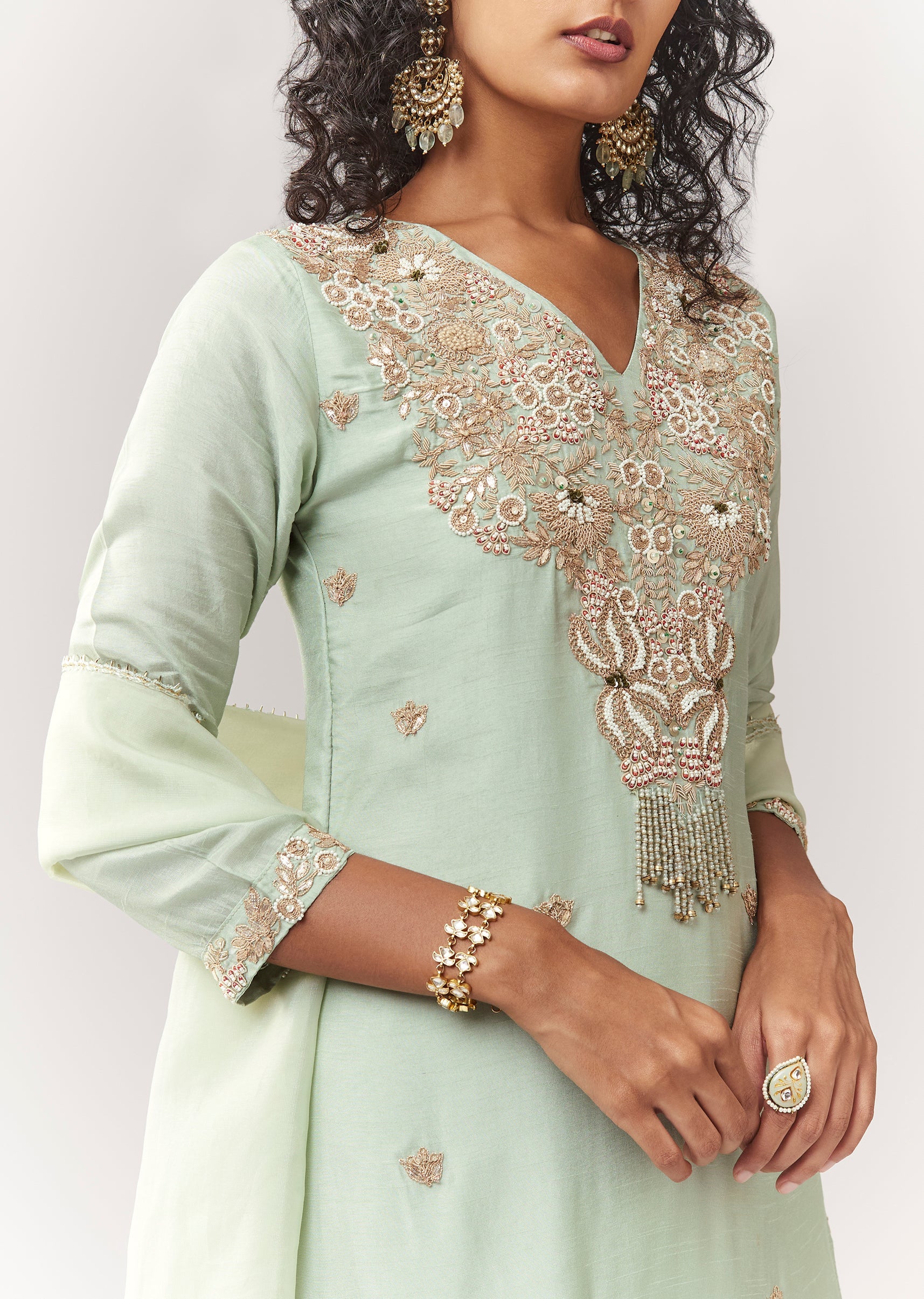 Pista Green Zardosi And Moti Work Kurta Palazzo Set With Dupatta