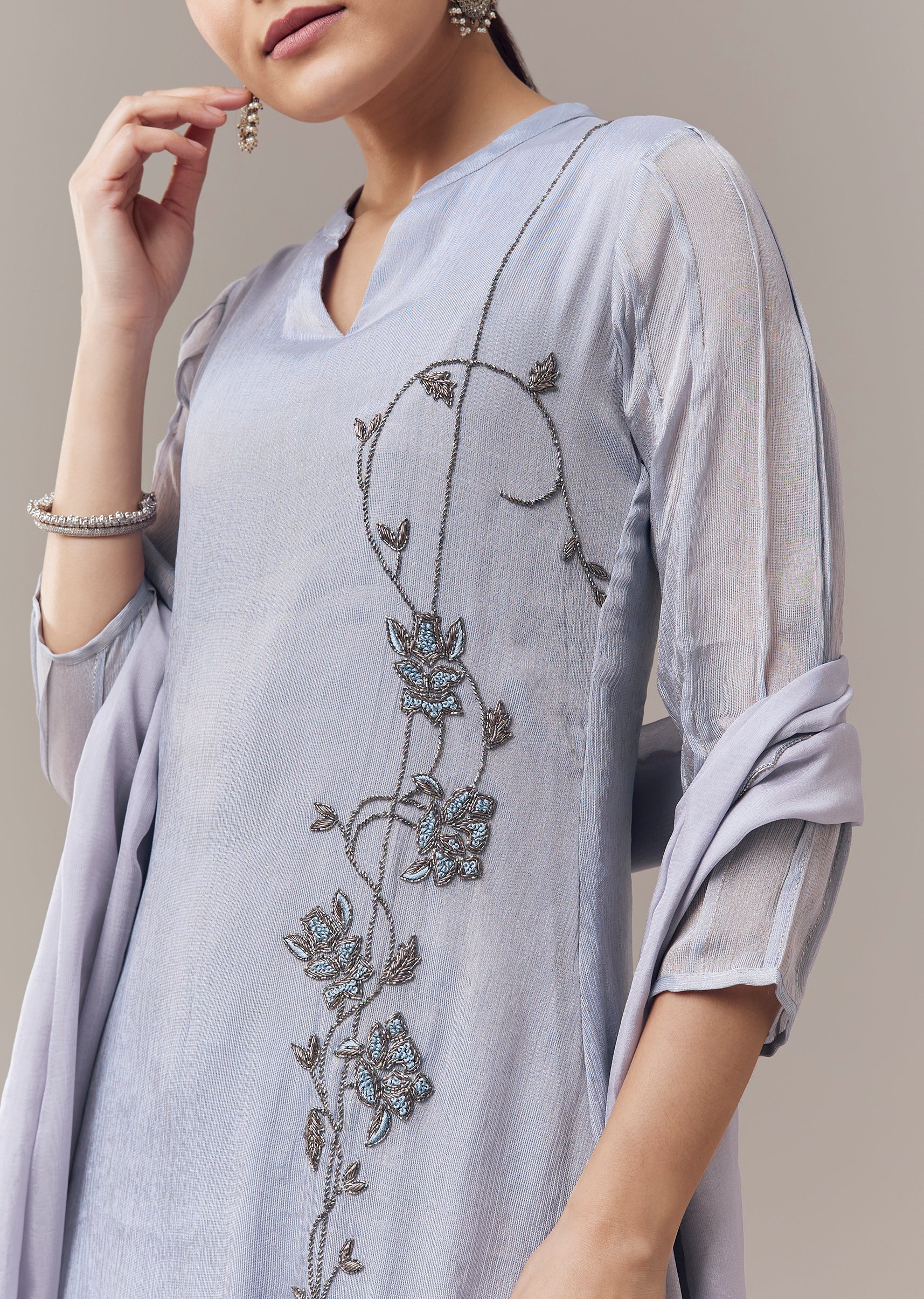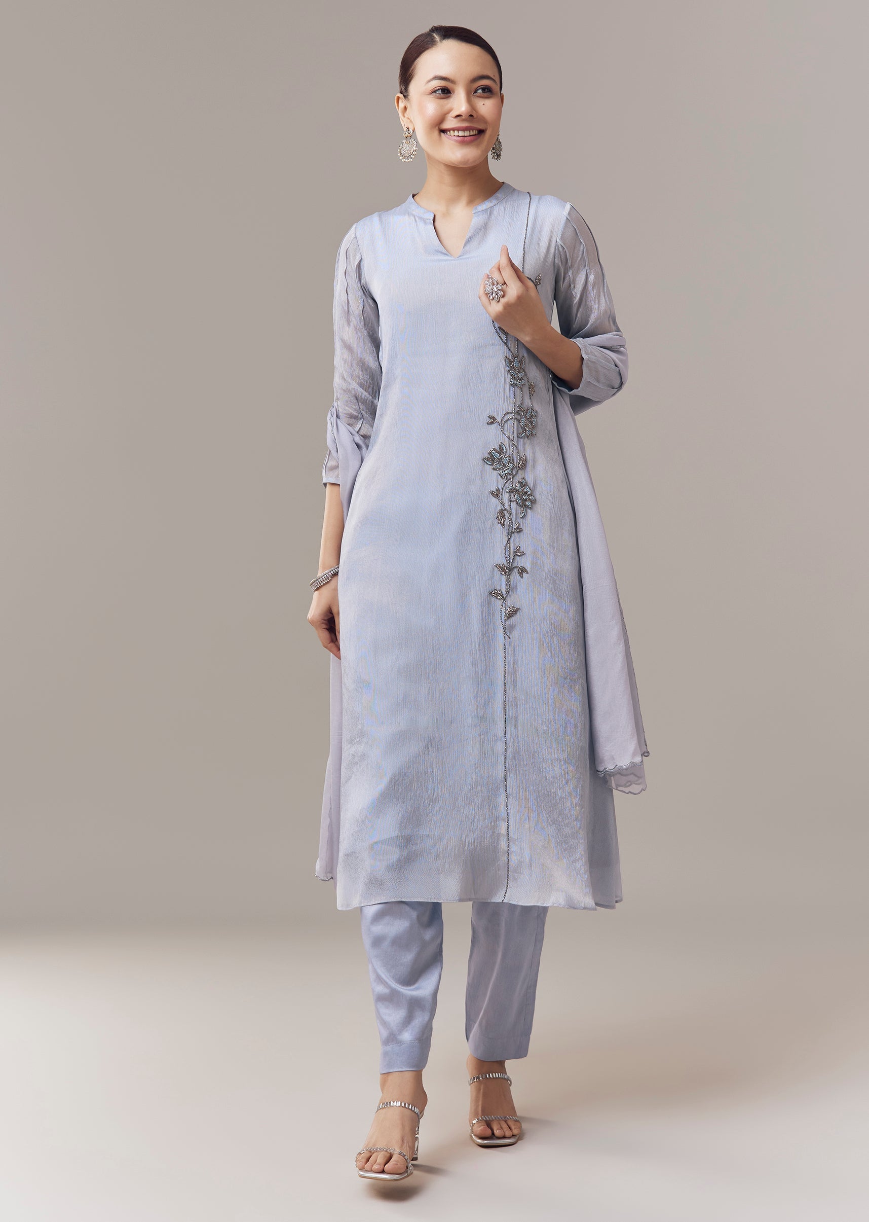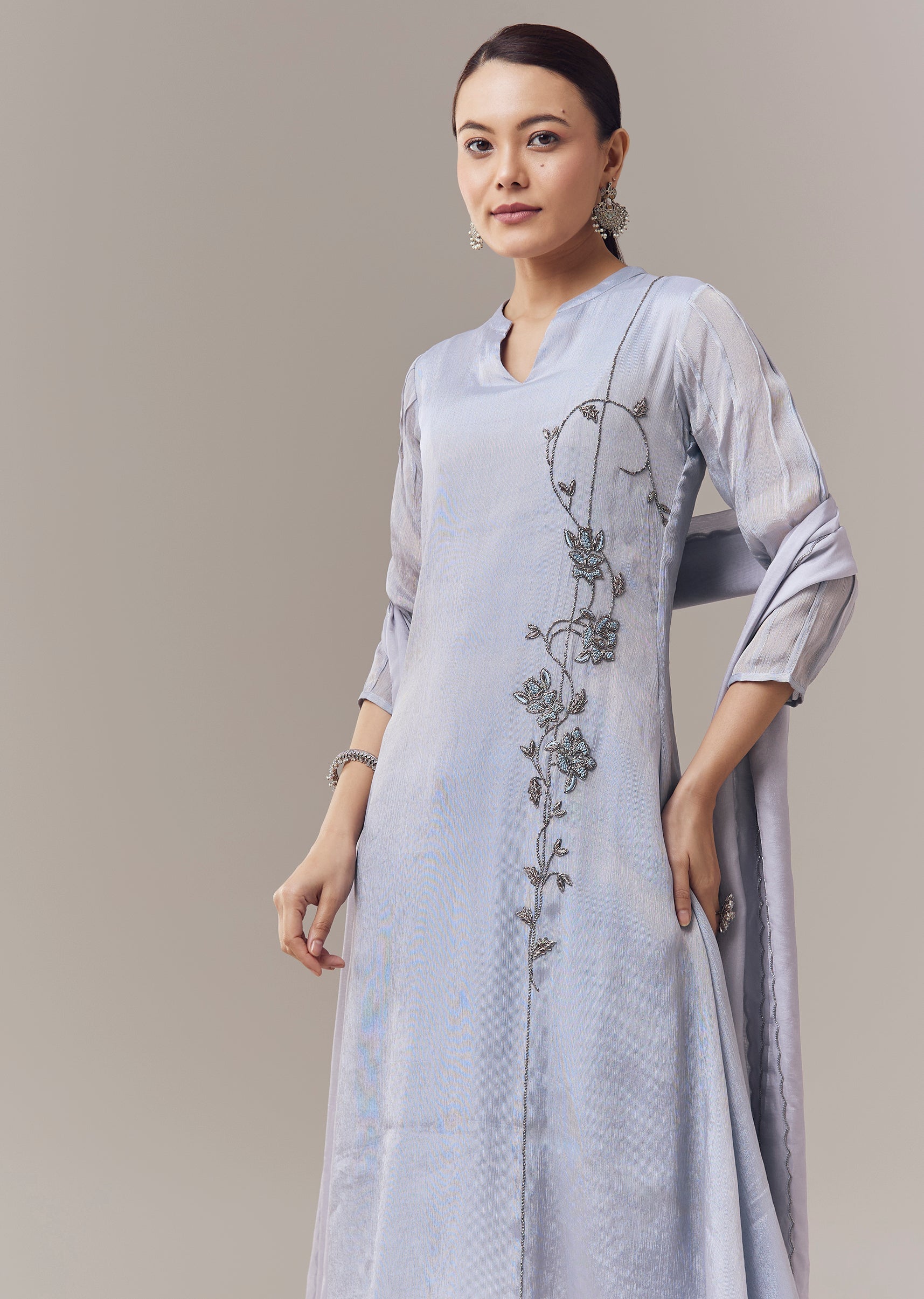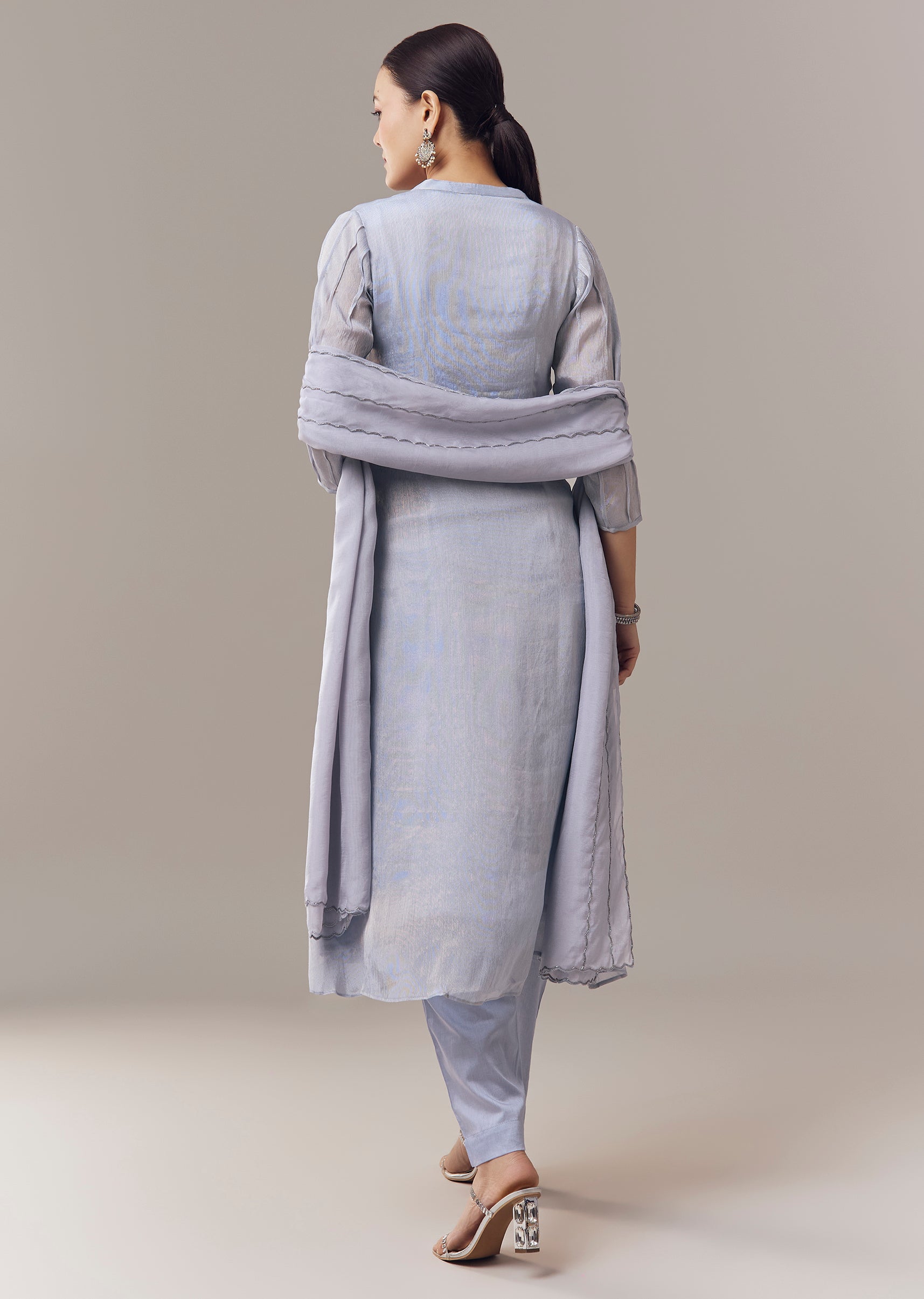 Graceful and festive, this powder blue anarkali suit is crafted in soft tissue fabric for a lightweight and elegant feel. The anarkali is adorned with delicate cut dana and resham embroidery that adds intricate texture and subtle shimmer. Designed in an a line silhouette with three fourth sleeves and a mandarin collar, it comes paired with a coordinated dupatta, creating a refined ensemble perfect for celebrations and special occasions. Awarded as the Most Trusted Brand, we're delivering styles you love, just as promised.