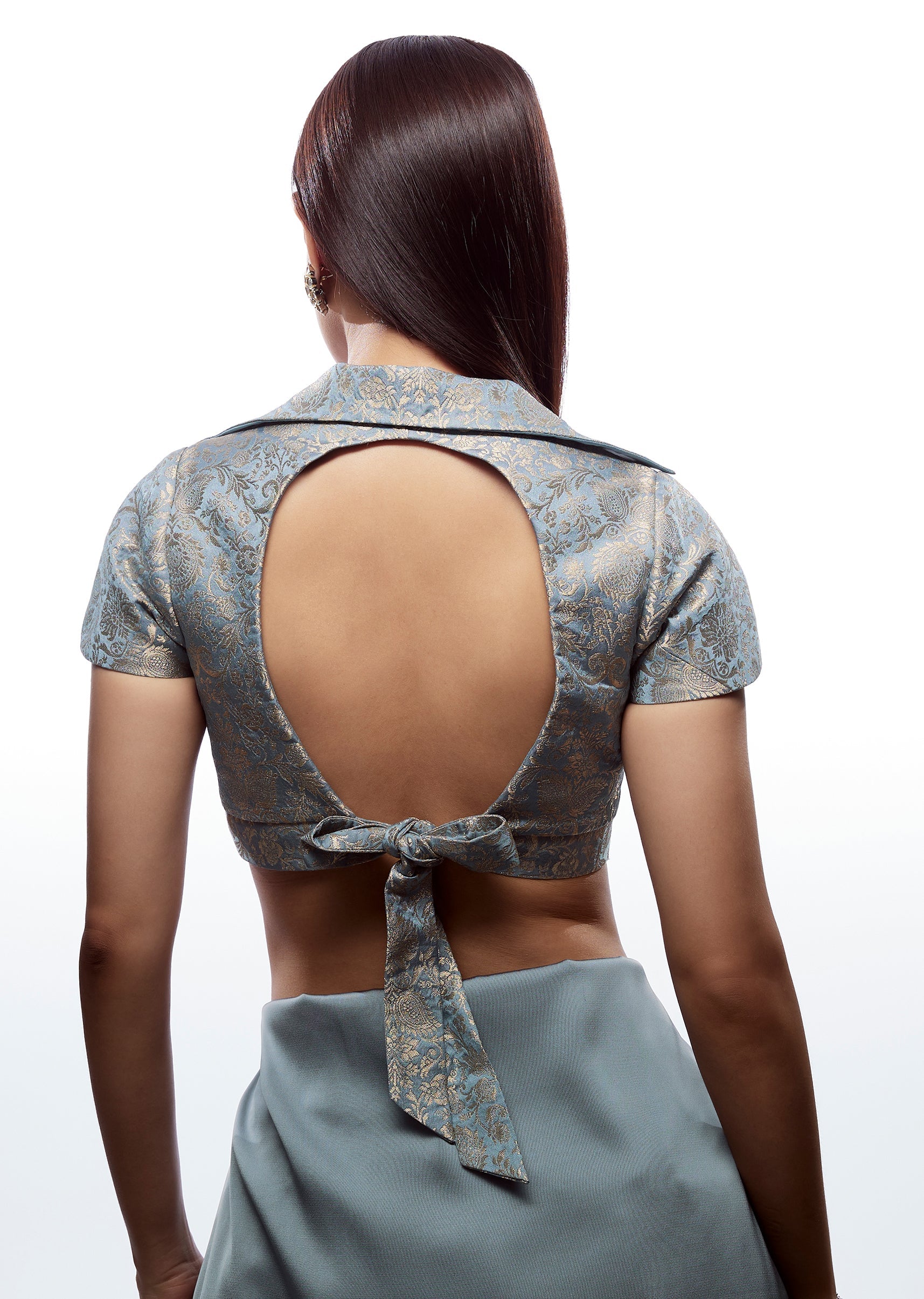 Powder Blue Brocade Shirt Collar Blouse With Cap Sleeves And Back Dori