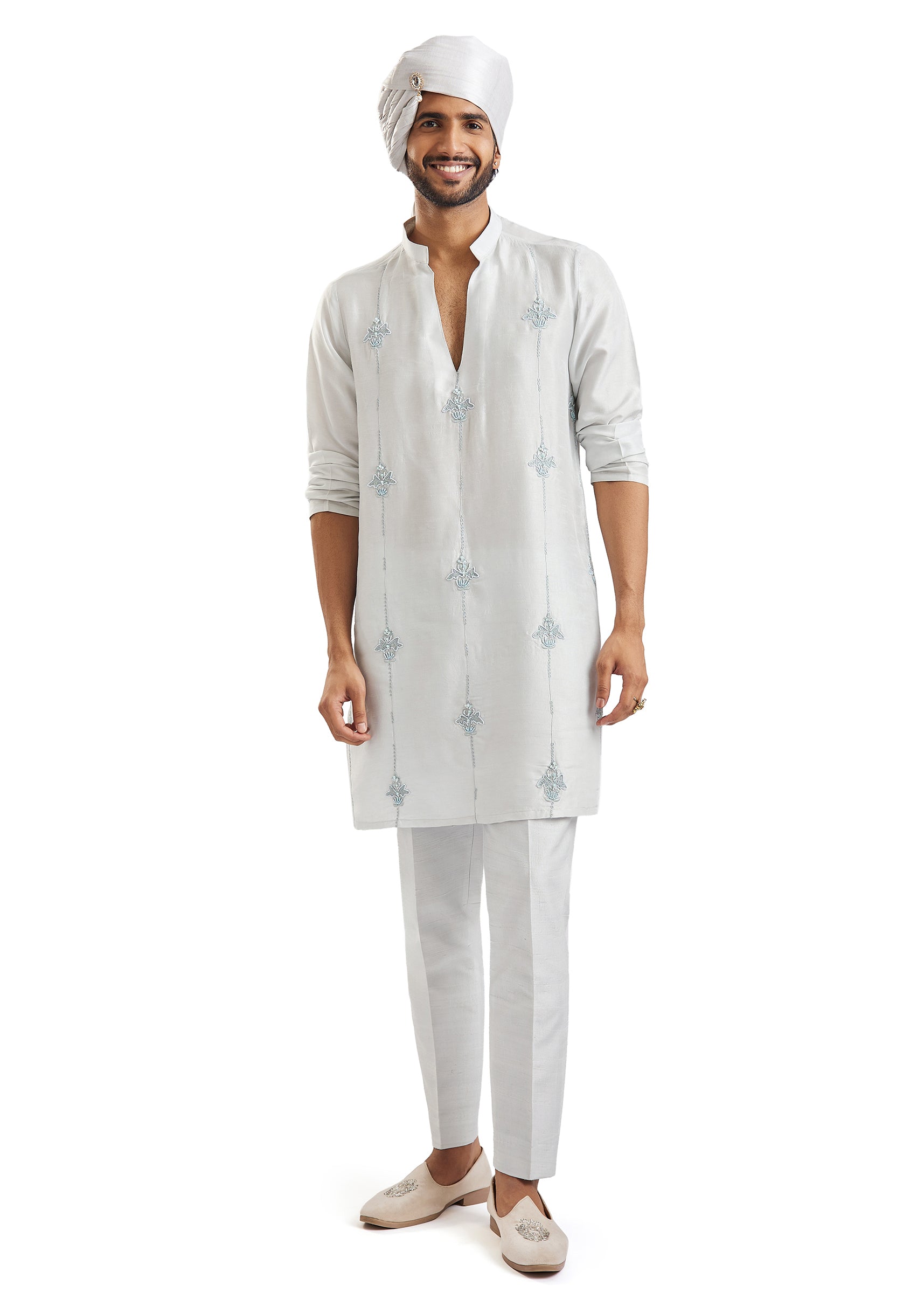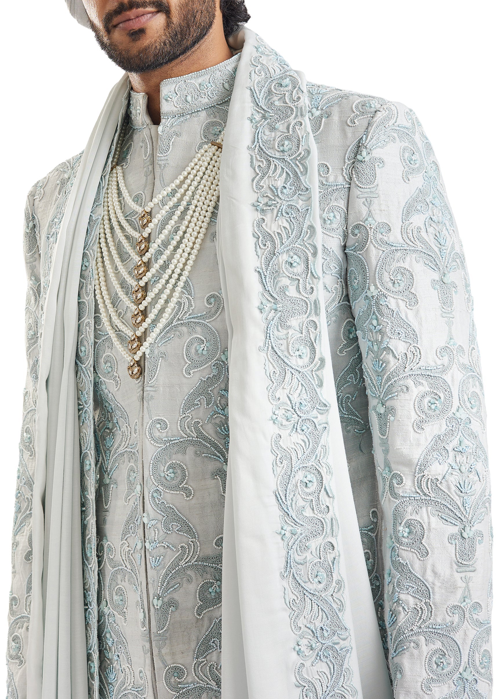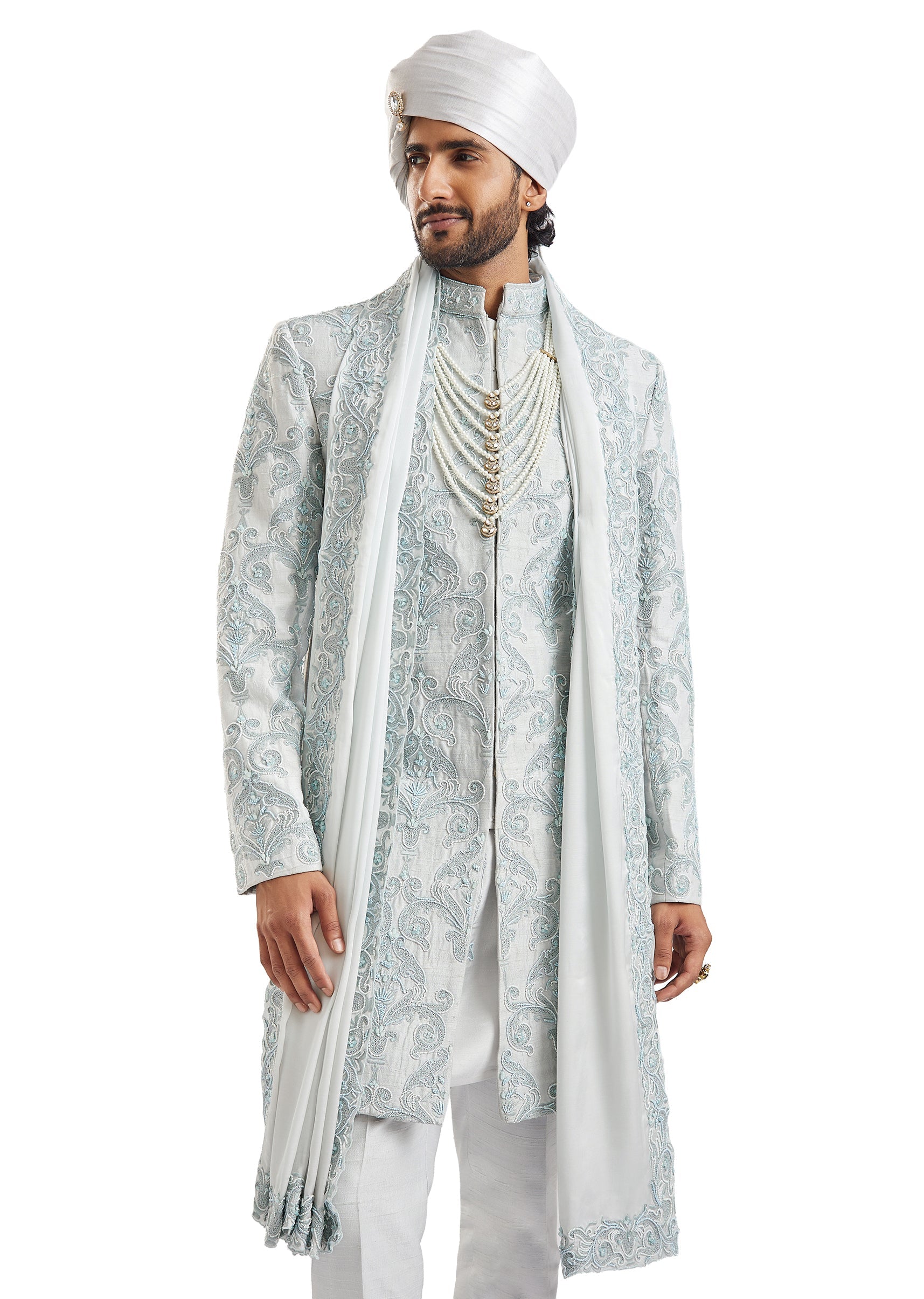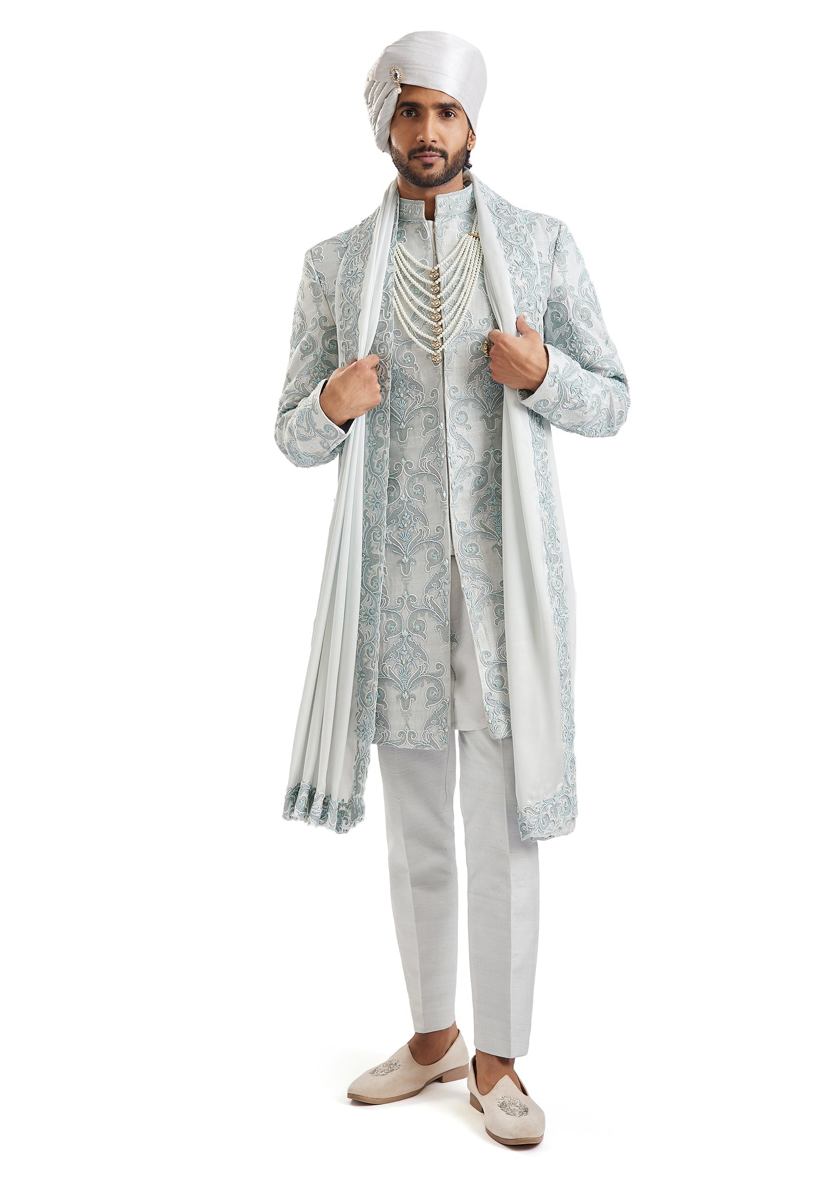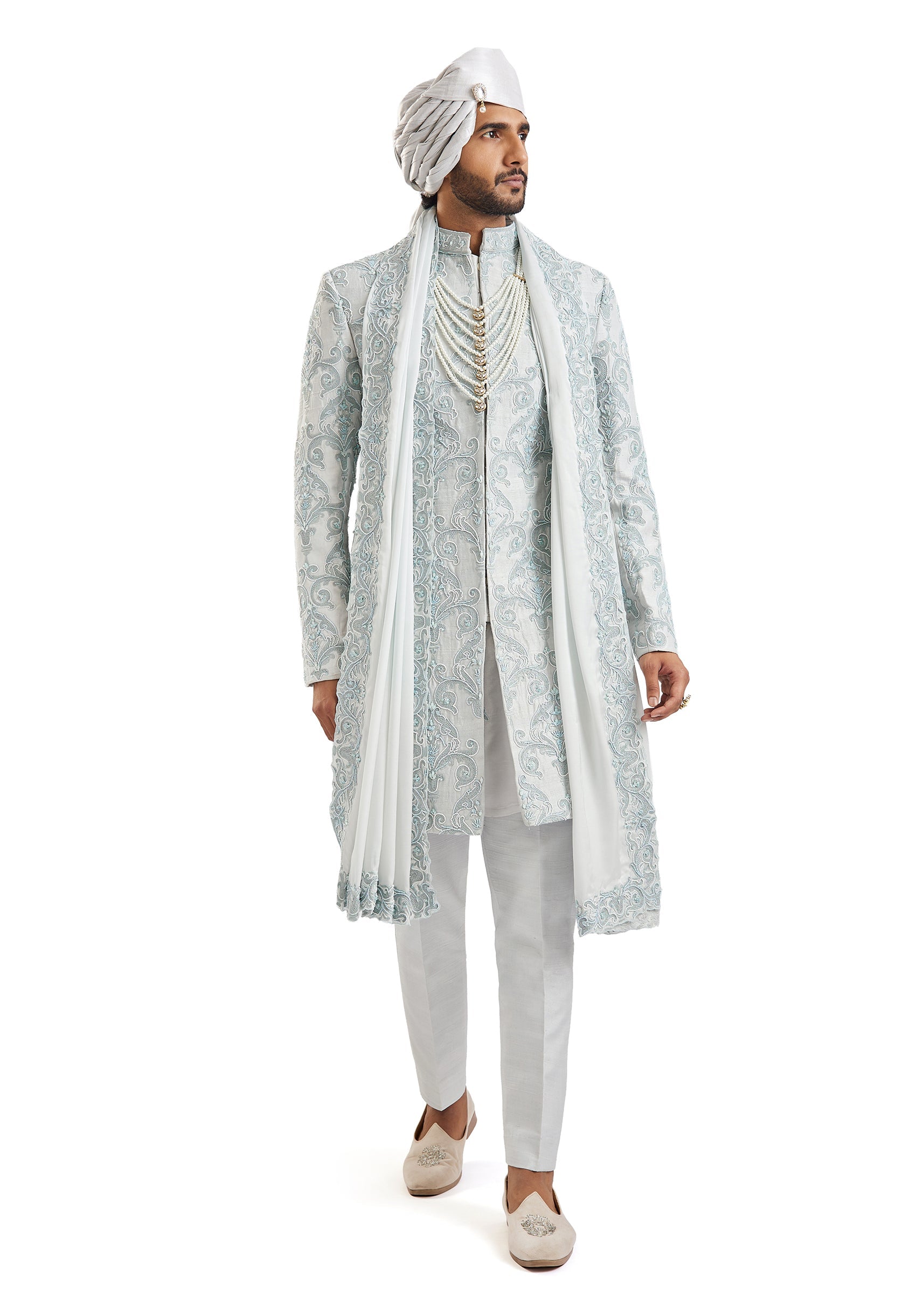 Cool, serene, and undeniably regal — this powder blue groom's sherwani in silk and chanderi silk features meticulous self-embroidery with aari, cut work, french knots, and sequins across its entire length. The two-sherwani set paired with kurta, pants, a stole, and safa offers incredible flexibility for grooms who want to coordinate multiple wedding looks. A sophisticated, contemporary choice for the phera ceremony. Awarded as the Most Trusted Brand, we're delivering styles you love, just as promised.