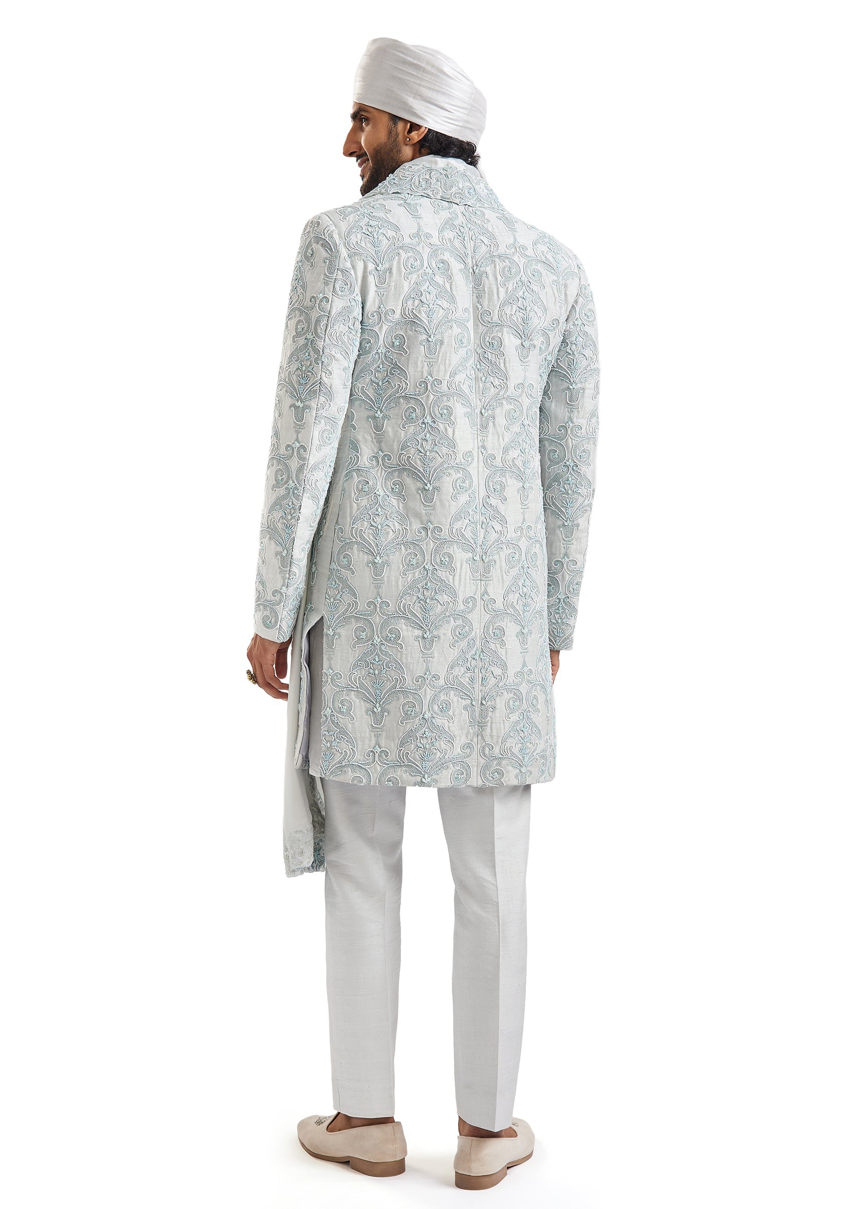 Cool, serene, and undeniably regal — this powder blue groom's sherwani in silk and chanderi silk features meticulous self-embroidery with aari, cut work, french knots, and sequins across its entire... More Product Details