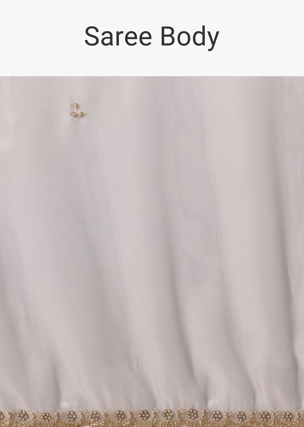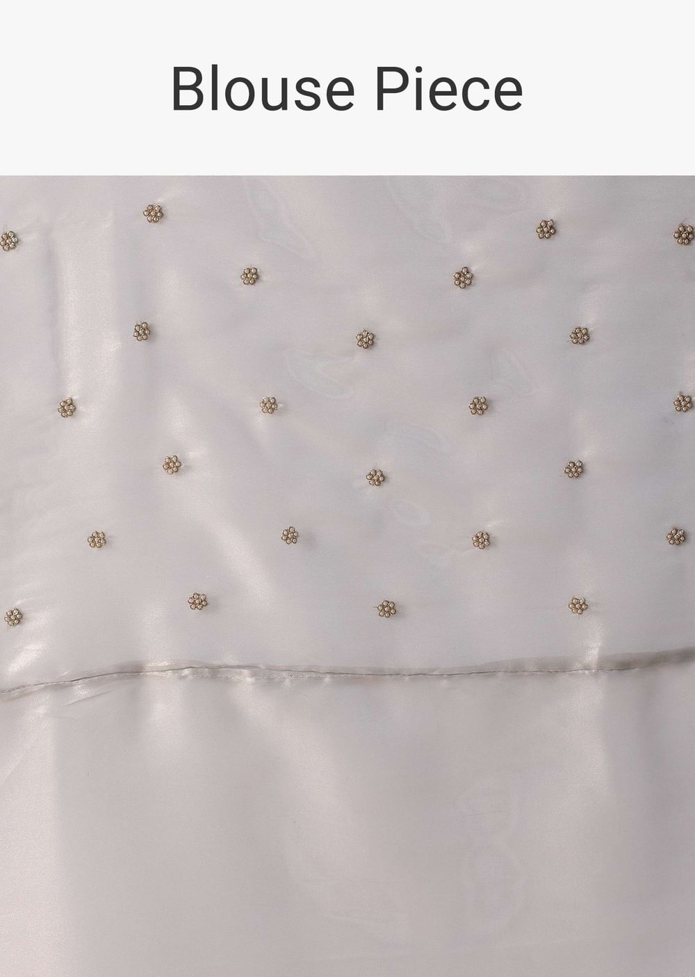 Experience pure opulence with our stunning powder green saree. Adding to its grandeur, the saree is adorned with a foil print along with intricate pearl and cut dana embroidery on... More Product Details