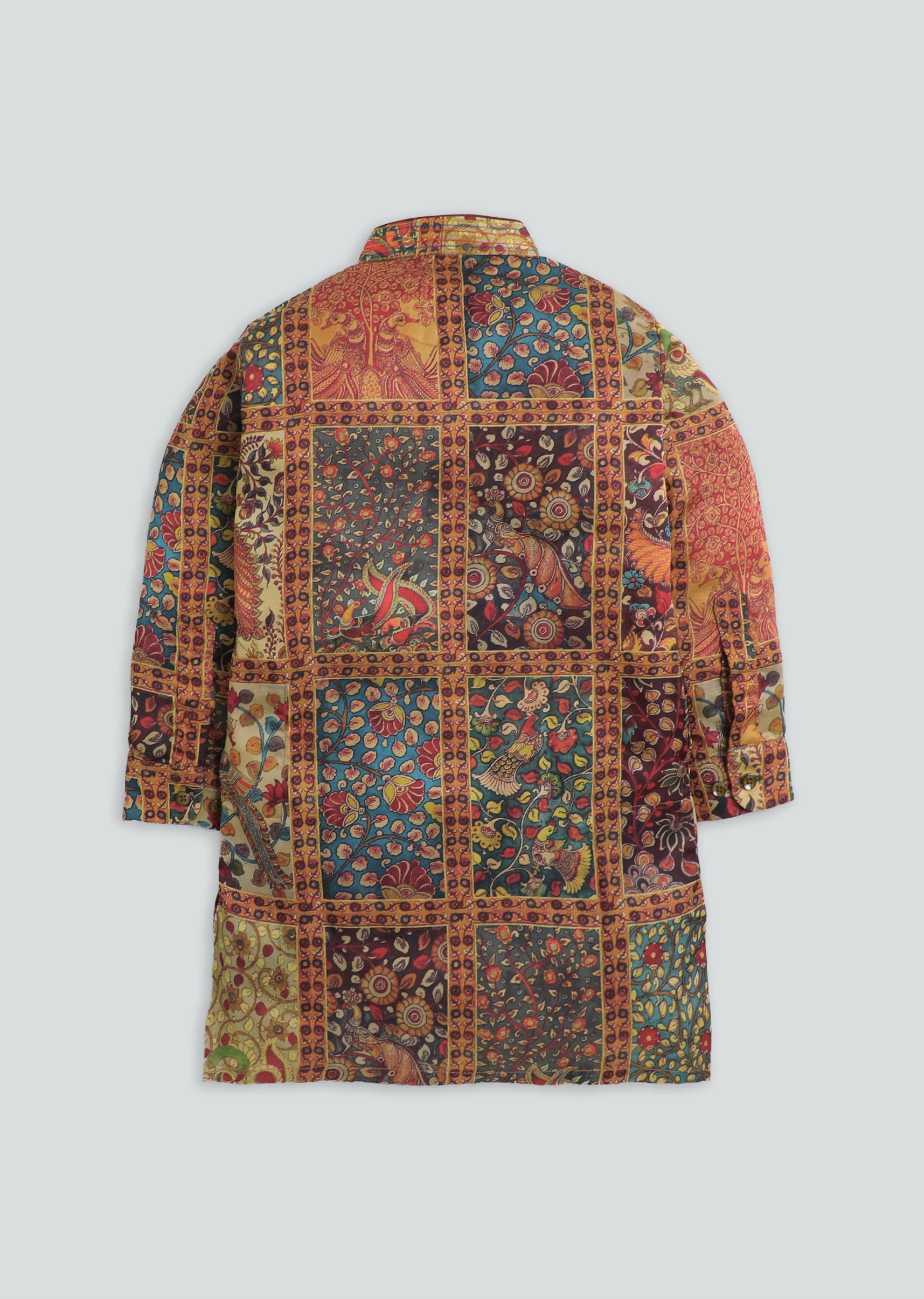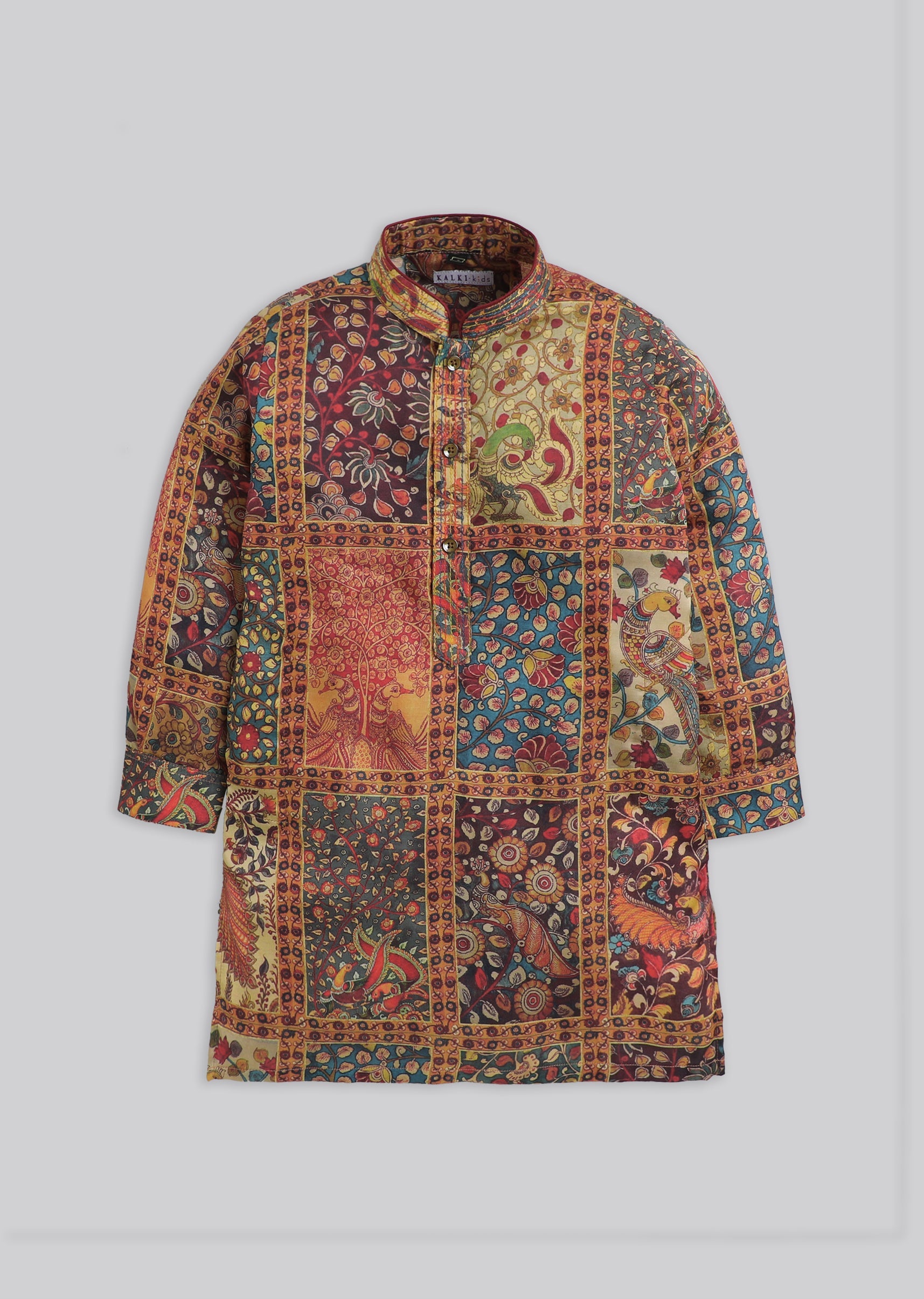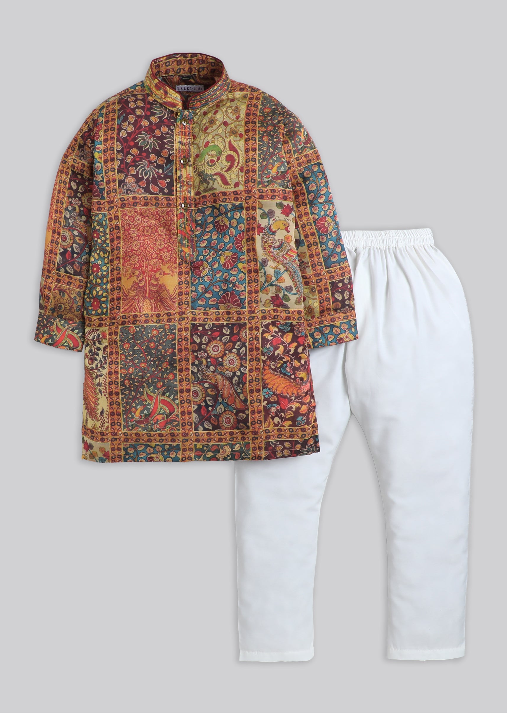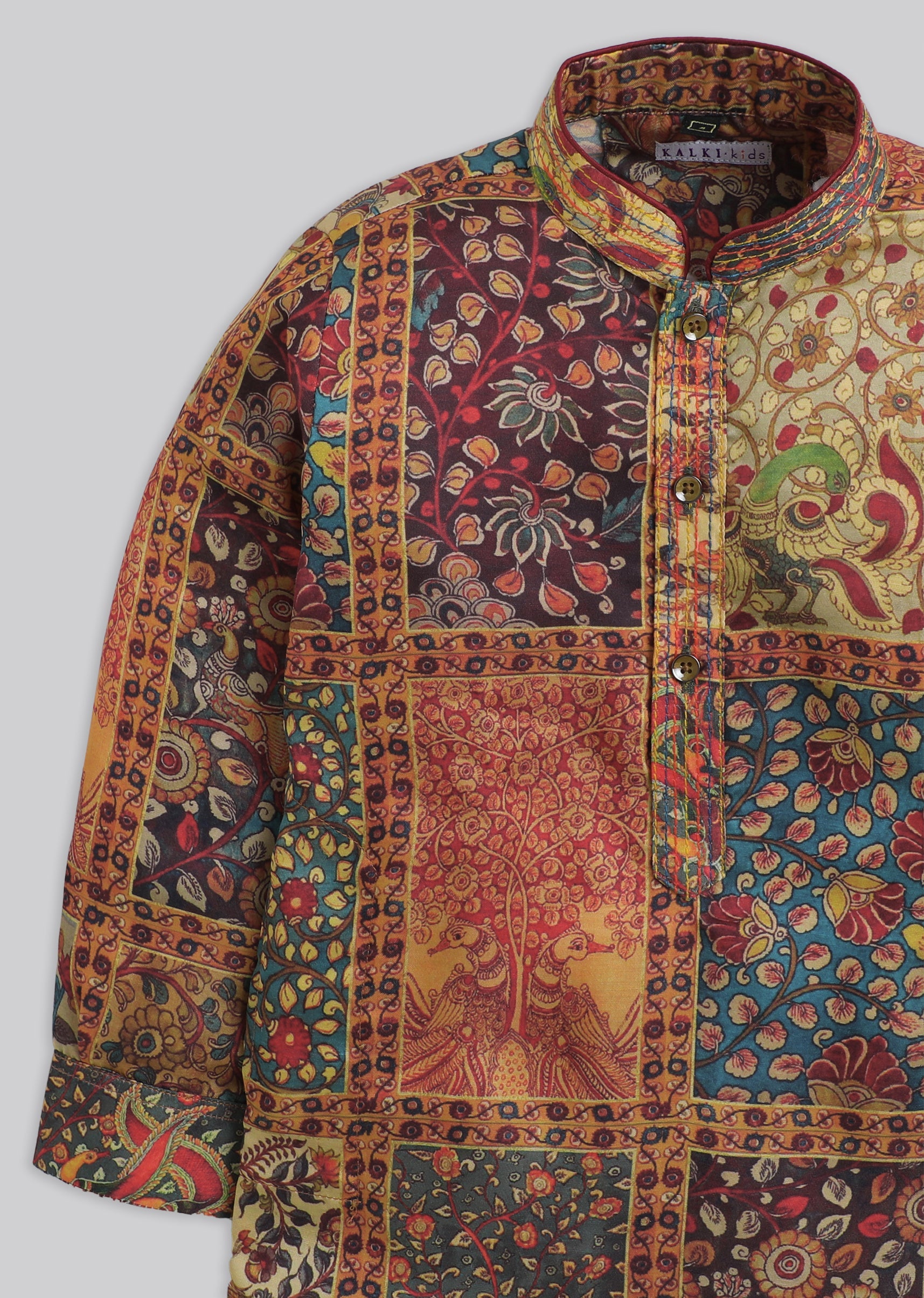 A festive boys’ kurta set in a vibrant multi print with paisley-floral motifs, crafted in soft silk and finished with a mandarin collar and front buttons. Comes with matching pants—perfect... More Product Details
