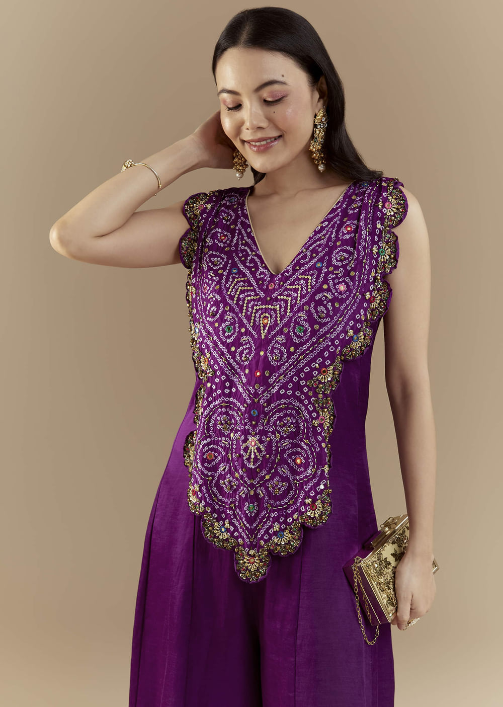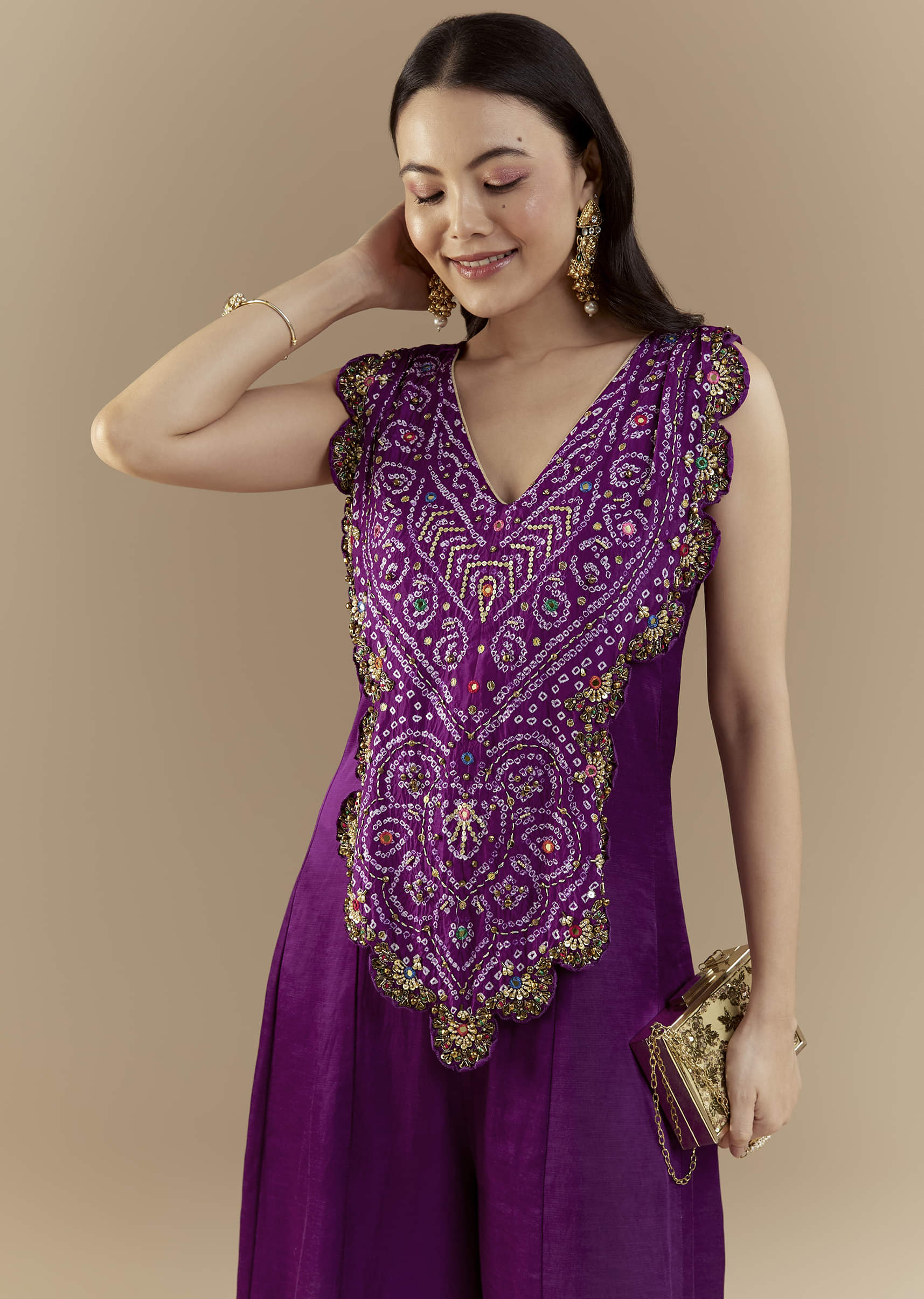 Purple Bandhani with Sequins Work Silk Jumpsuit