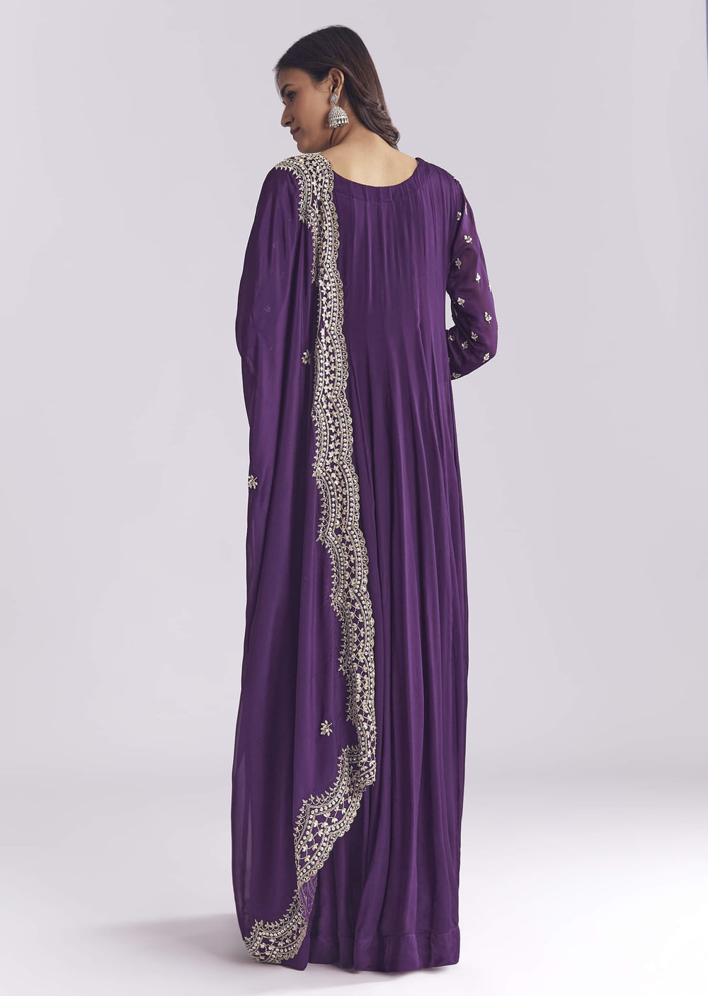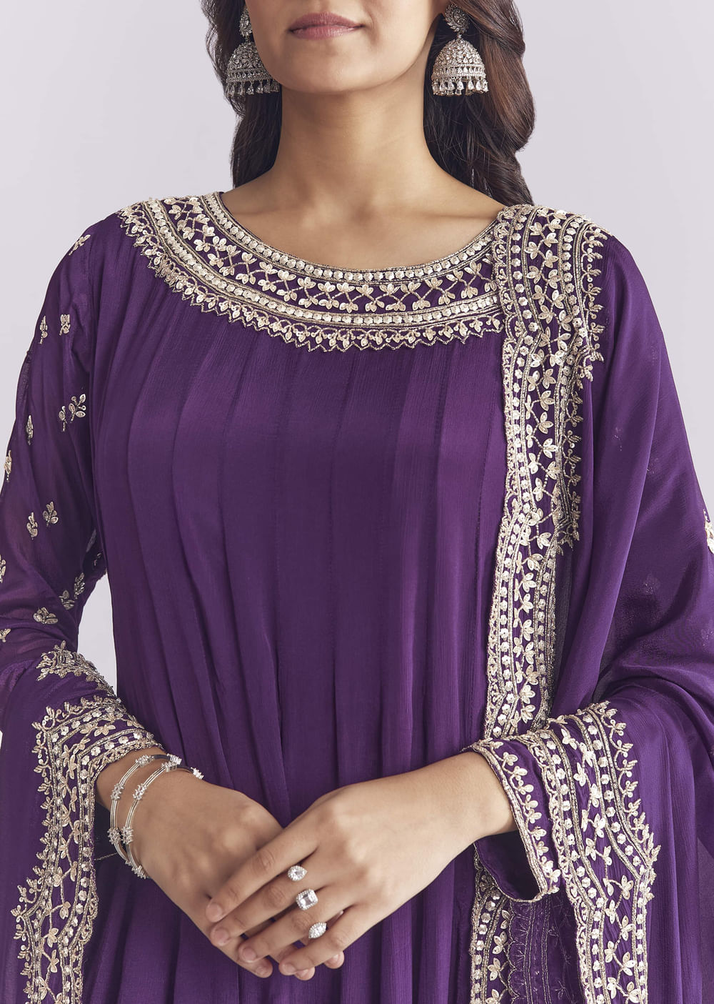 Purple Chinon Anarkali Suit With Cutdana And Sequins Work