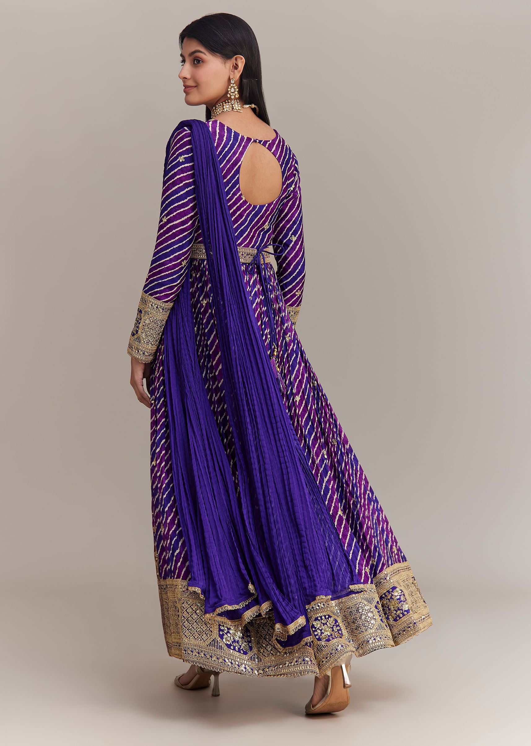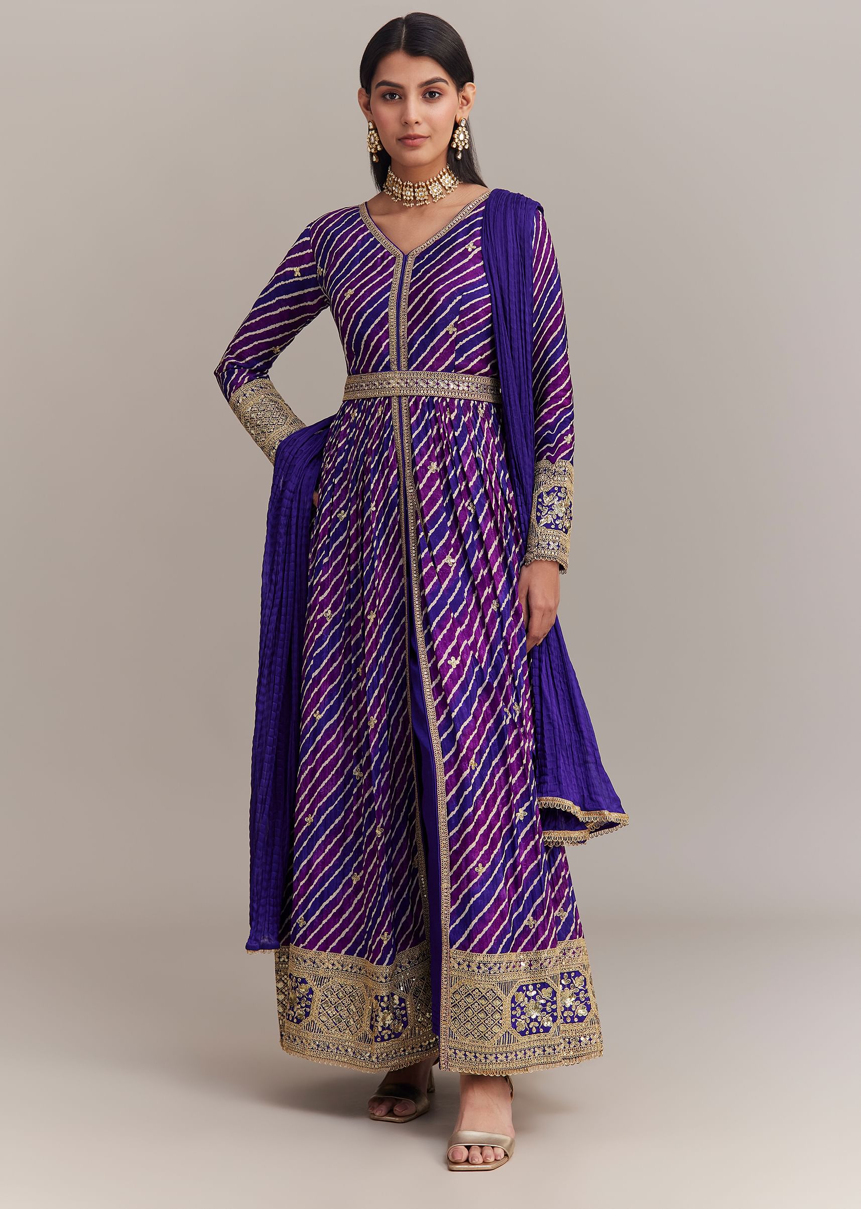 Purple Chinon Leheriya Embroidered Anarkali Set