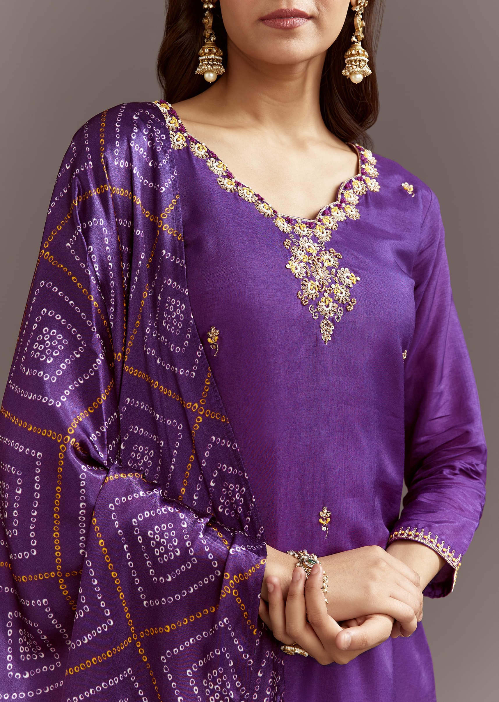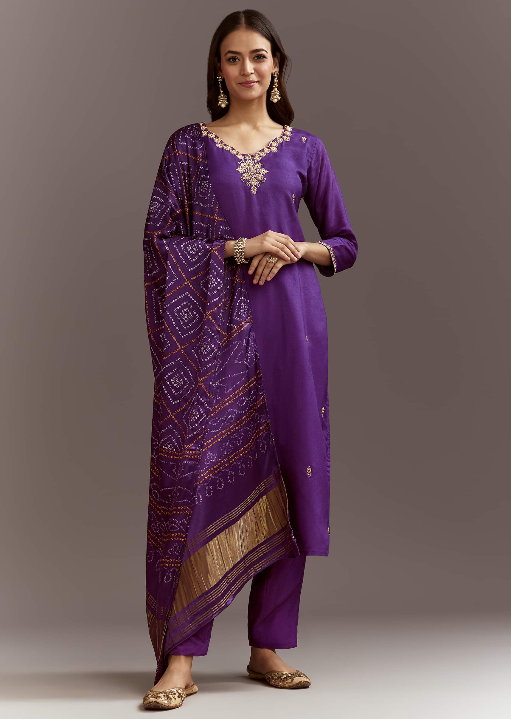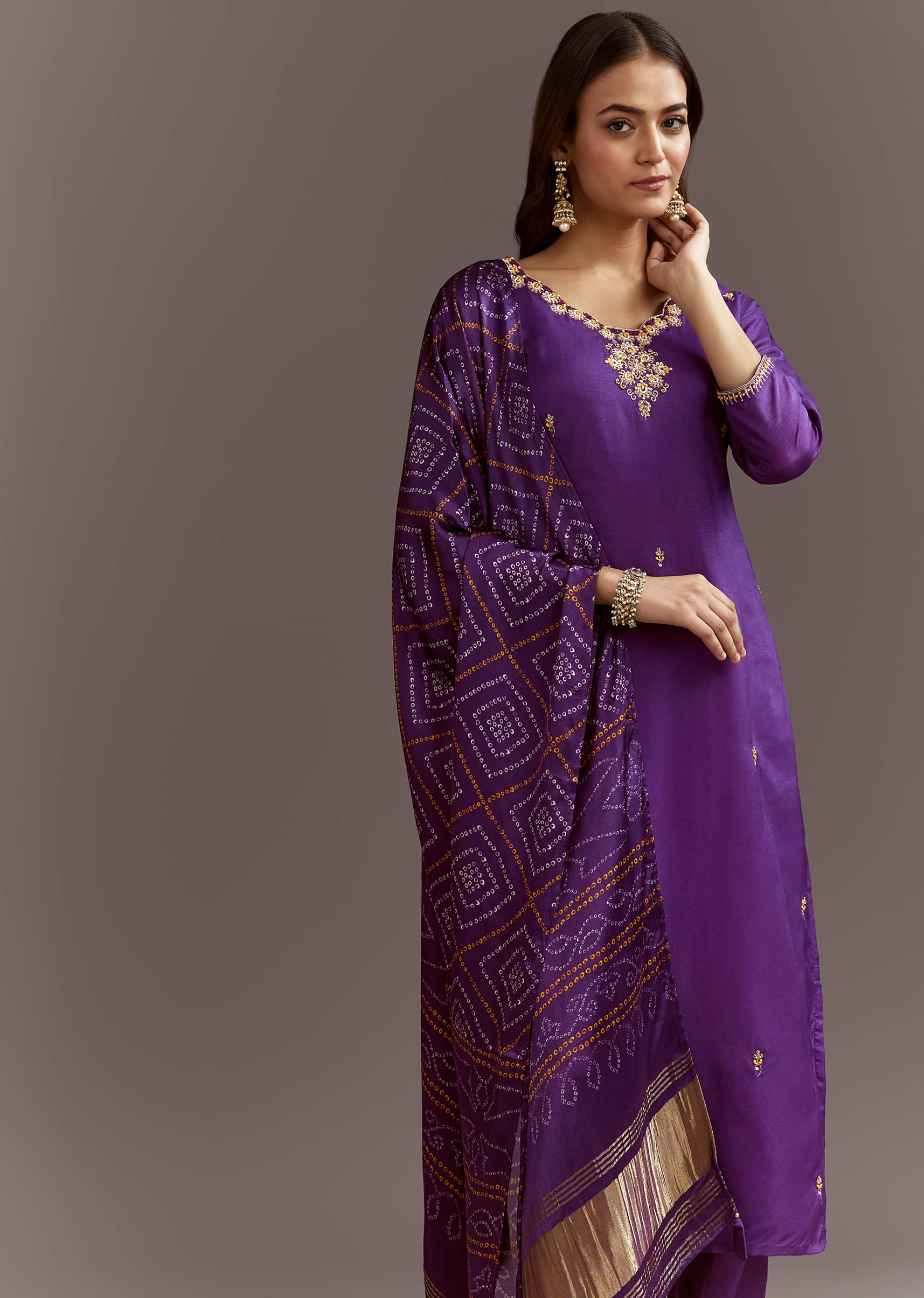 This elegant purple kurta features moti and sequins work, styled with a bandhani print satin dupatta for a pooja ready ensemble.Awarded as the Most Trusted Brand, we're delivering styles you... More Product Details