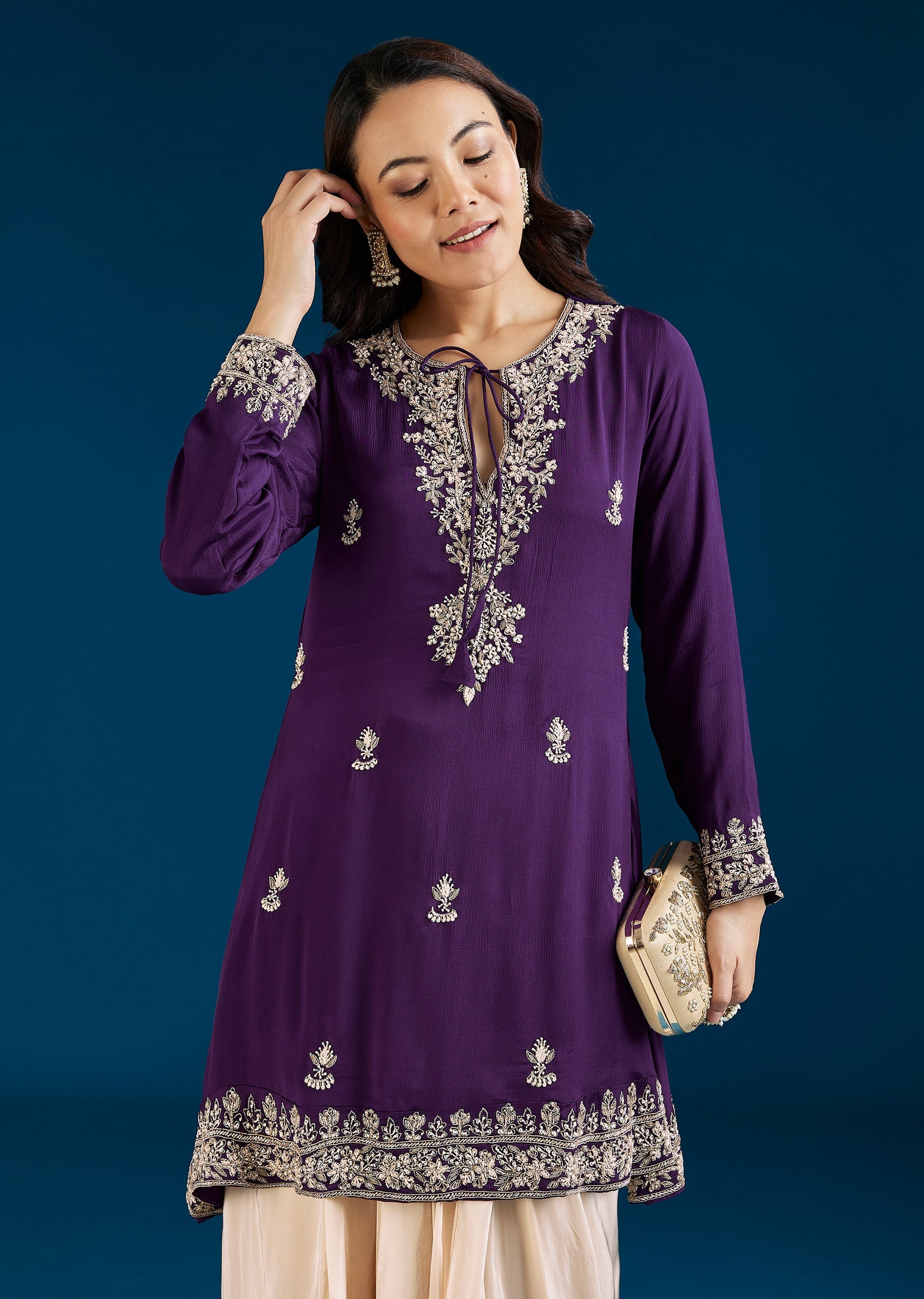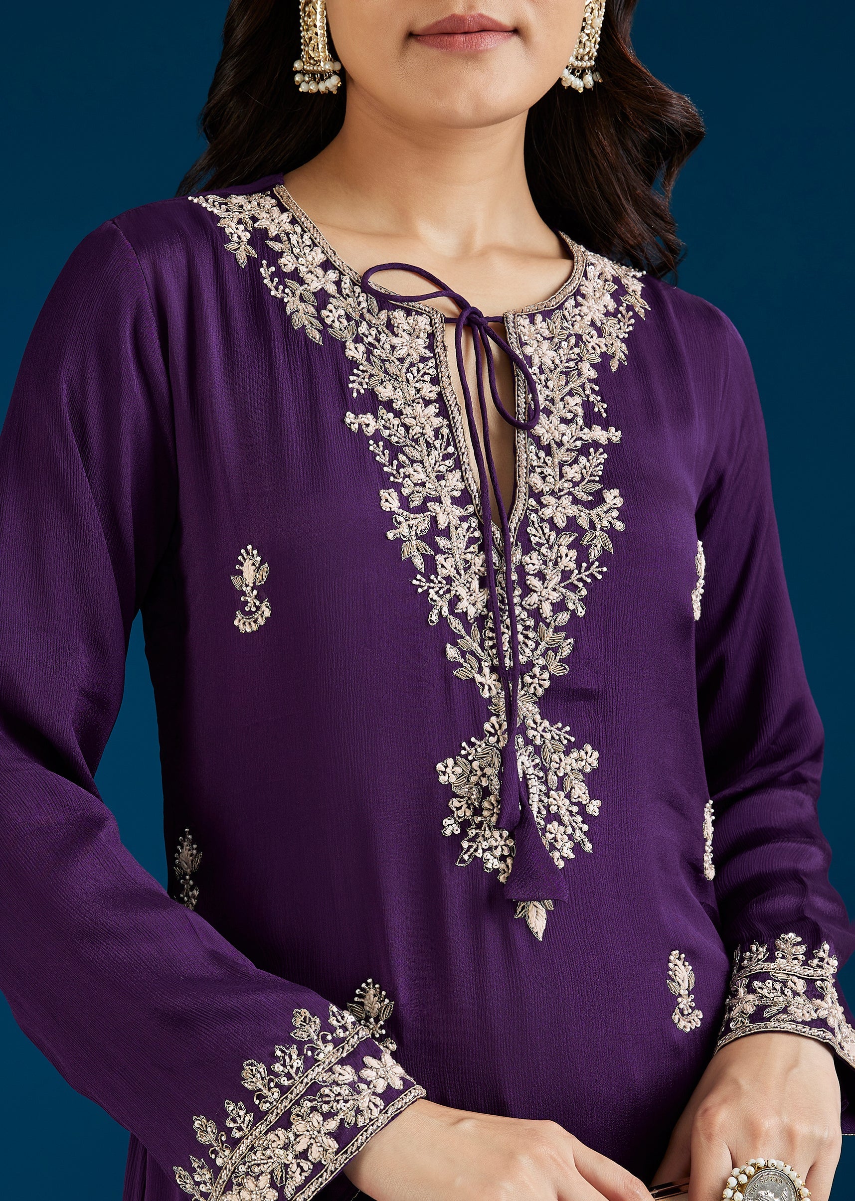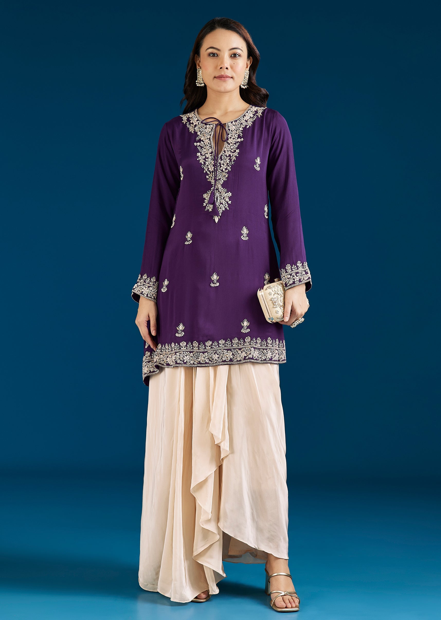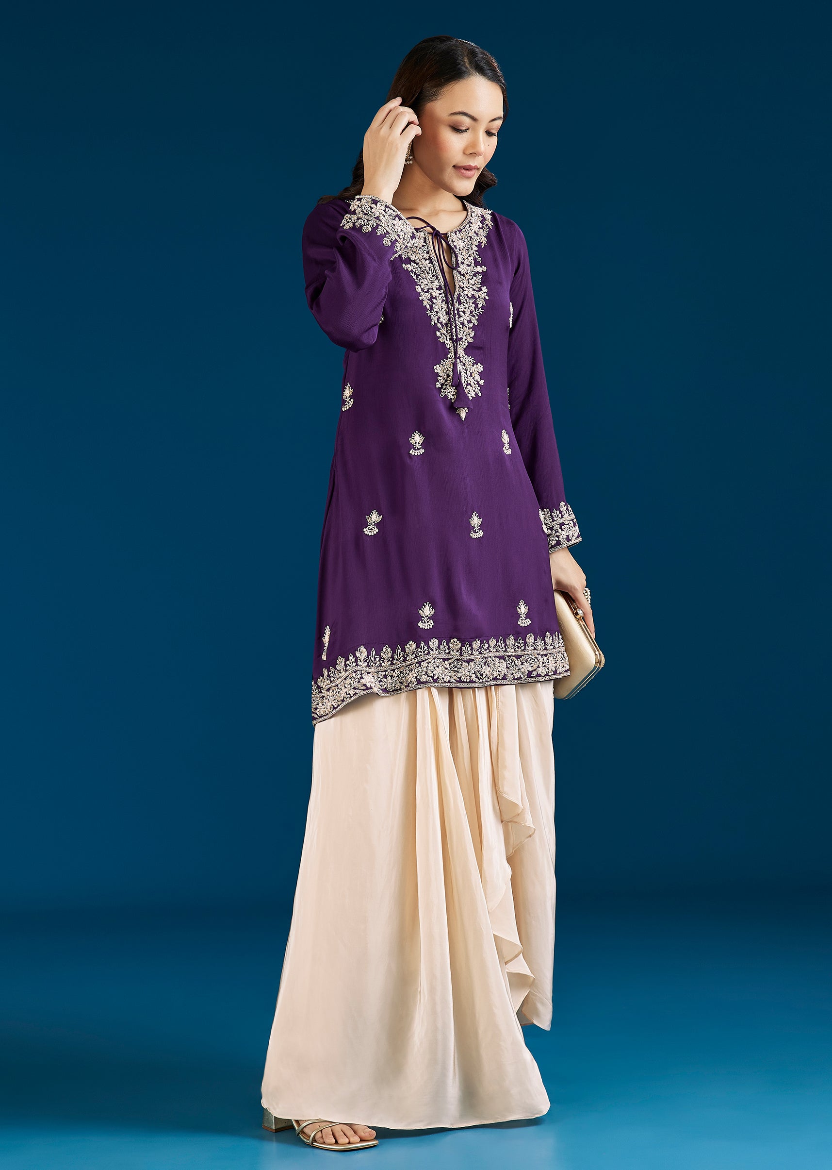 A modern purple Indo Western set featuring a kurta with moti and cut dana work, paired with a drape skirt. Designed with a contemporary silhouette, it is perfect for festive celebrations and statement styling. Awarded as the Most Trusted Brand, we're delivering styles you love, just as promised.