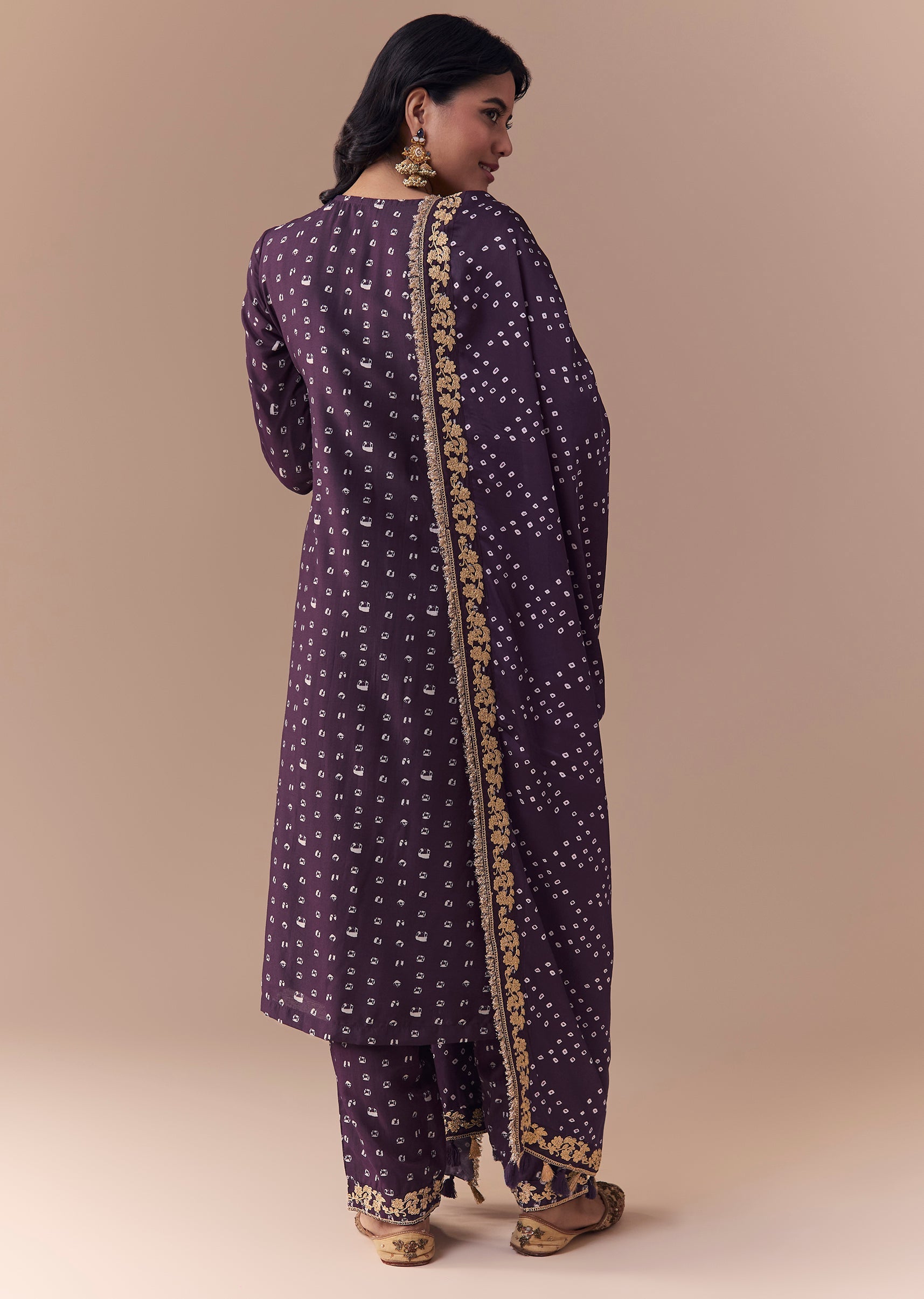 Shimmering zari work enhances the bandhani print, creating a purple kurta that glows beautifully for festive occasions. The silk pant and dupatta add luxurious depth, making it ideal for celebrations... More Product Details