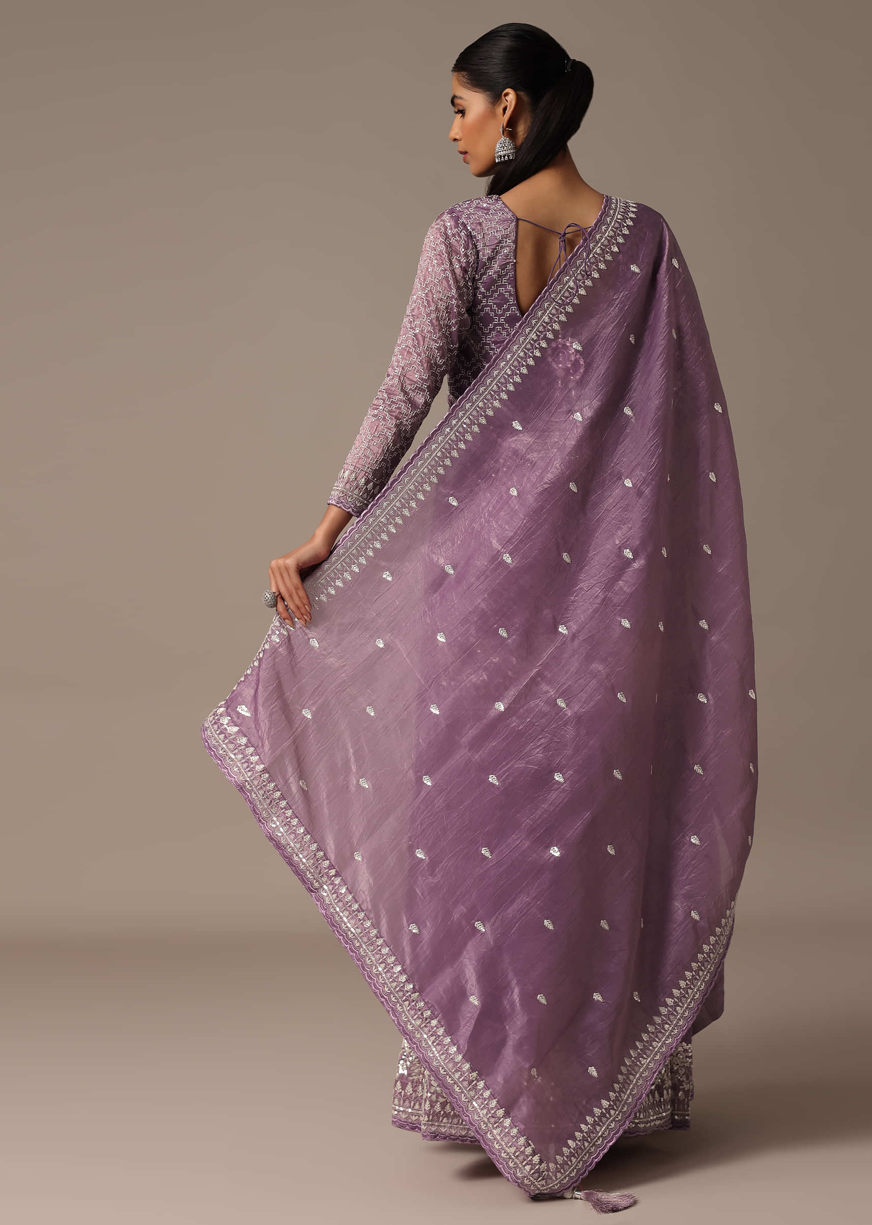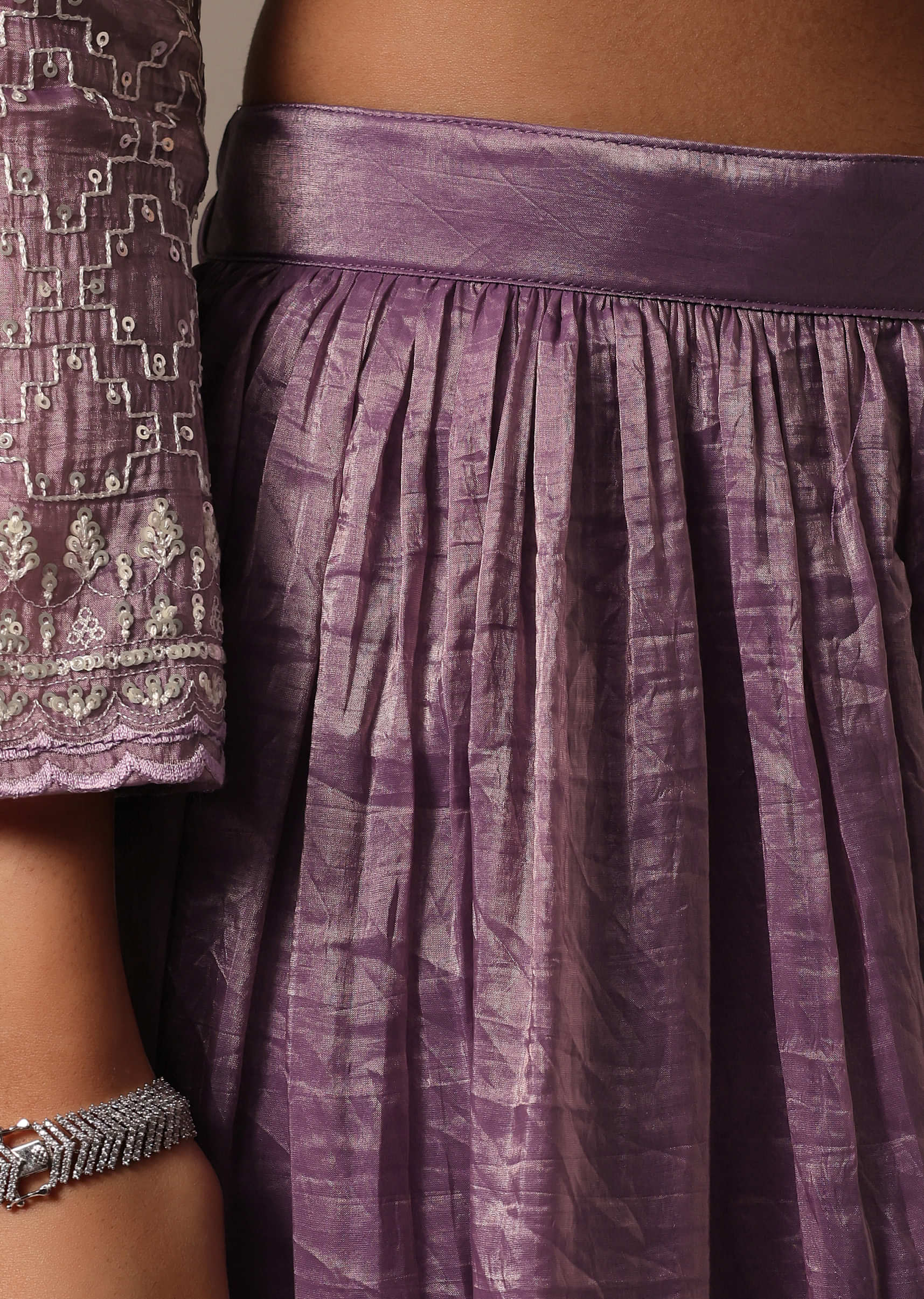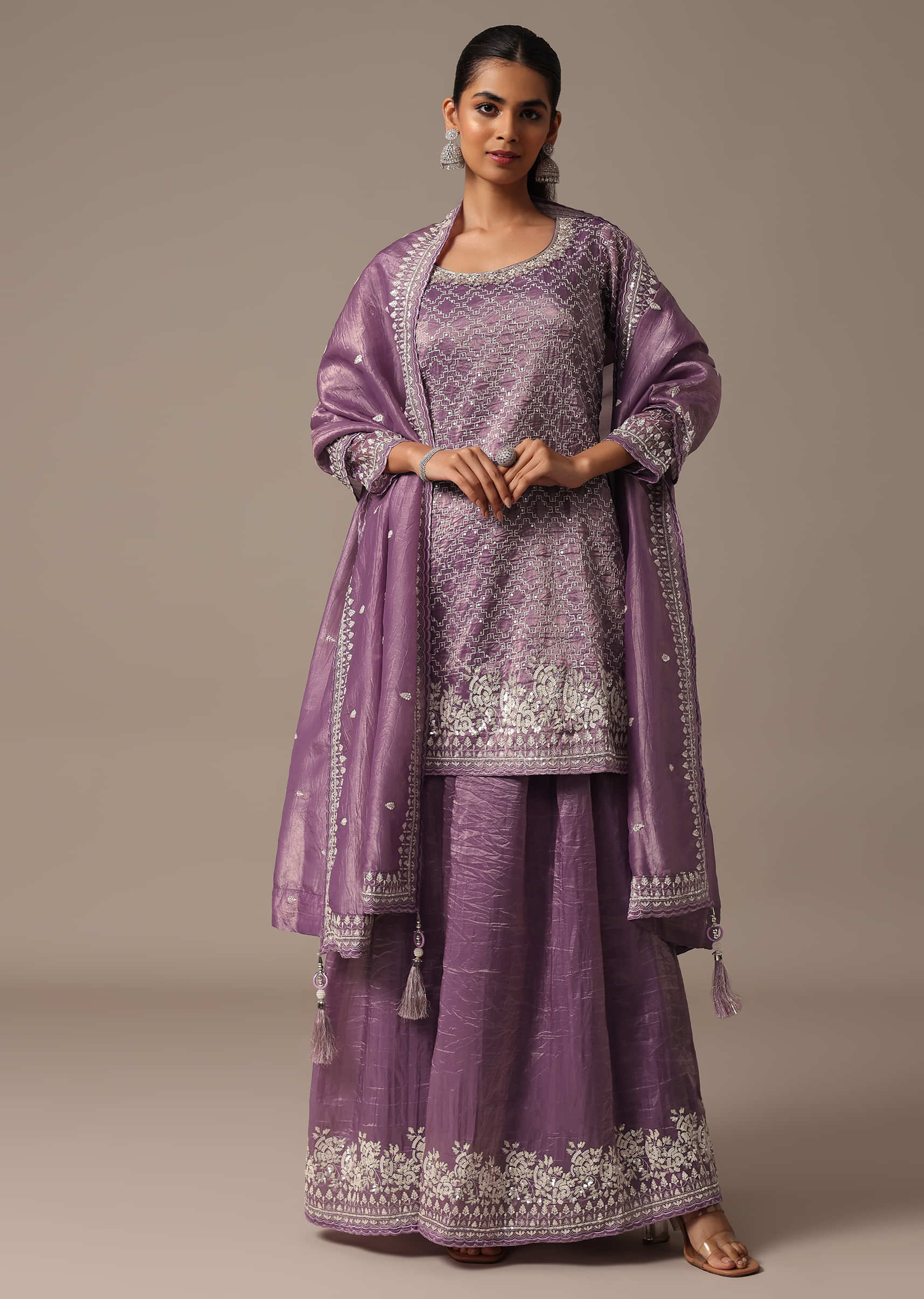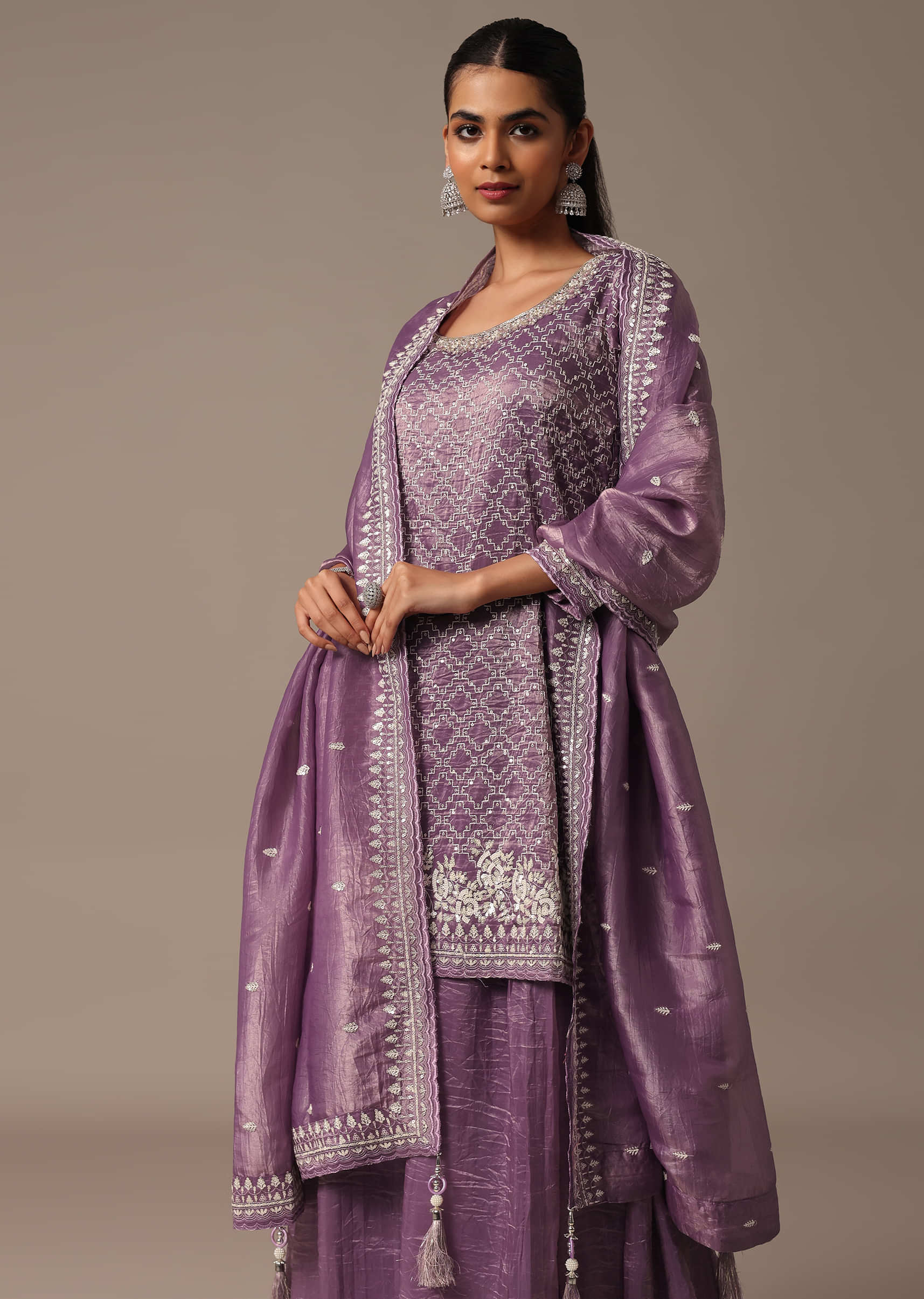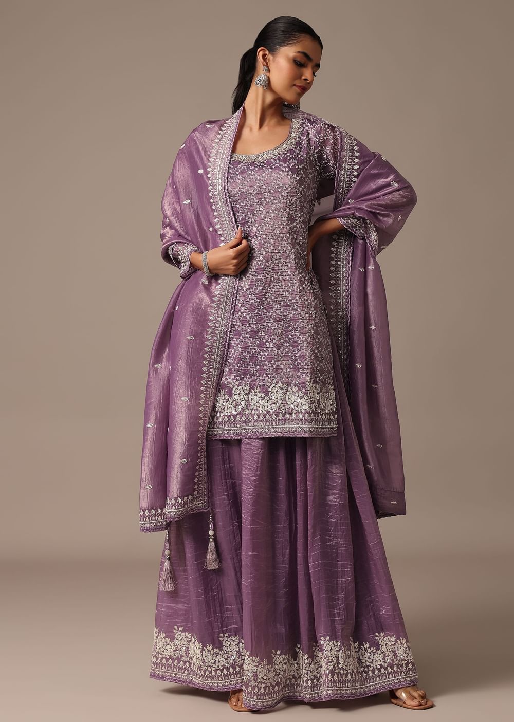 • Our purple embroidered kurta and palazzo set shimmers with regal elegance.