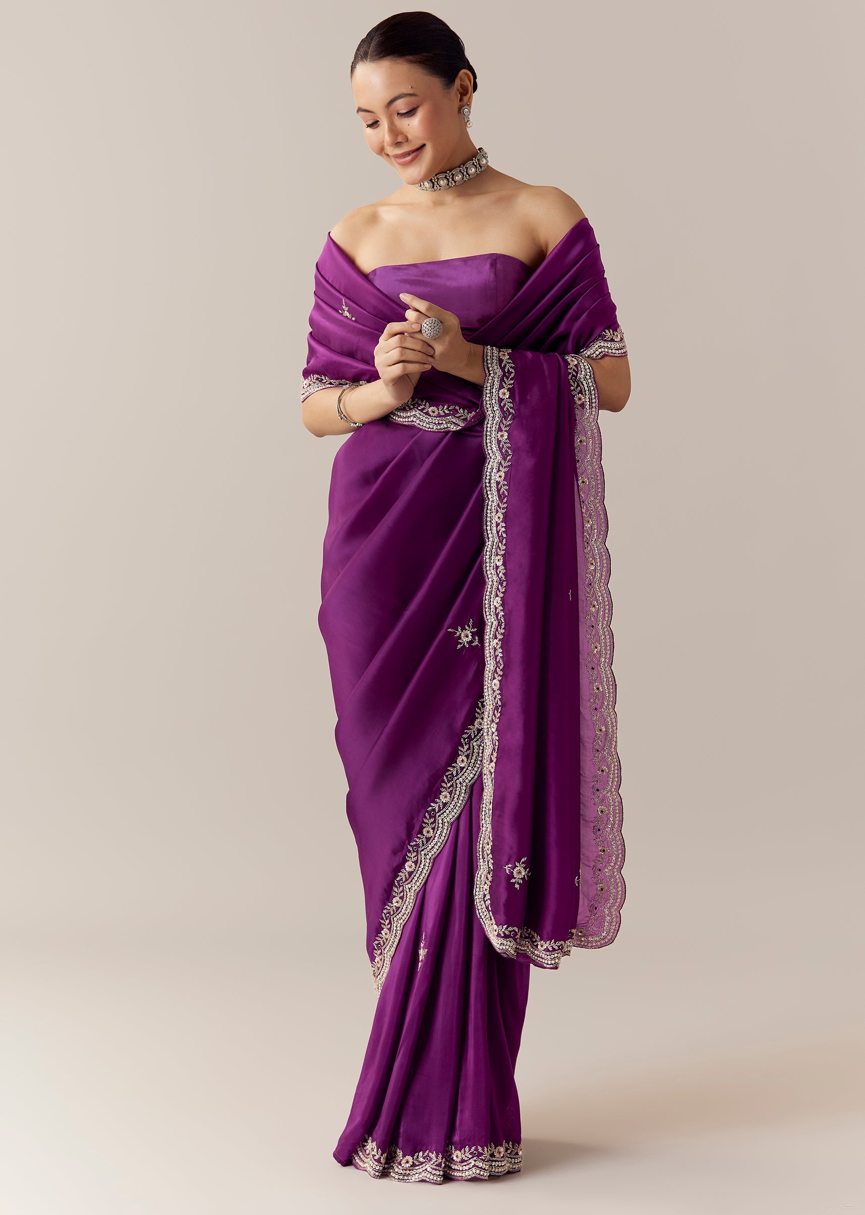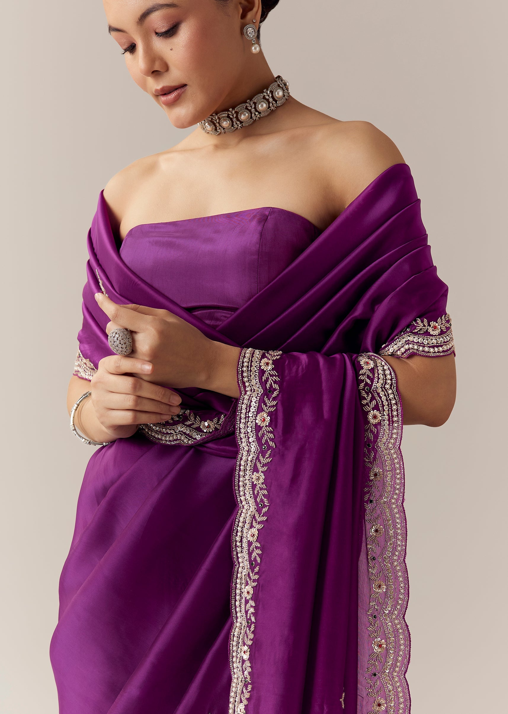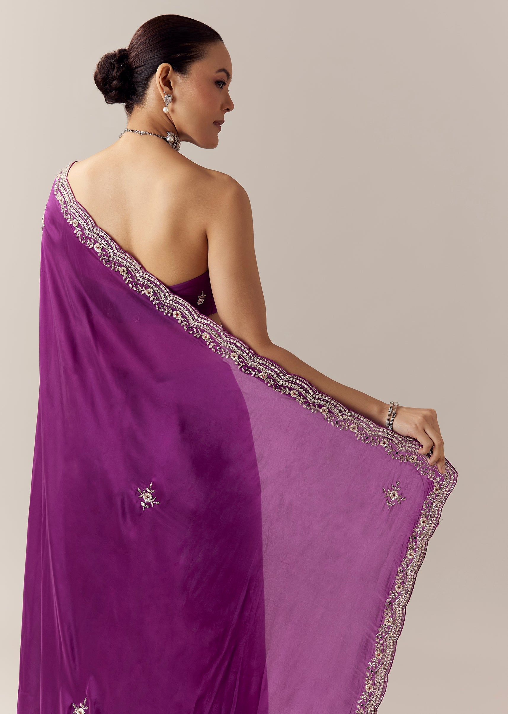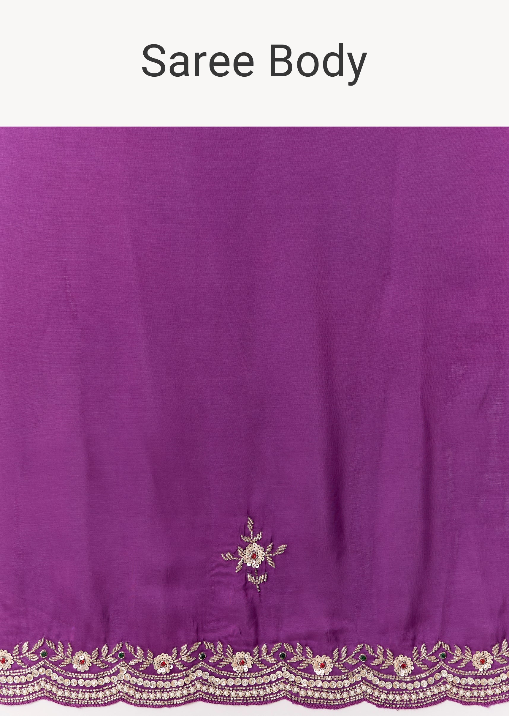 Purple Embroidered Silk Crepe Saree with Unstitched Blouse