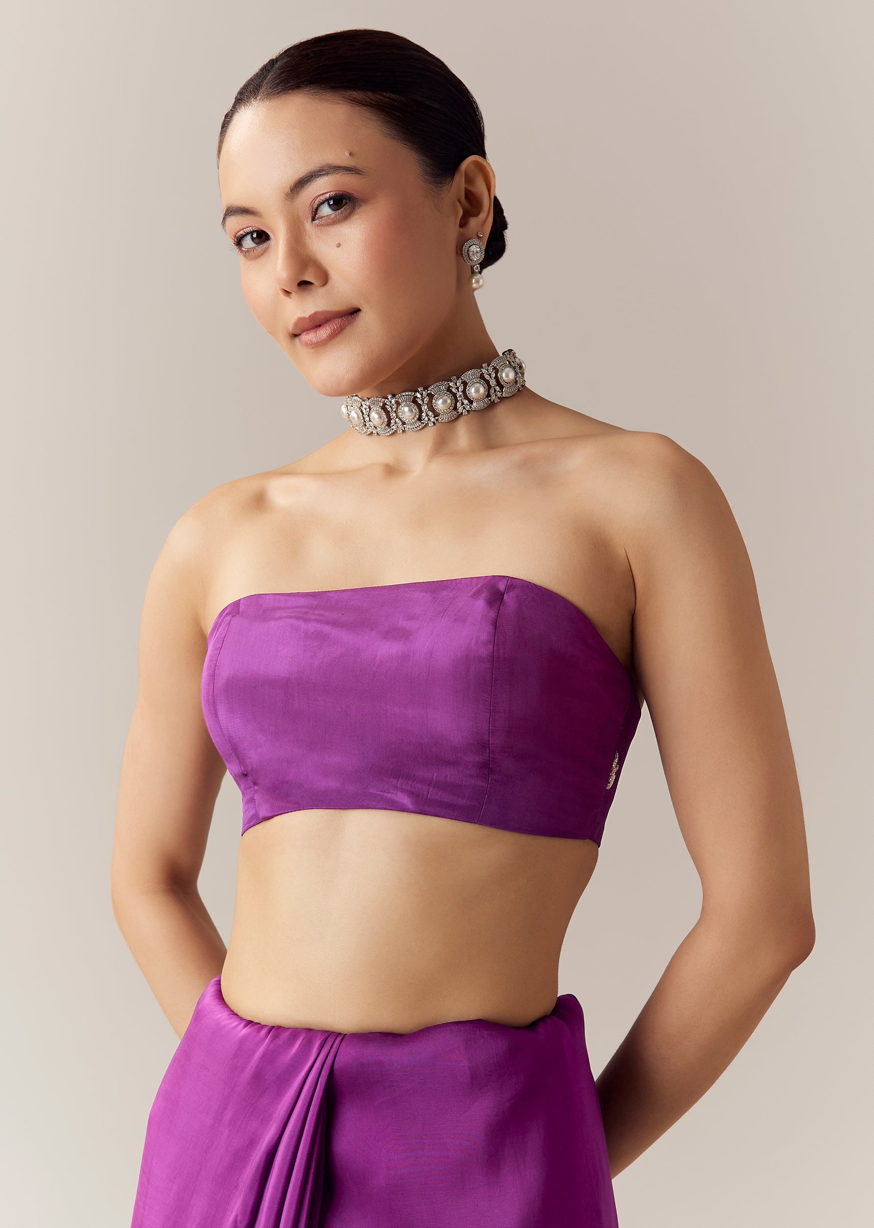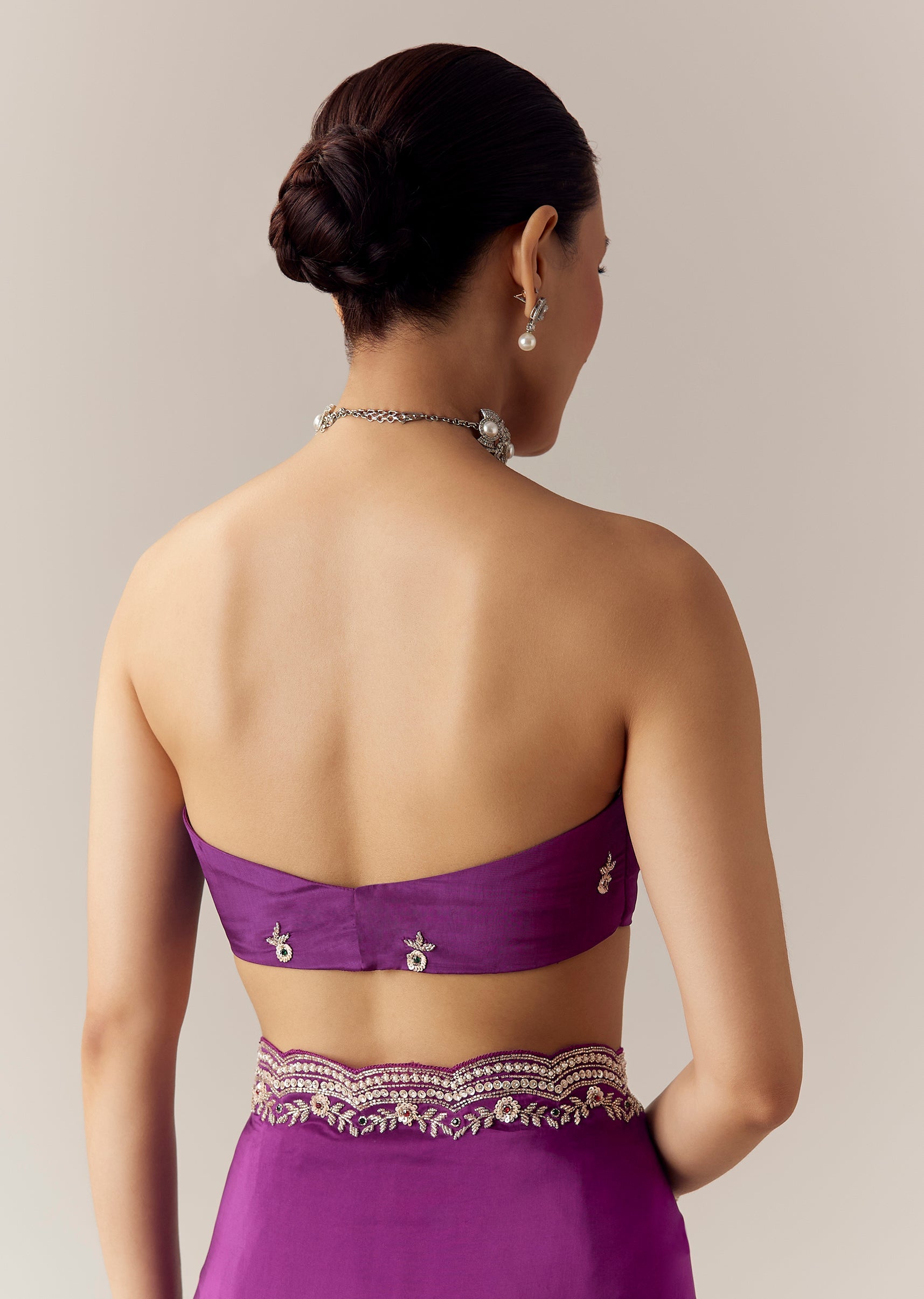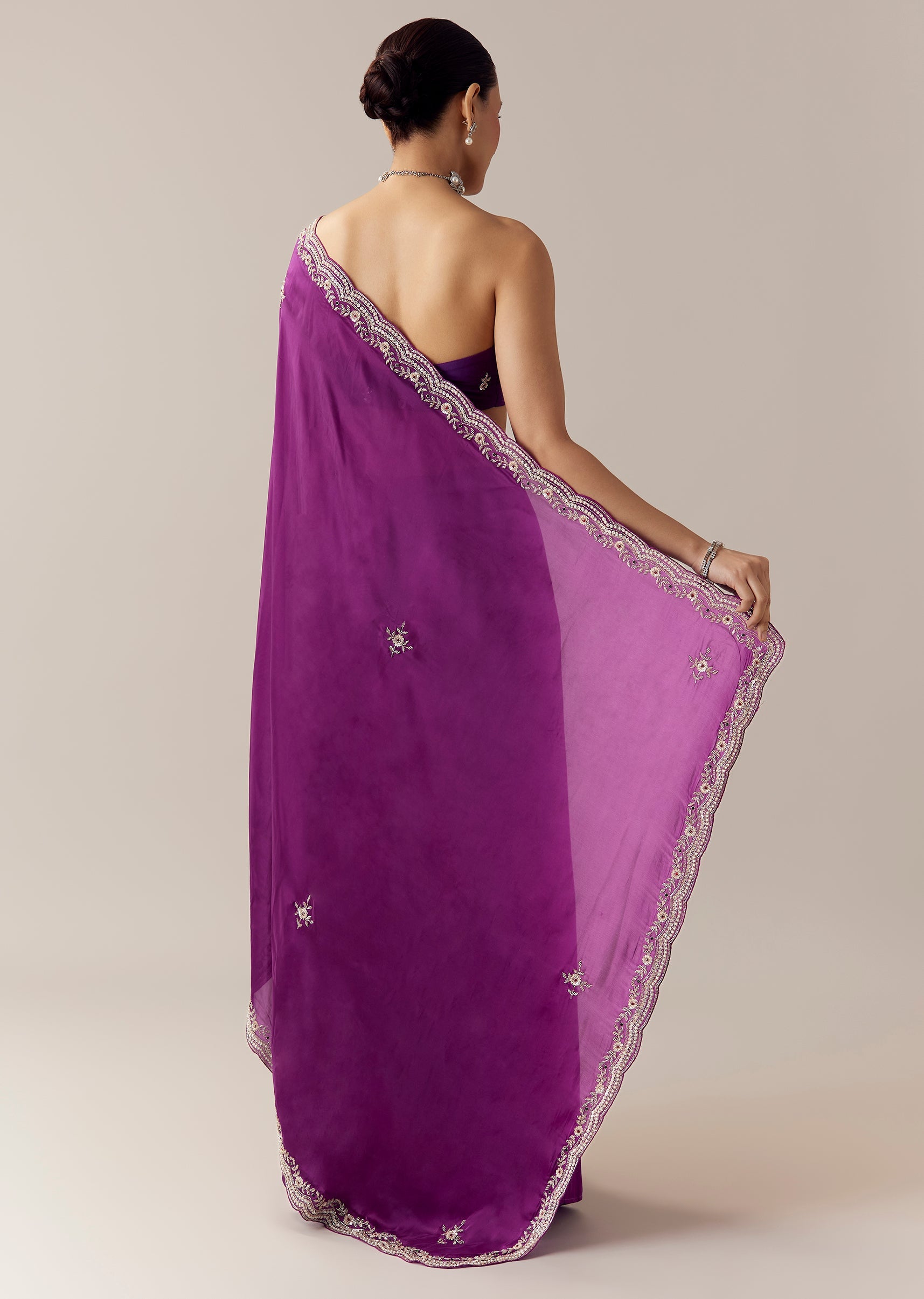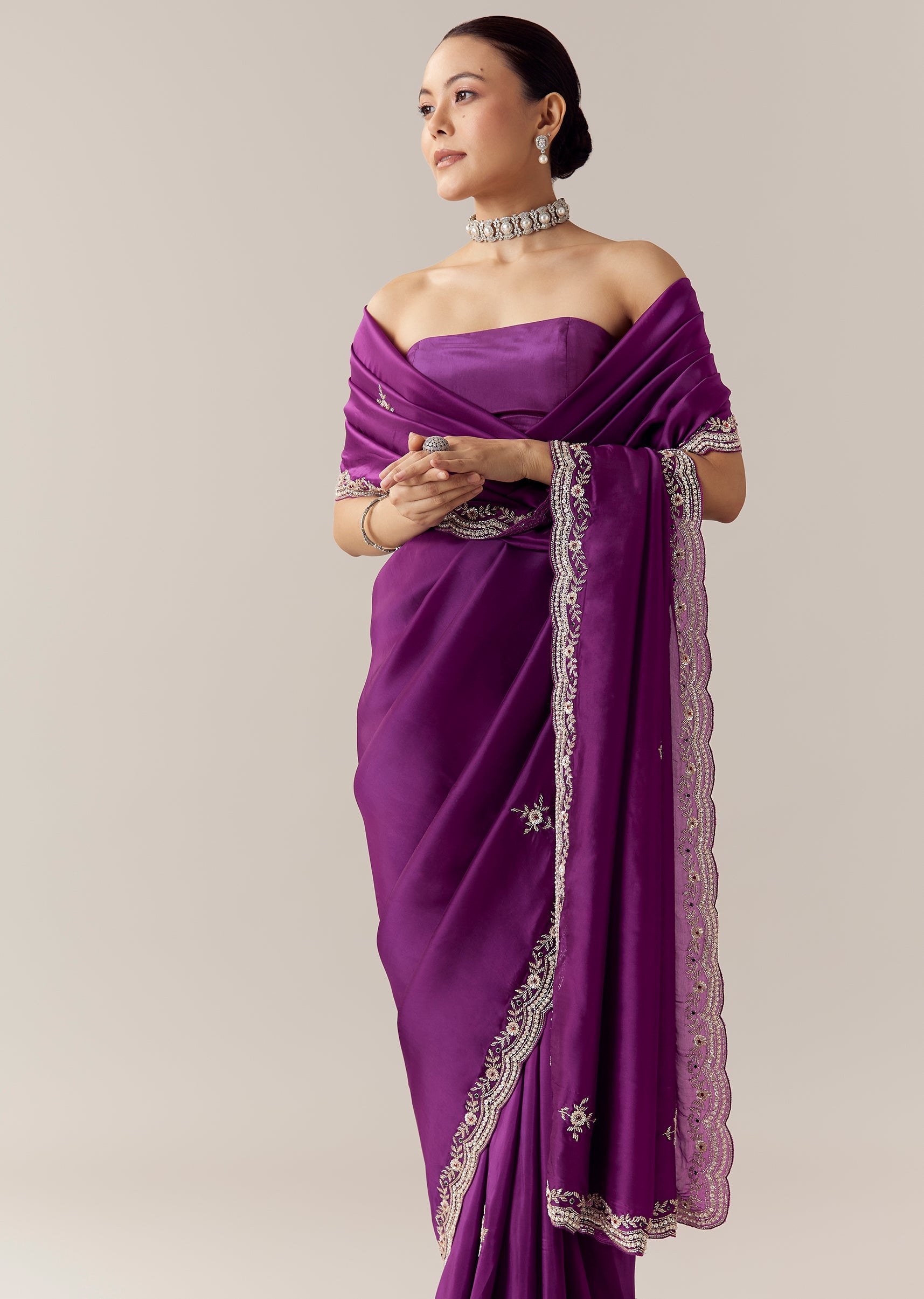 Purple Embroidered Silk Crepe Saree with Unstitched Blouse