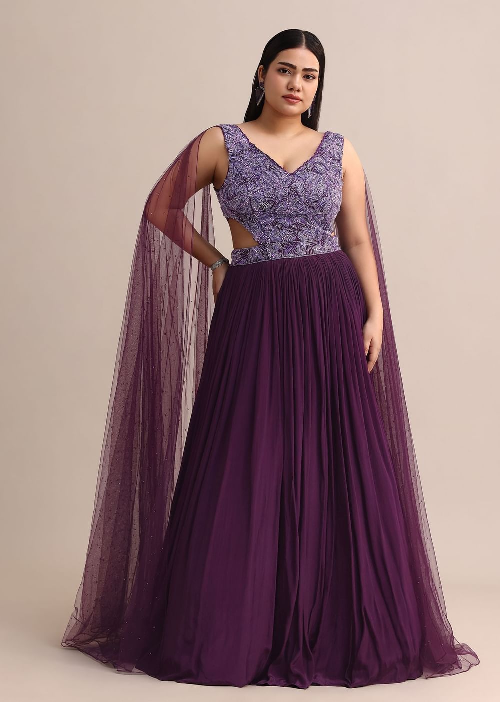 Step into a dreamscape with this enchanting purple embroidered gown, adorned with an ethereal net cape that exudes regal elegance. Made from luxurious raw silk, the gown offers a rich texture that beautifully complements the intricate embroidery. Perfect for grand occasions like weddings, receptions, or glamorous evening soirées, this gown ensures you will make a statement with its captivating design and opulent allure. Awarded as the Most Trusted Brand, we're delivering styles you love, just as promised.
