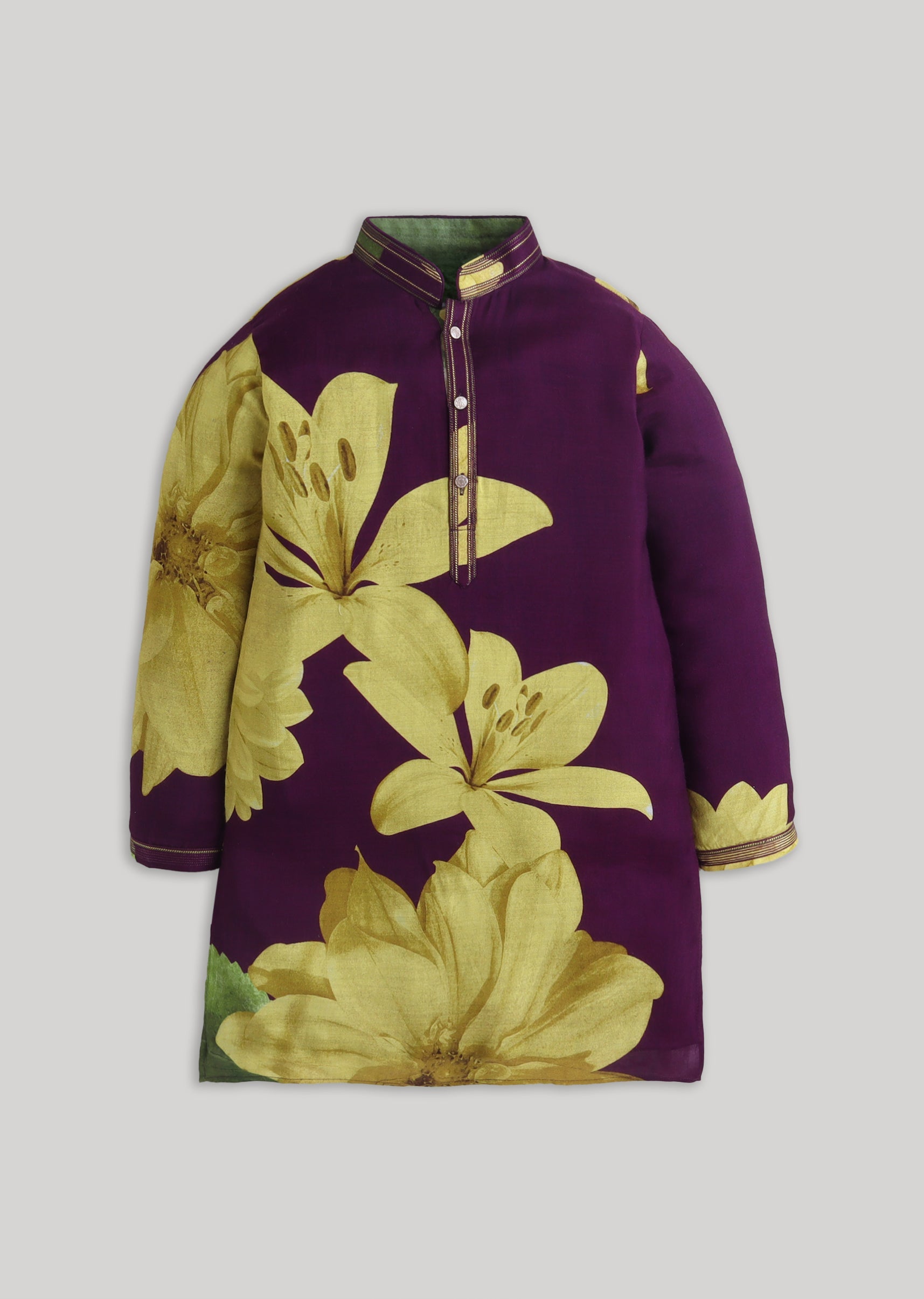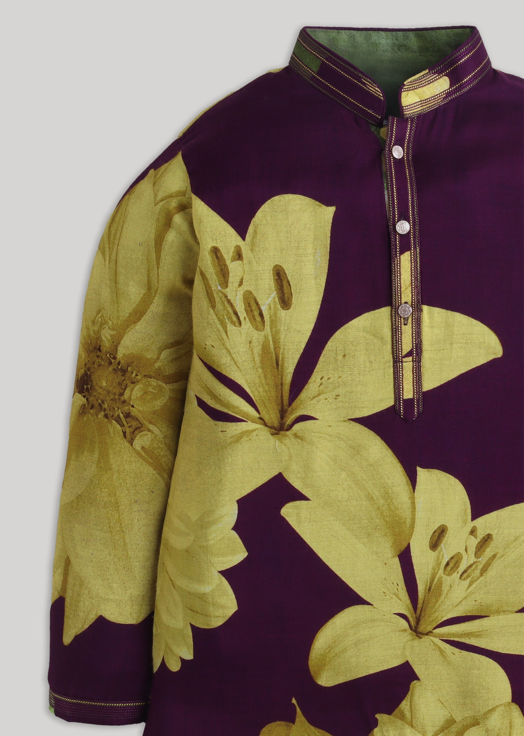 Add a vibrant festive touch to his occasion wardrobe with this purple cotton kurta set featuring a lively floral mood and a striking color-pop look. Designed with a mandarin collar,... More Product Details