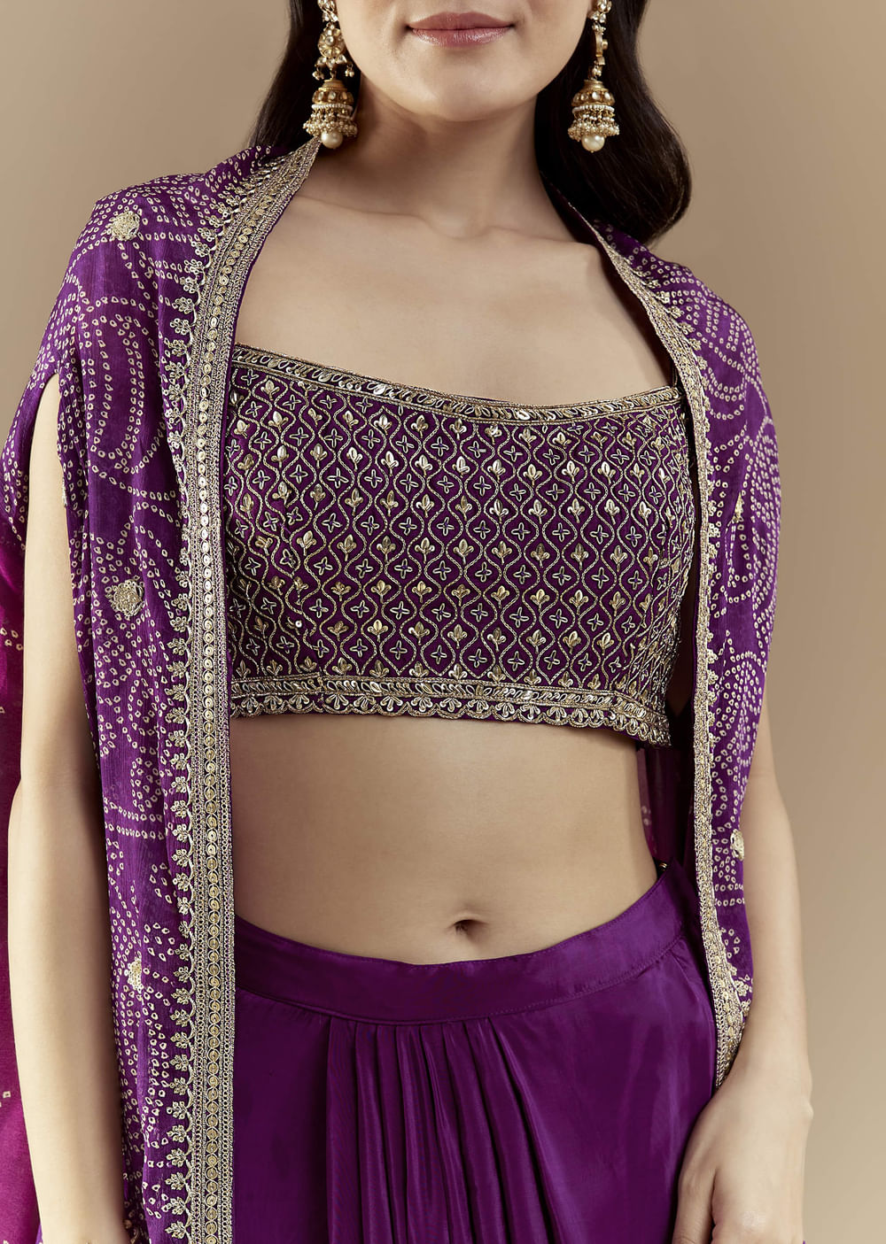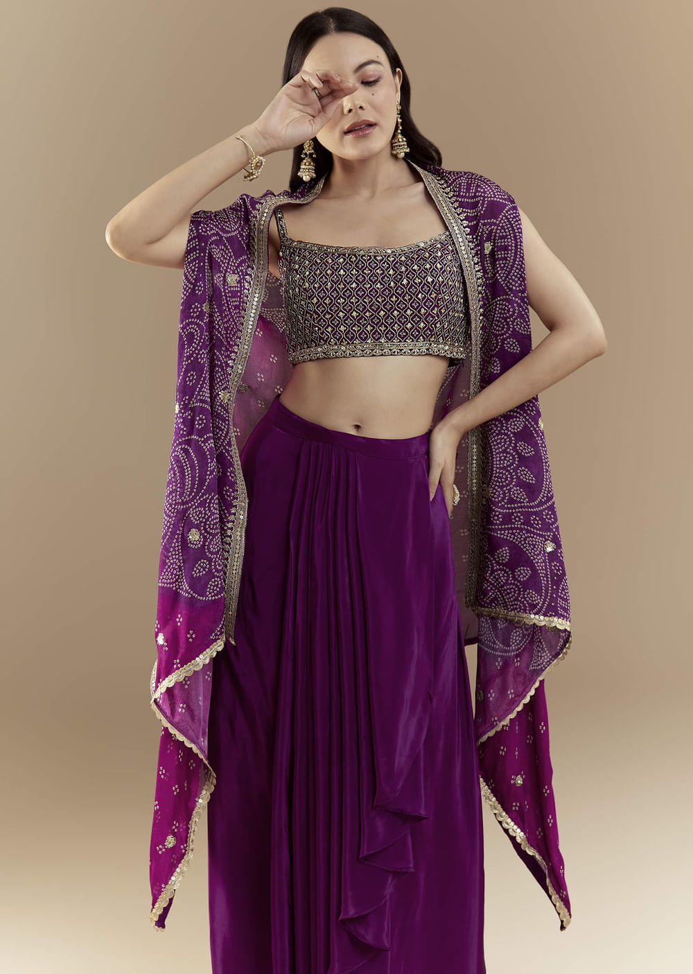 Purple Fusion Crop Top Skirt Set with Bandhani Cape