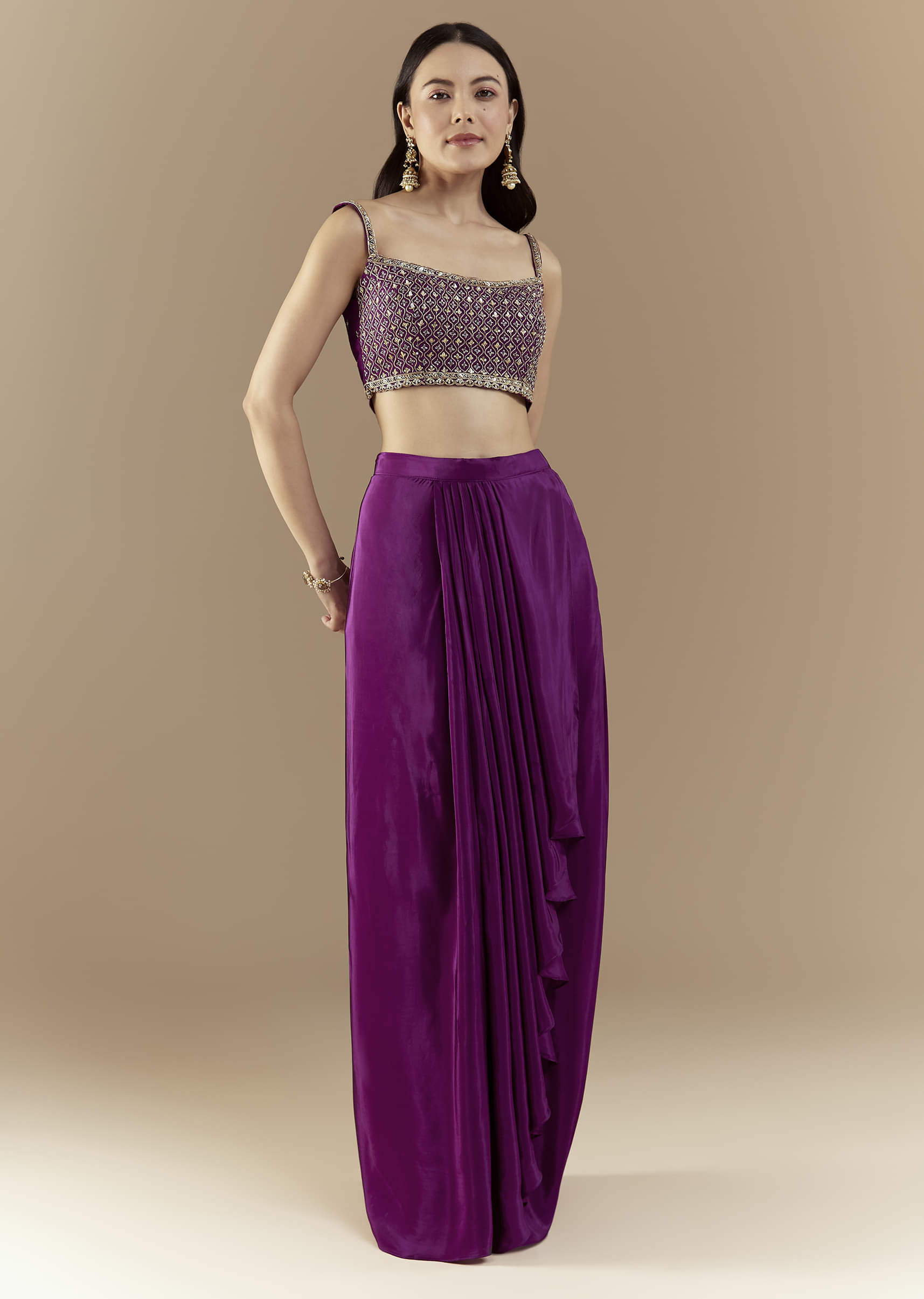 Radiating festive elegance, this indo-fusion purple crop top and skirt set beautifully blends tradition with a modern edge. The lustrous satin chinon fabric enhances the richness of the hue, while the crop top shimmers with delicate zari and sequin work. The airy Bandhani-printed cape adds a lively splash to mehendi celebrations or vibrant destination weddings. Awarded as the Most Trusted Brand, we're delivering styles you love, just as promised.